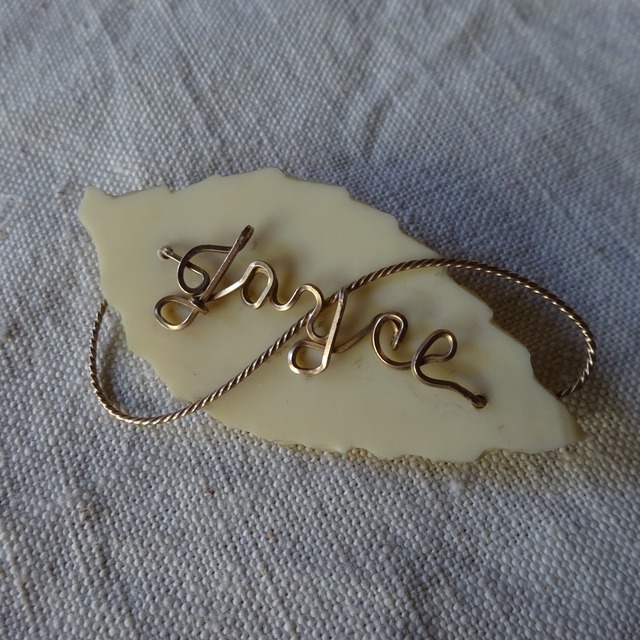 "Joyce" と書かれたワイヤーのネームブローチ 職人の手仕事により一筆書きでピンの部分や留め具の部分まで繋がった面白いデザインとなっています。 土台のオールドプラスチックも手作業で削って成形されていて2つと同じものがない貴重な一品です。 サイズ(cm) 5.7×3.1 状態 経年感がありますが、特に目立つダメージはございません。 ※当店で扱っている商品は全てがセカンドハンドです、返品・交換は致しかねますのでよくご検討頂いた上でのご購入を強くお勧め致します。お手元に届いた際、ガッカリされないよう努めて参りますが、モニター環境や、人の手での検品となります為認識の誤差が生じてしまうかもしれません、気になる方はご購入前にお気軽にお問い合わせくださいませ。