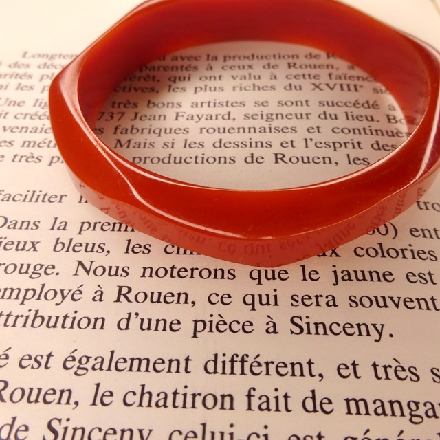 テラコッタのような色合いがなんとも可愛らしい、波なみデザインのベークライトのバングルです。 ベークライトのバングルは重ね付けする方も多く、茶色とも赤とも言えないこの中間色はどんな色合いにもマッチするのでとても本当に使いやすくて飽きのこない一品 もちろん単体でつけてもアクセントになり、ヴィンテージスタイル以外にも合わせやすいデザインです。 1枚目の写真のみ蛍光灯、その他は自然光です サイズ(cm) 内径: 6.5 幅: 1 状態 特に目立つダメージはございません。 ※当店で扱っている商品は全てがセカンドハンドです、返品・交換は致しかねますのでよくご検討頂いた上でのご購入を強くお勧め致します。お手元に届いた際、ガッカリされないよう努めて参りますが、モニター環境や、人の手での検品となります為認識の誤差が生じてしまうかもしれません、気になる方はご購入前にお気軽にお問い合わせくださいませ。