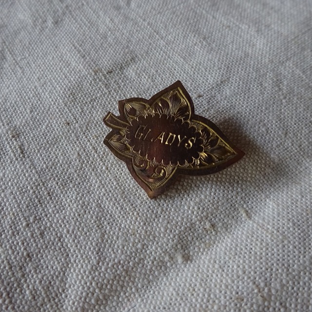 "GLADYS" と刻印された真鍮のブローチ 楓のような葉っぱに美しい柄の彫り込みは男性でも女性でも着けられるユニセックスなデザインです。 胸元につけたり、帽子やストール、ネクタイなど色々な楽しみ方ができる一品です。 サイズ(cm) 3×2.5 状態 特にダメージはございません。 ※当店で扱っている商品は全てがセカンドハンドです、返品・交換は致しかねますのでよくご検討頂いた上でのご購入を強くお勧め致します。お手元に届いた際、ガッカリされないよう努めて参りますが、モニター環境や、人の手での検品となります為認識の誤差が生じてしまうかもしれません、気になる方はご購入前にお気軽にお問い合わせくださいませ。