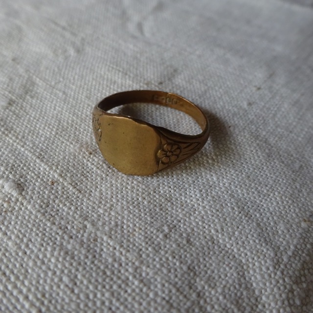 サイドにお花が彫り込まれている真鍮のシグネットリング こちらはメンズサイズです イニシャル等の彫り込みがないタイプでコーディネートしやすい一品です。 内側に何かスタンプが推してありますが判別不能です。 着画は女性です。 サイズ(cm) 19号 内径:1.9 モチーフ幅: 1 状態 特に目立つダメージはございません。 ※当店で扱っている商品は全てがセカンドハンドです、返品・交換は致しかねますのでよくご検討頂いた上でのご購入を強くお勧め致します。お手元に届いた際、ガッカリされないよう努めて参りますが、モニター環境や、人の手での検品となります為認識の誤差が生じてしまうかもしれません、気になる方はご購入前にお気軽にお問い合わせくださいませ。