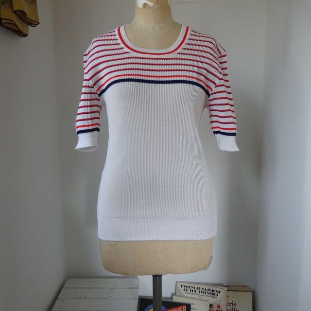 ヨーロッパの夏といえば乾燥していて日陰は涼しく、夏でもニットを快適に着れるので今の時代でも変わらずサマーセーターが大人気です。 日本では湿度があり毛糸だと真夏に着れない難点がありますが、こちらは涼しい架線でとても立体的なリブ構造になっているのでベタッとならずに着やすい一枚です。 春先にはカーディガンやライトアウターに合わせても良いのでサマーセーターの中でも長めに着れるタイプです。 なんといってもトリコロールというところがポイント高め! サイズ(cm 平置き 着用者163(cm Mサイズ程度) 肩幅: 40 身幅: 41×2 袖丈: 27 着丈: 57 状態 首周りに薄く汚れがあります その他致命的なダメージはございません。 ※ 当店の商品は全てセカンドハンドの為、お客様都合での返品・交換は致しかねますのでよくご検討頂いた上でご購入ください。 店頭でお買い物する時のように安心してご購入頂けますよう、ご不安な点がある場合はできる限り迅速・丁寧にお答え致します。 是非なんでもお気軽にお問い合わせください。 ※ モニター環境により色合いが変化する場合がございますので予めご了承ください。