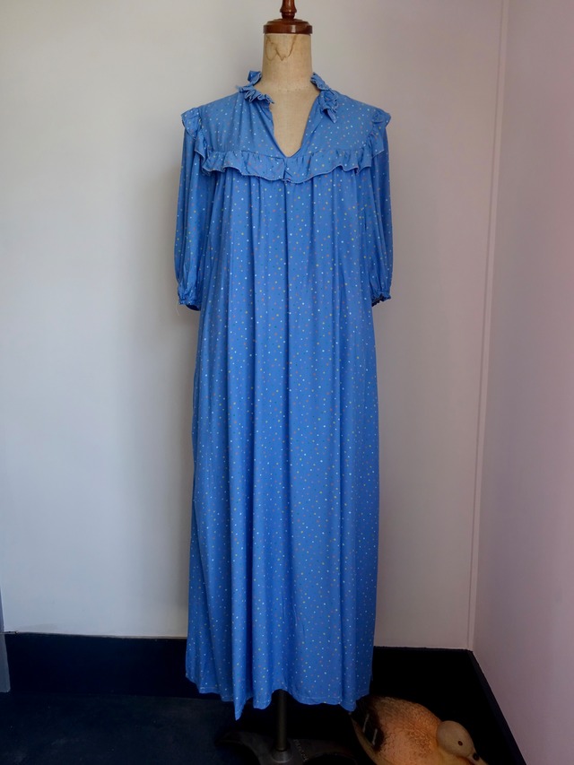 ピーターパンのウェンズデイのような、とても可愛らしいパジャマのようなワンピース レーヨンの上質な生地に可愛らしいフリルのコントラストがとても良い雰囲気です ベルトもついているのでお好きにアレンジされてください サイズ(cm) 肩幅: 34 身幅: 56 袖丈: 34 着丈: 114 状態 フリル部分が少しほつれています。 腰から下の辺りに数点ピンホールがございます その他ご着用に致命的なダメージはございません ※当店で扱っている商品は全てがセカンドハンドです、返品・交換は致しかねますのでよくご検討頂いた上でのご購入を強くお勧め致します。お手元に届いた際、ガッカリされないよう努めて参りますが、モニター環境や、人の手での検品となります為認識の誤差が生じてしまうかもしれません、気になる方はご購入前にお気軽にお問い合わせくださいませ。