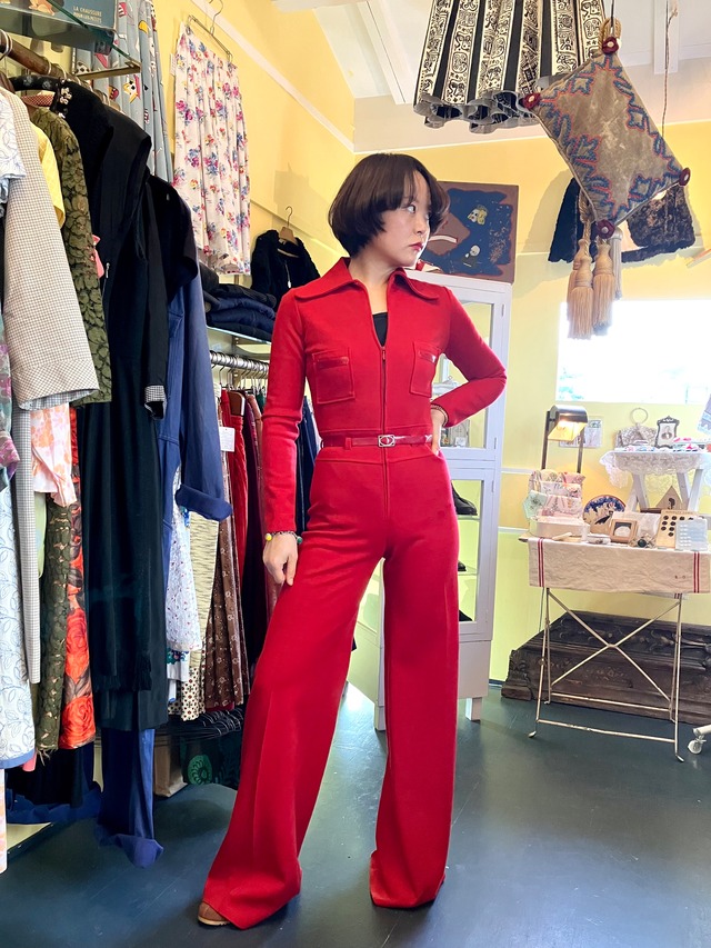 スーパーロングなオールインワン ピタッとしたいかにも60〜70年代らしいモッズ、バイカー、サイケを彷彿とさせるデザインです 素材はジャージーで伸縮性があるので可動域に制限はなく比較的きやすいと思います。 エナメルのベルトやポケットの装飾が艶っとアクセントになっていて 色は違えどLA MOTOCYCLETTEのマリアンヌ・フェイスフルさながらの色気と迫力があります。 古着のつなぎやオールインワンはよく見かけますが、この手のデザインは本当に希少ですので是非! 写真6〜10枚目が外で撮った加工なしの写真です。 サイズ(cm 平置き 着用者163cm Mサイズ程度) 着用感: S〜M 表記: 40 肩幅: 35 身幅: 40×2 ウエスト: 35×2 袖丈: 59 股下: 85 着丈: 154 状態 特にダメージは無くとても綺麗です ※当店で扱っている商品は全てがセカンドハンドです、返品・交換は致しかねますのでよくご検討頂いた上でのご購入を強くお勧め致します。お手元に届いた際、ガッカリされないよう努めて参りますが、モニター環境や、人の手での検品となります為認識の誤差が生じてしまうかもしれません、気になる方はご購入前にお気軽にお問い合わせくださいませ。