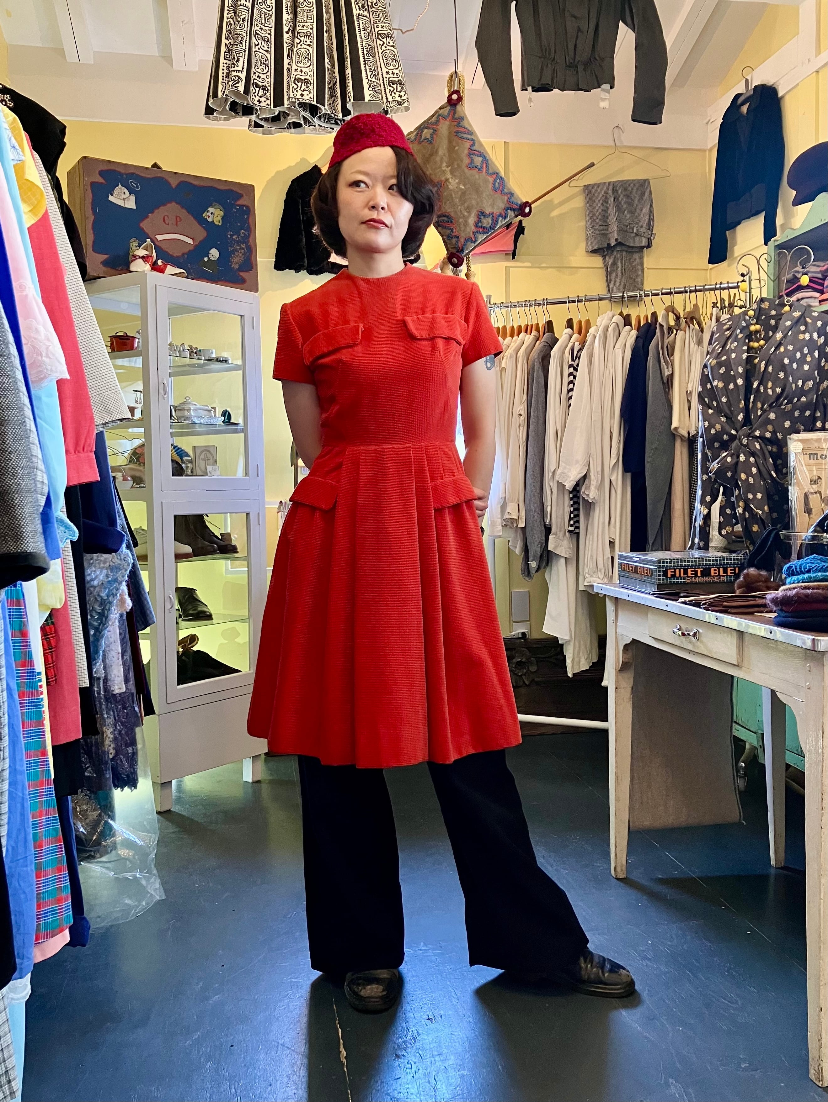 1940's〜1950'sの間くらいの絶妙なニュアンスを含んだデザインがとても素敵なワンピース 50'sというには素朴かつ上品だし、なにより生地が古いですし、 40'sというには少しばかりポップさの強い まさに過渡期に作られたワンピース。 女性が活躍し、生き生きとしていく時代の変化を感じられるような一枚。 コーデュロイはとてもしっかりと肉厚なコットンの、いかにもヴィンテージらしい素材です。 しかも1番のポイントに畝がマス目状になっているとても珍しいコーデュロイ! この雰囲気はなかなか出会えない貴重な一枚です。 サイズ(cm 平置き 着用者163cm Mサイズ相当) 着用感Mくらい、膝が少しだけ見える丈感です。 肩幅: 39 身幅: 45×2 ウエスト: 34×2 着丈: 96 状態 ご着用に致命的なダメージはございません。 全体的にシミがあります。 ※当店で扱っている商品は全てがセカンドハンドです、返品・交換は致しかねますのでよくご検討頂いた上でのご購入を強くお勧め致します。お手元に届いた際、ガッカリされないよう努めて参りますが、モニター環境や、人の手での検品となります為認識の誤差が生じてしまうかもしれません、気になる方はご購入前にお気軽にお問い合わせくださいませ。