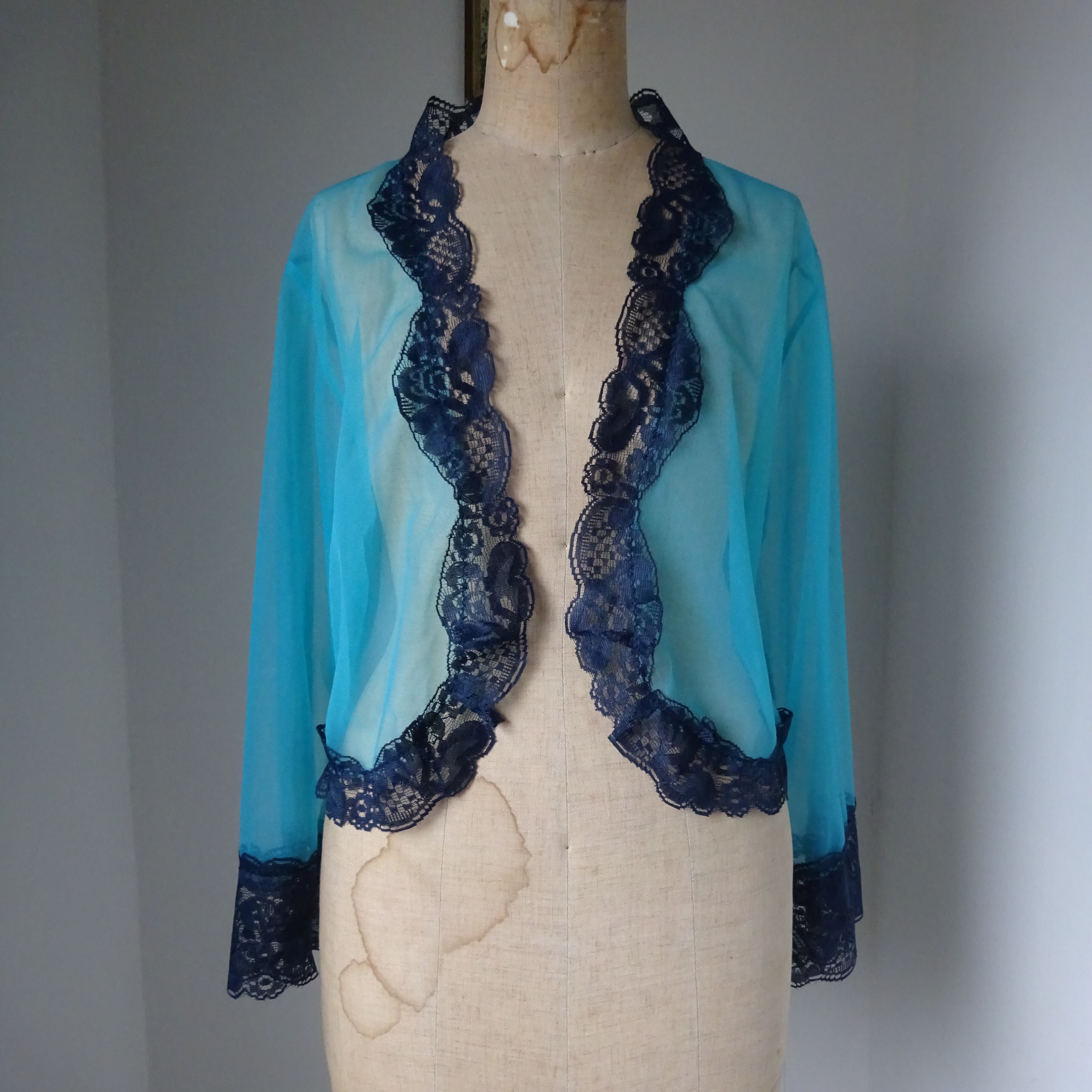 ターコイズブルーに濃紺のレースがとても美しいベッドジャケット