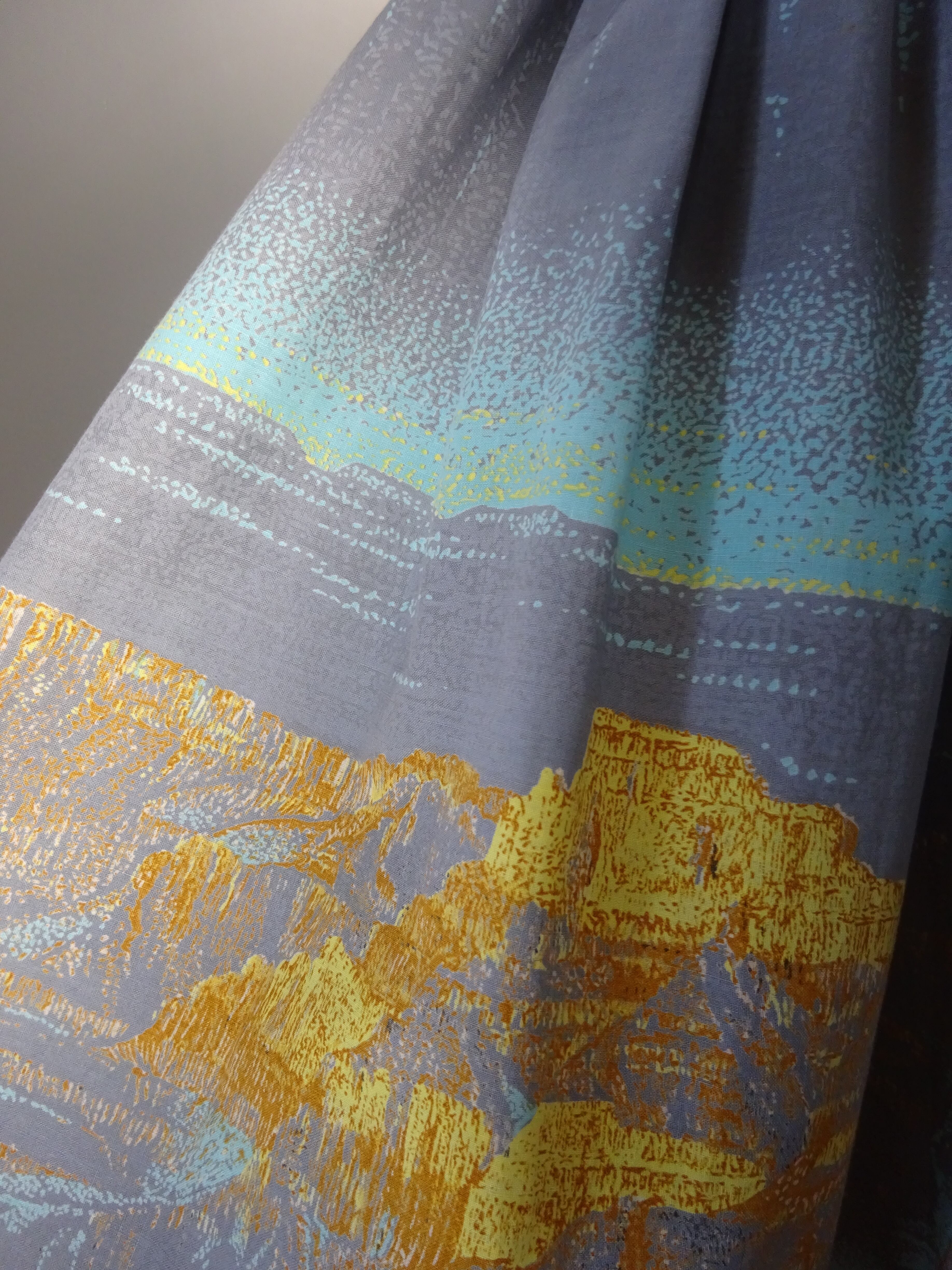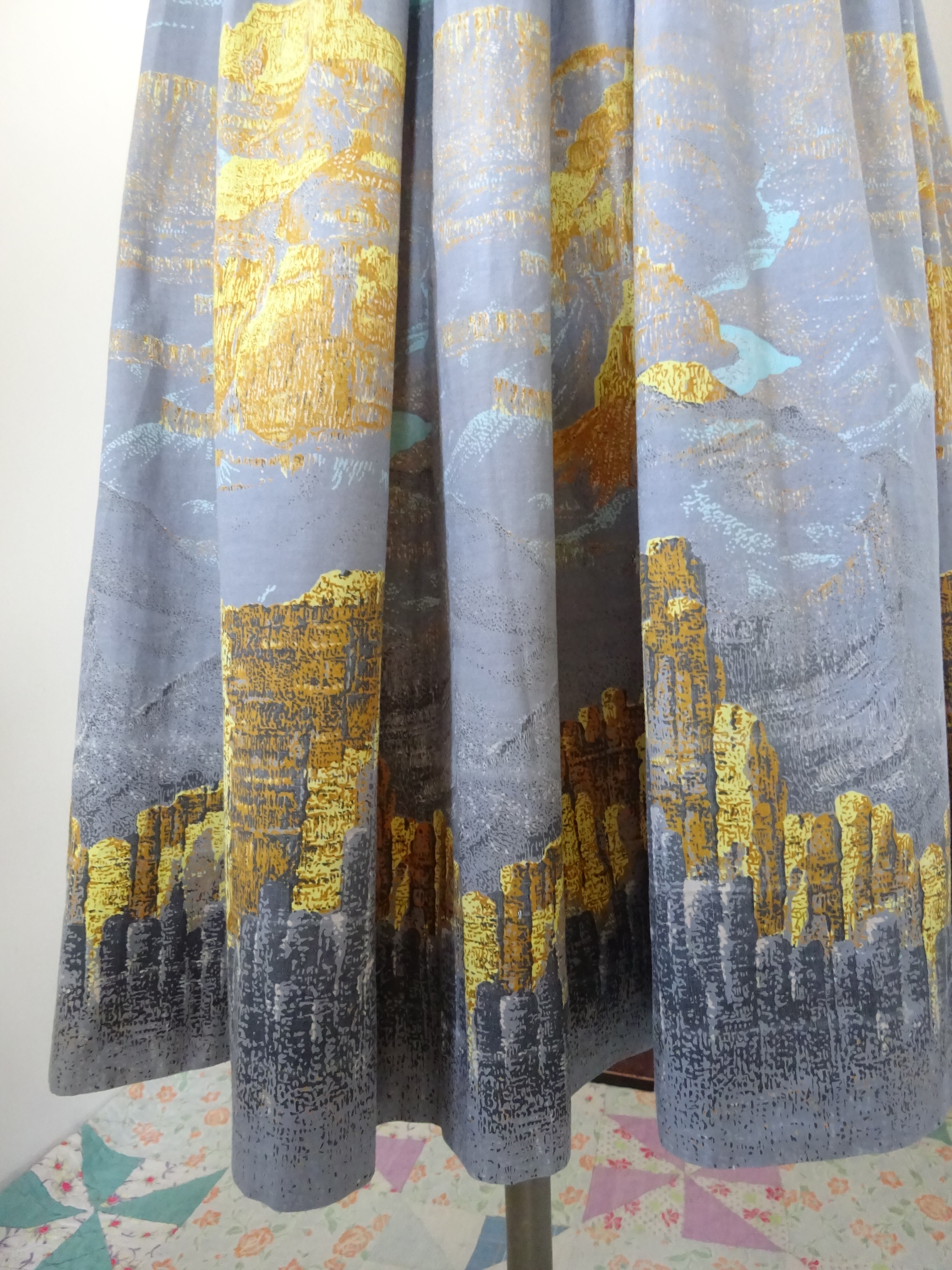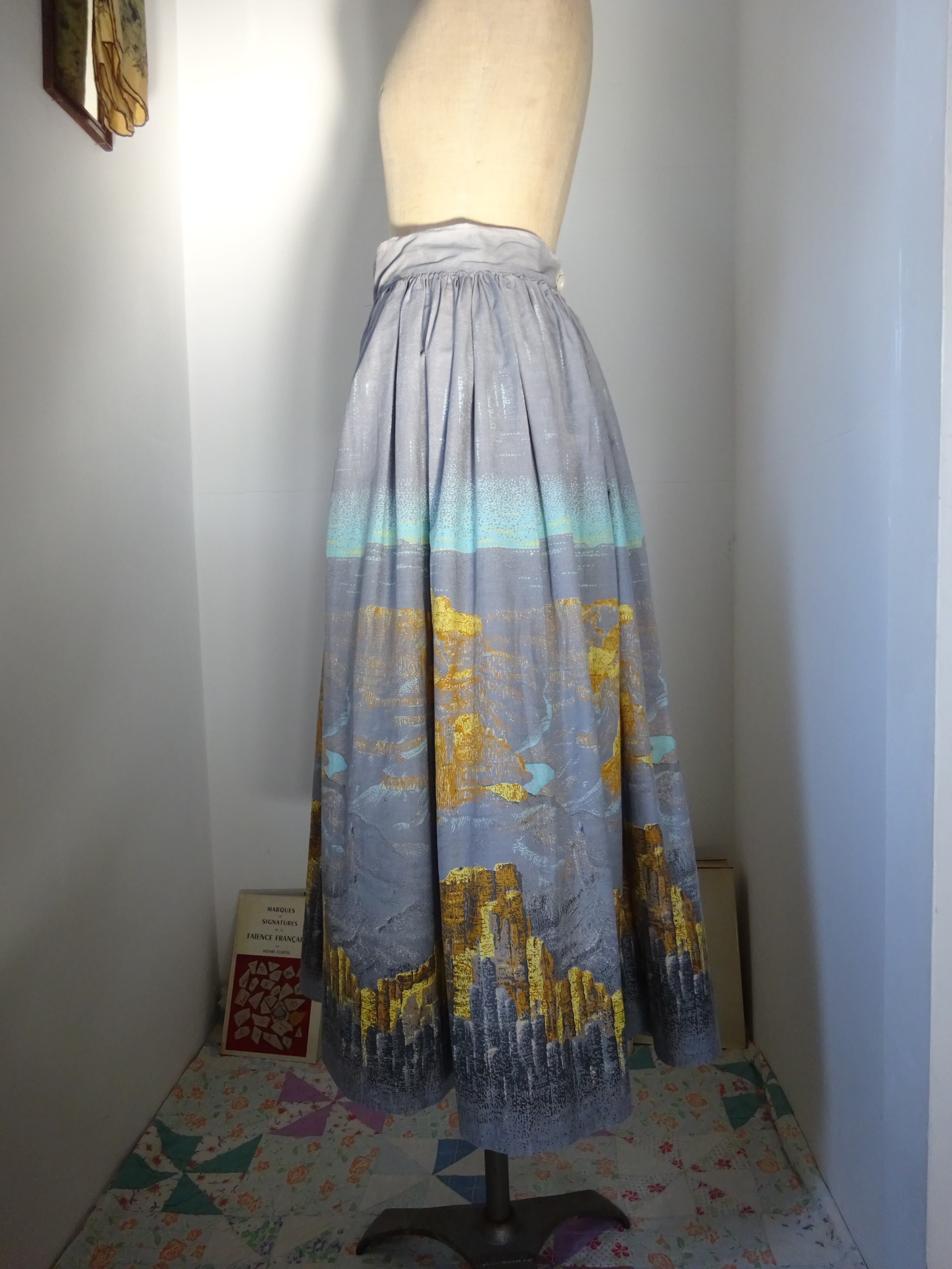 グランドキャニオンのようなアメリカの大自然が描かれたテキスタイルを惜しみなく使ったギャザースカート