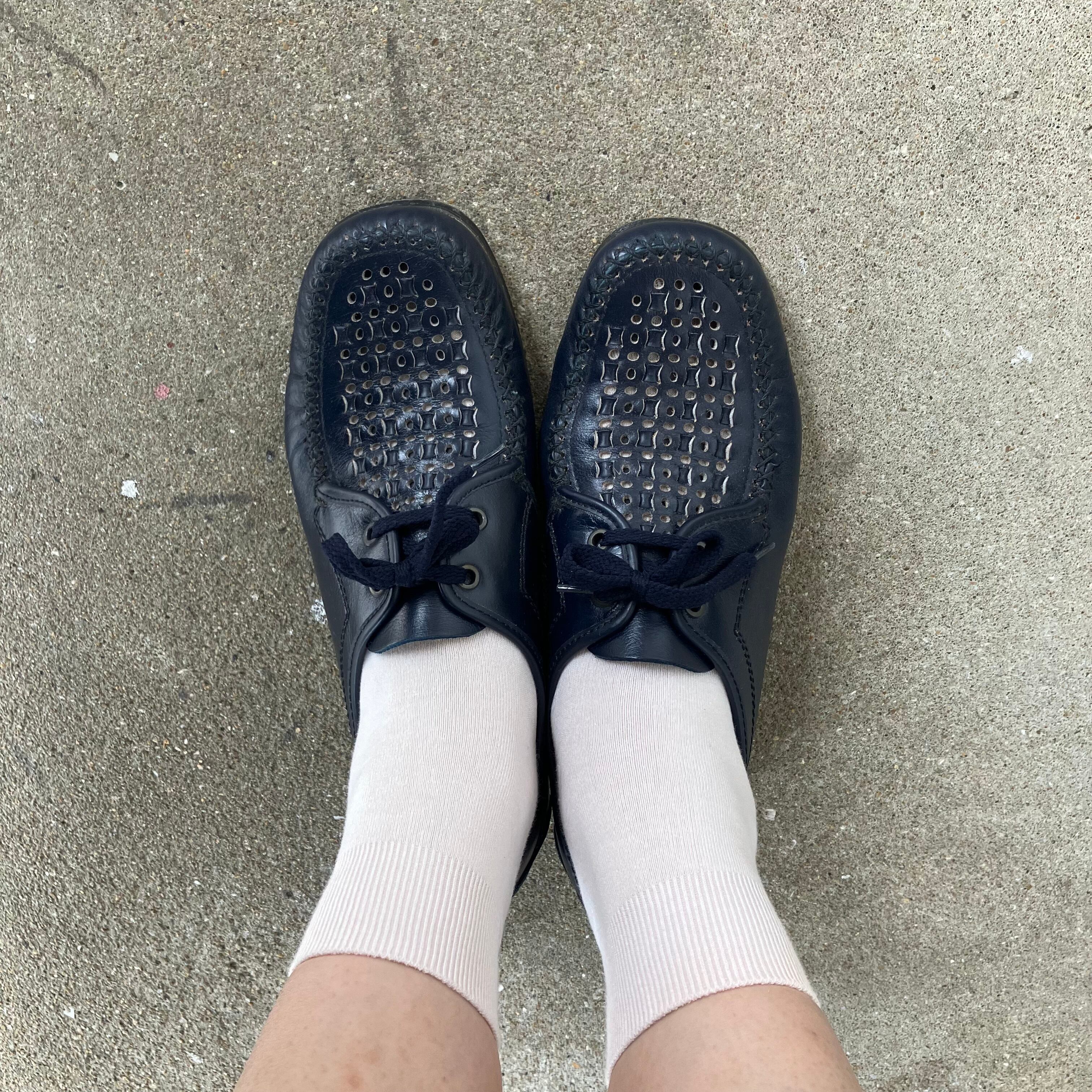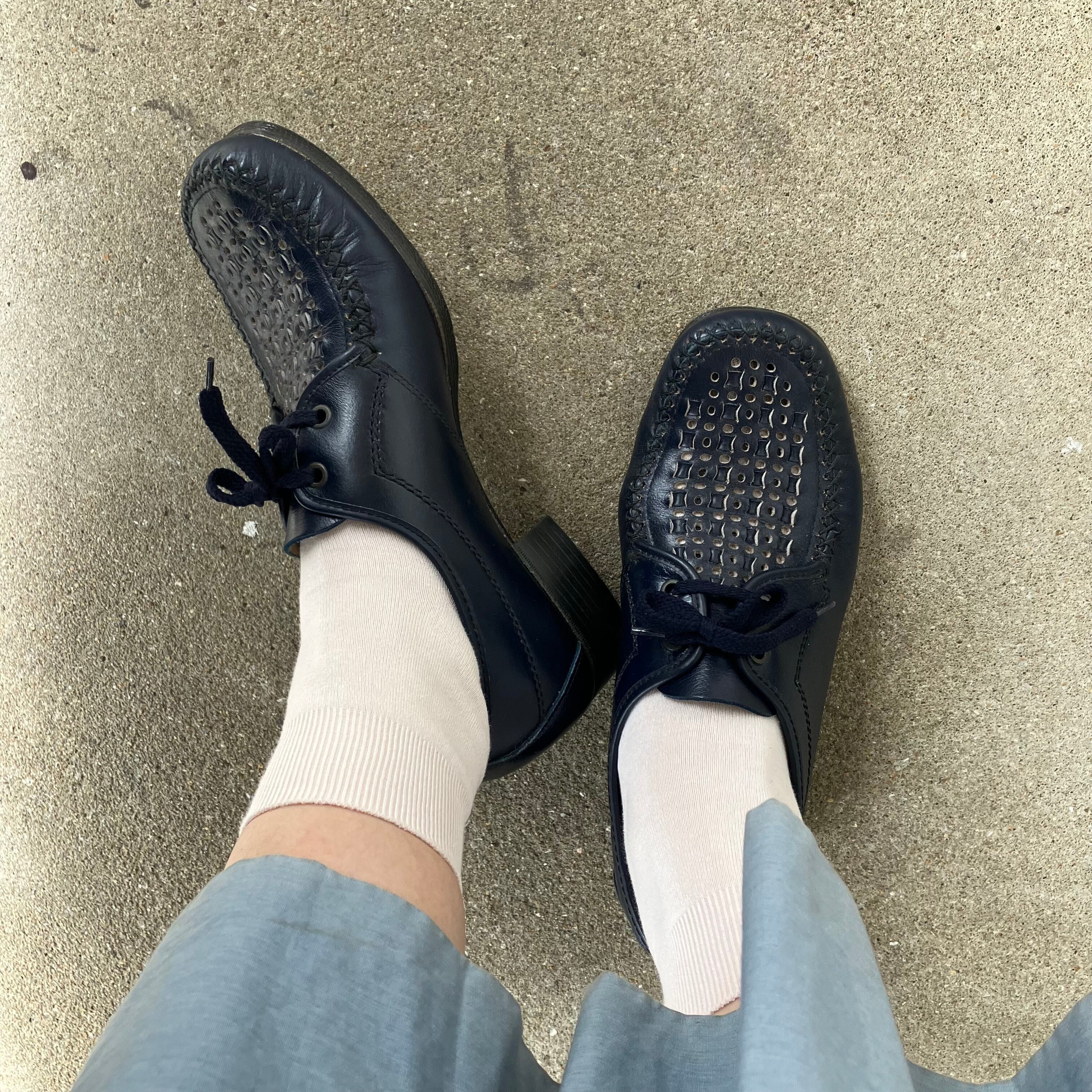 パンチングで透かしになっていたりレザーが編まれていたり、×ステッチまで施され、手の込んだデザインがとても素敵で、ローファーともパンプスとも言い難い雰囲気です。