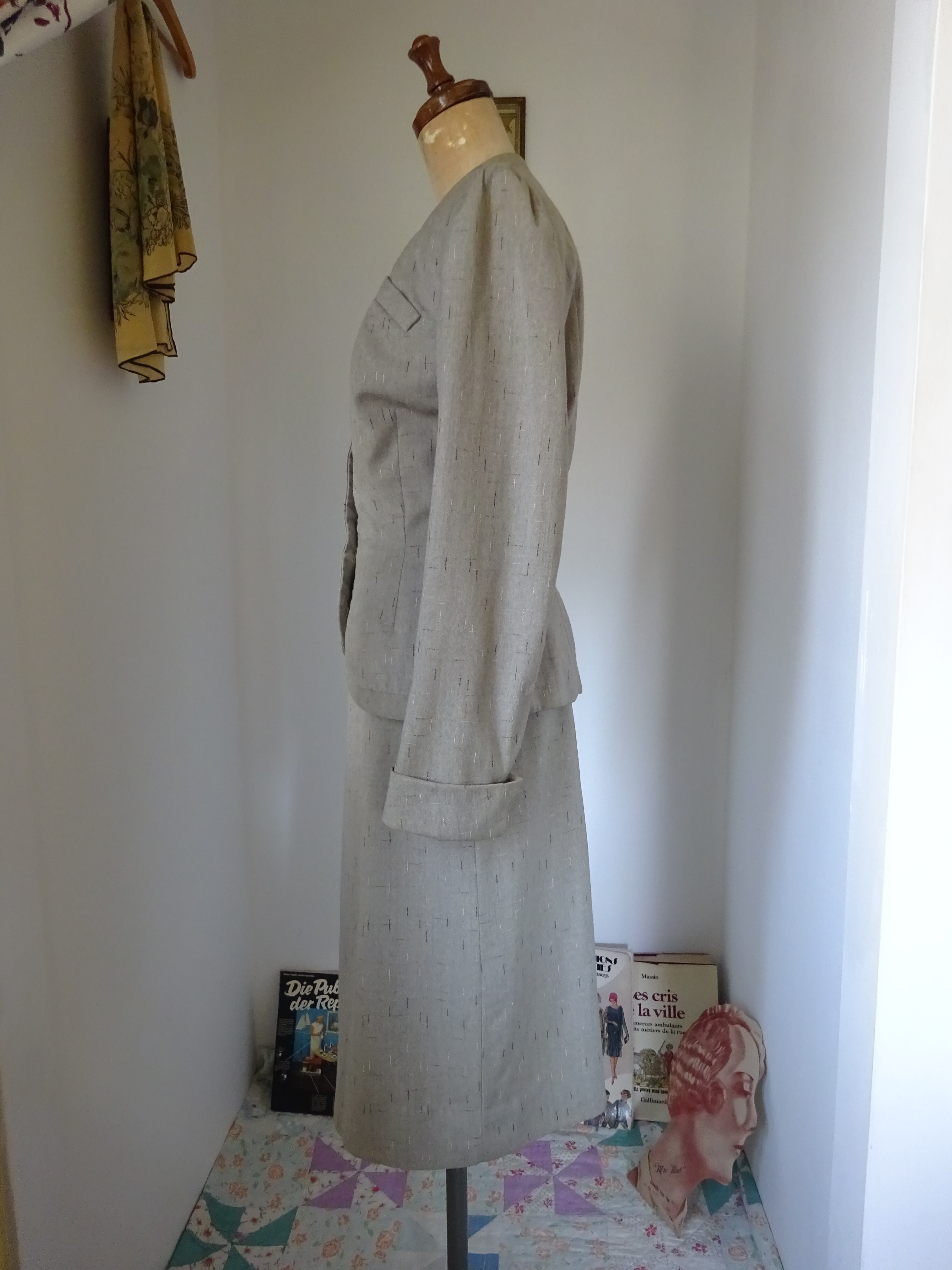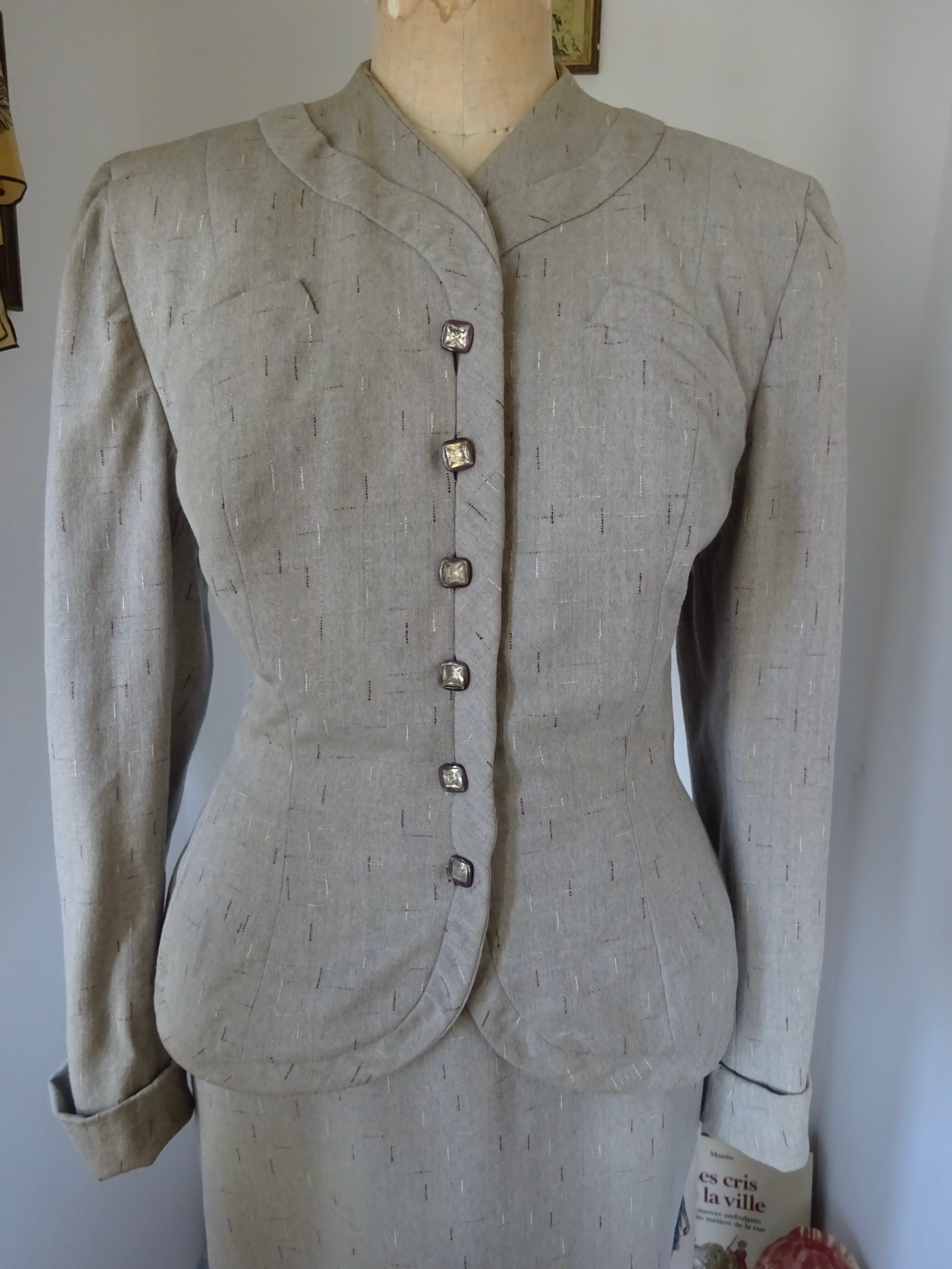肩は美しく40'sらしいシルエットのパットが入り、ウエストからヒップに掛けてもパプラムの裾がへたらないように厚手の芯が入っています。