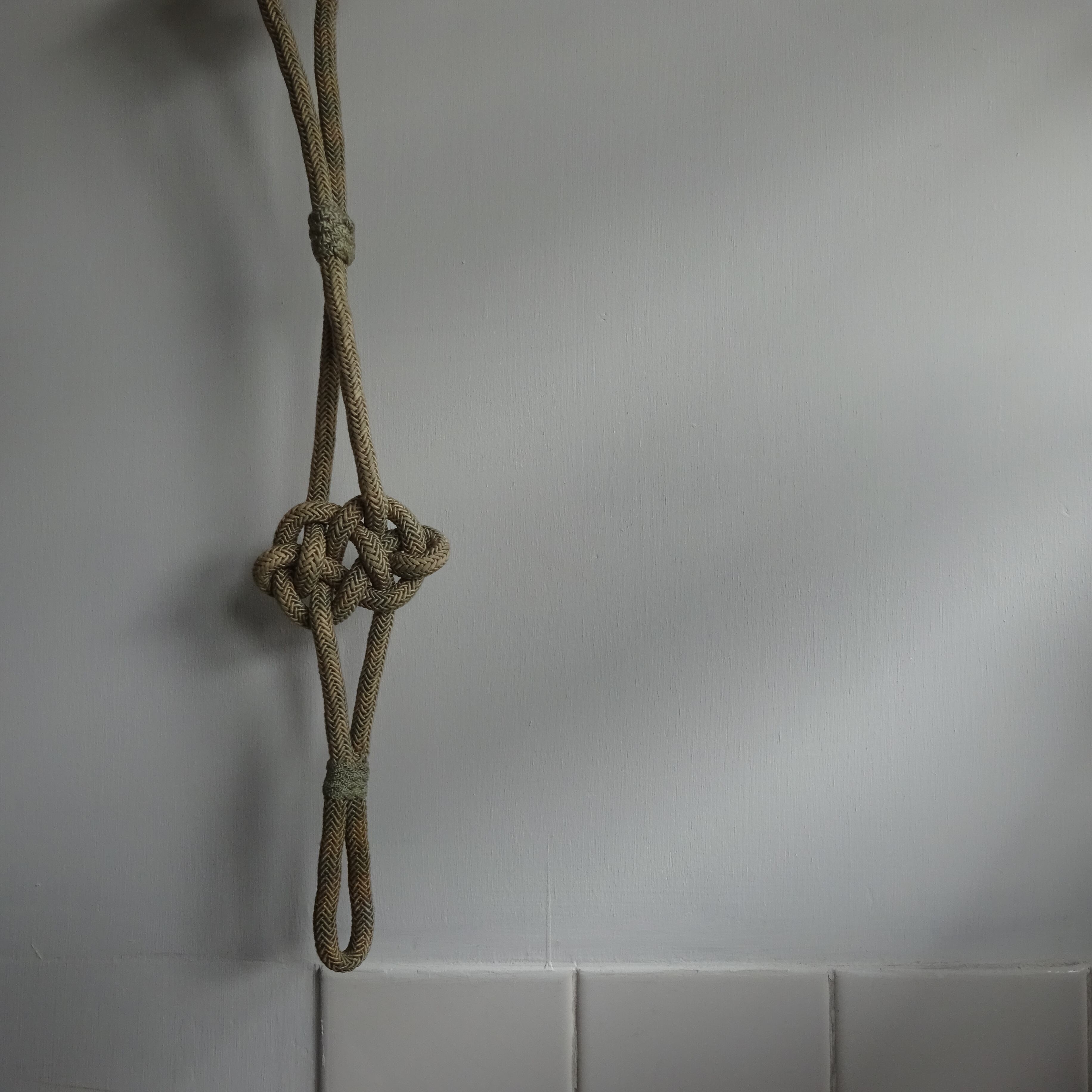 両端はフックなどに引っ掛けられる様に輪っかになっていて、片側の輪の方が長いです。
