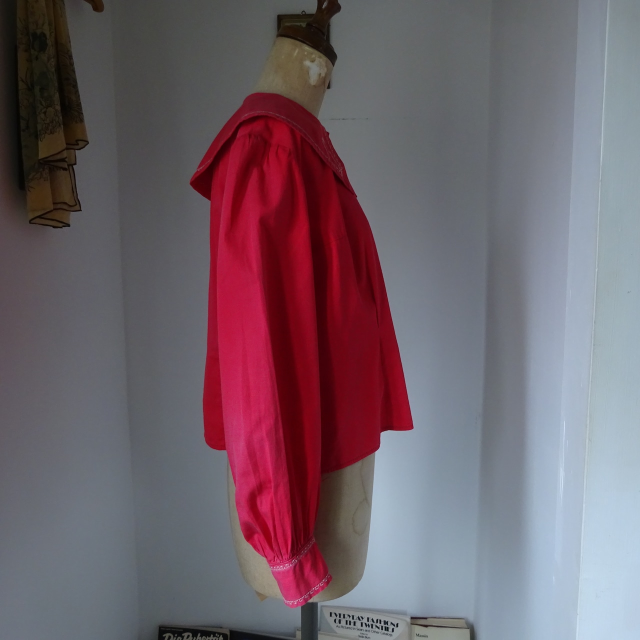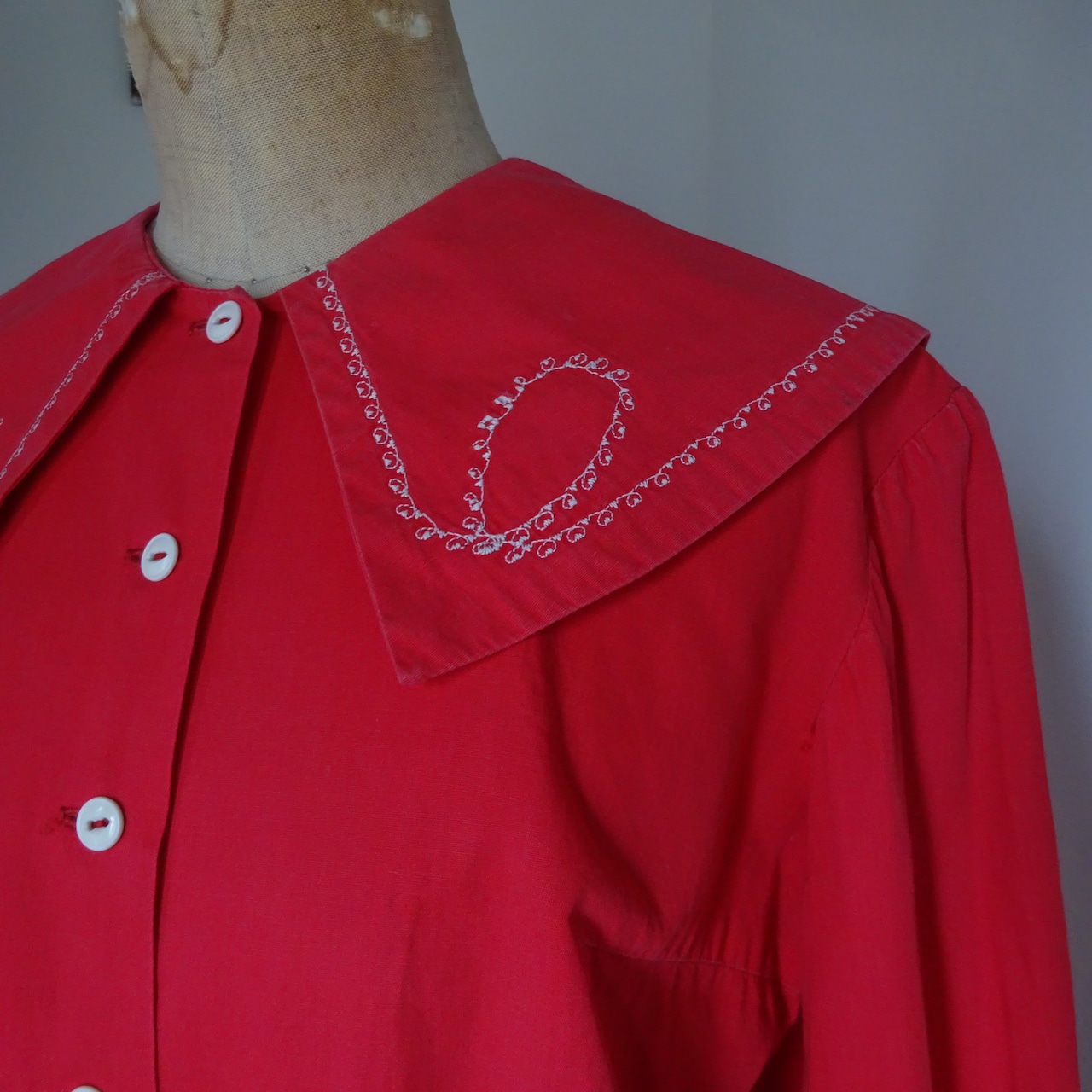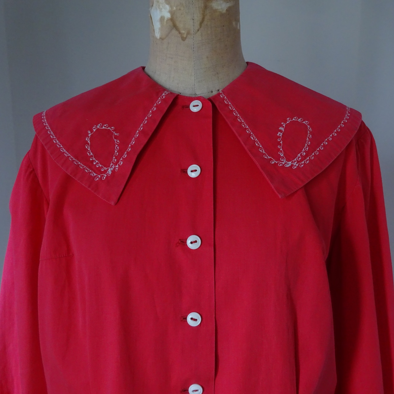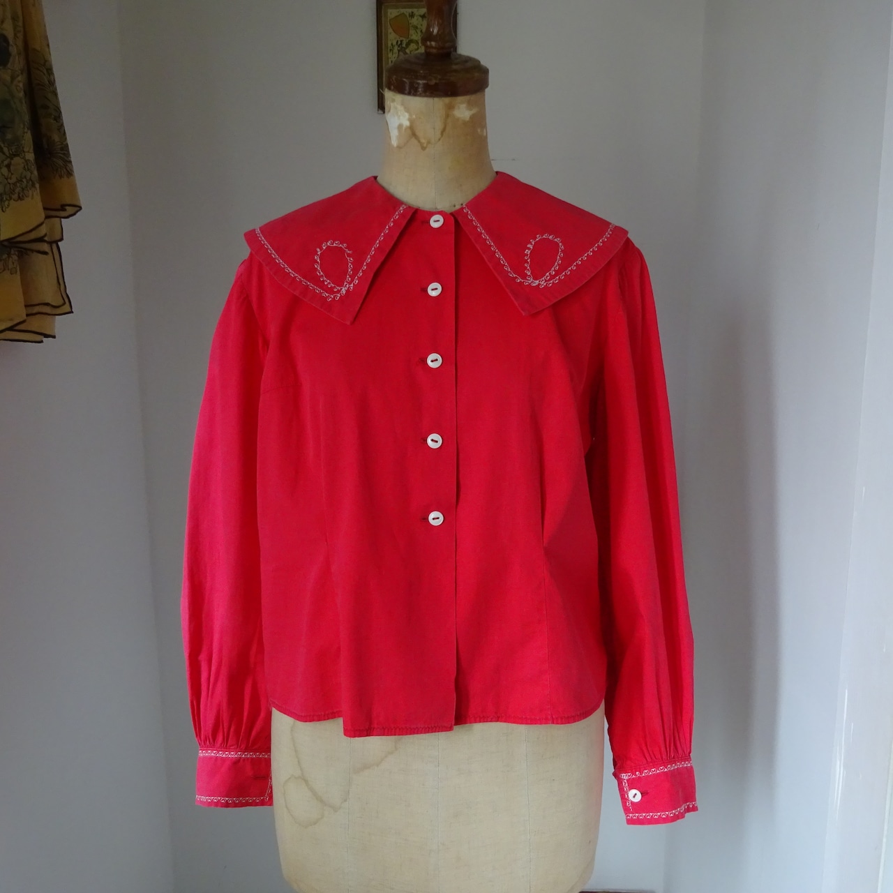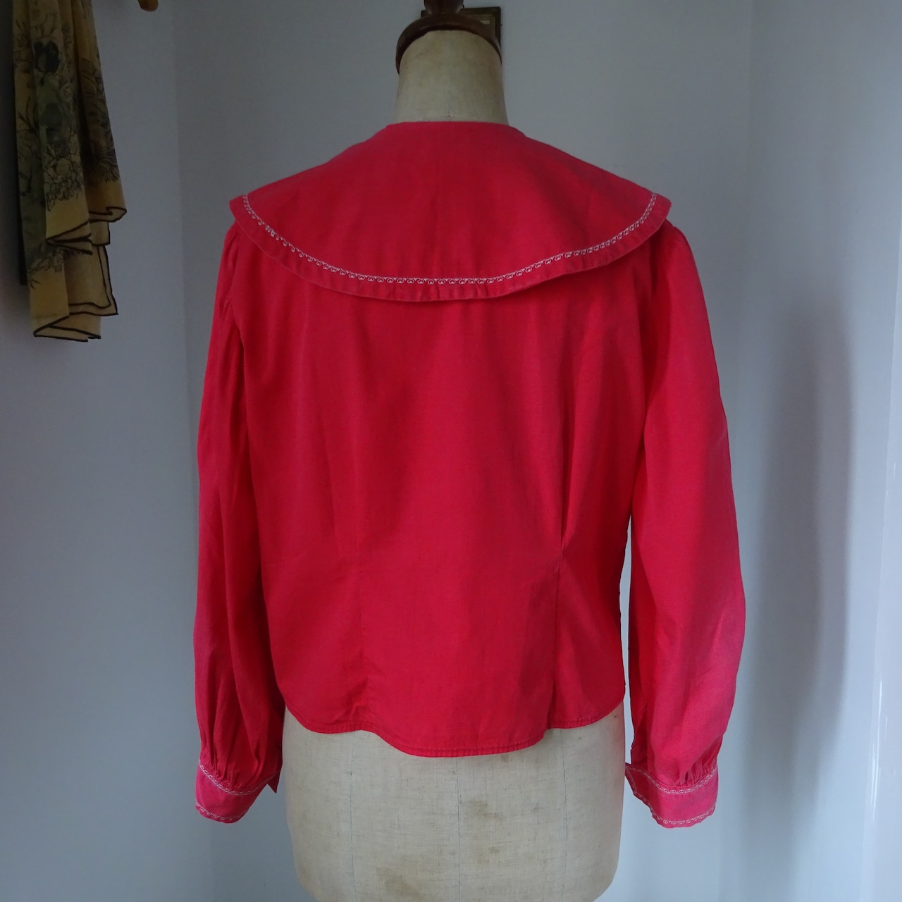 とても美しい赤に大きな襟が特徴的なブラウス