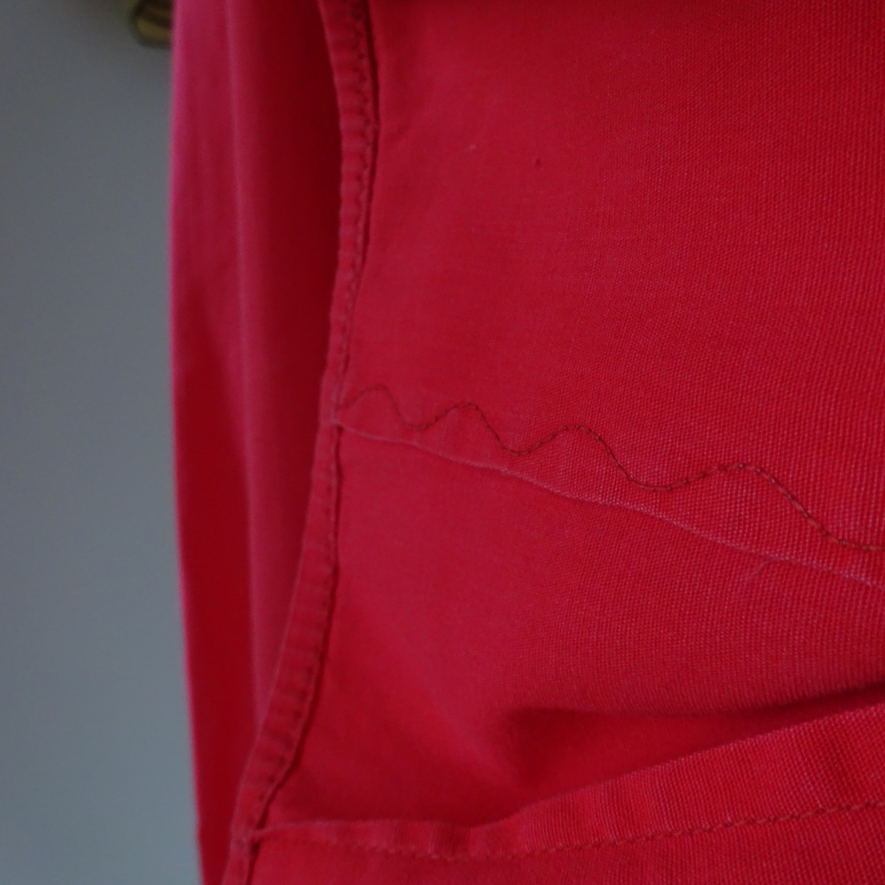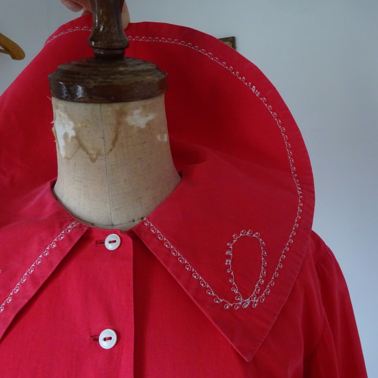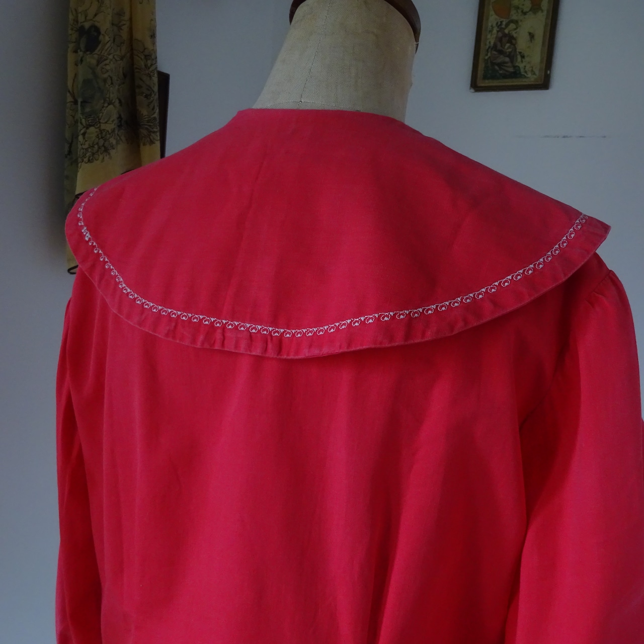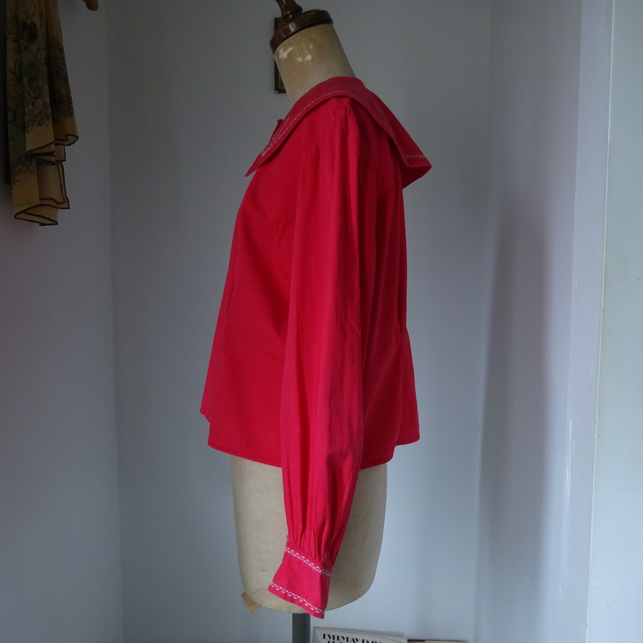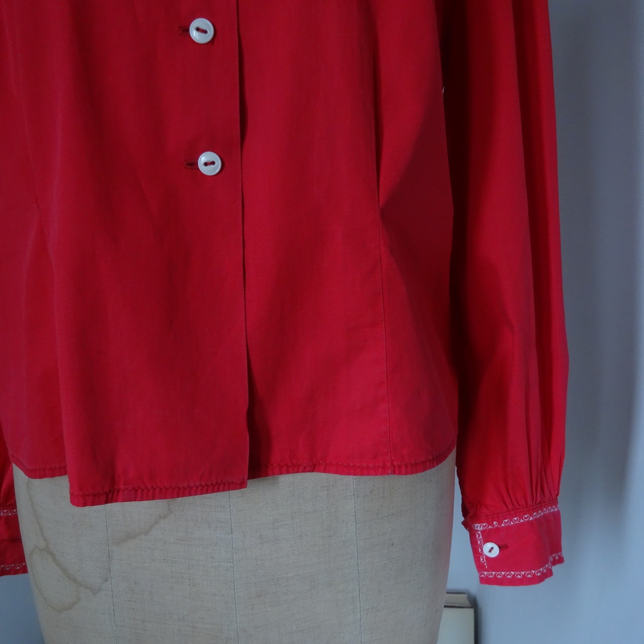 とても美しい赤に大きな襟が特徴的なブラウス