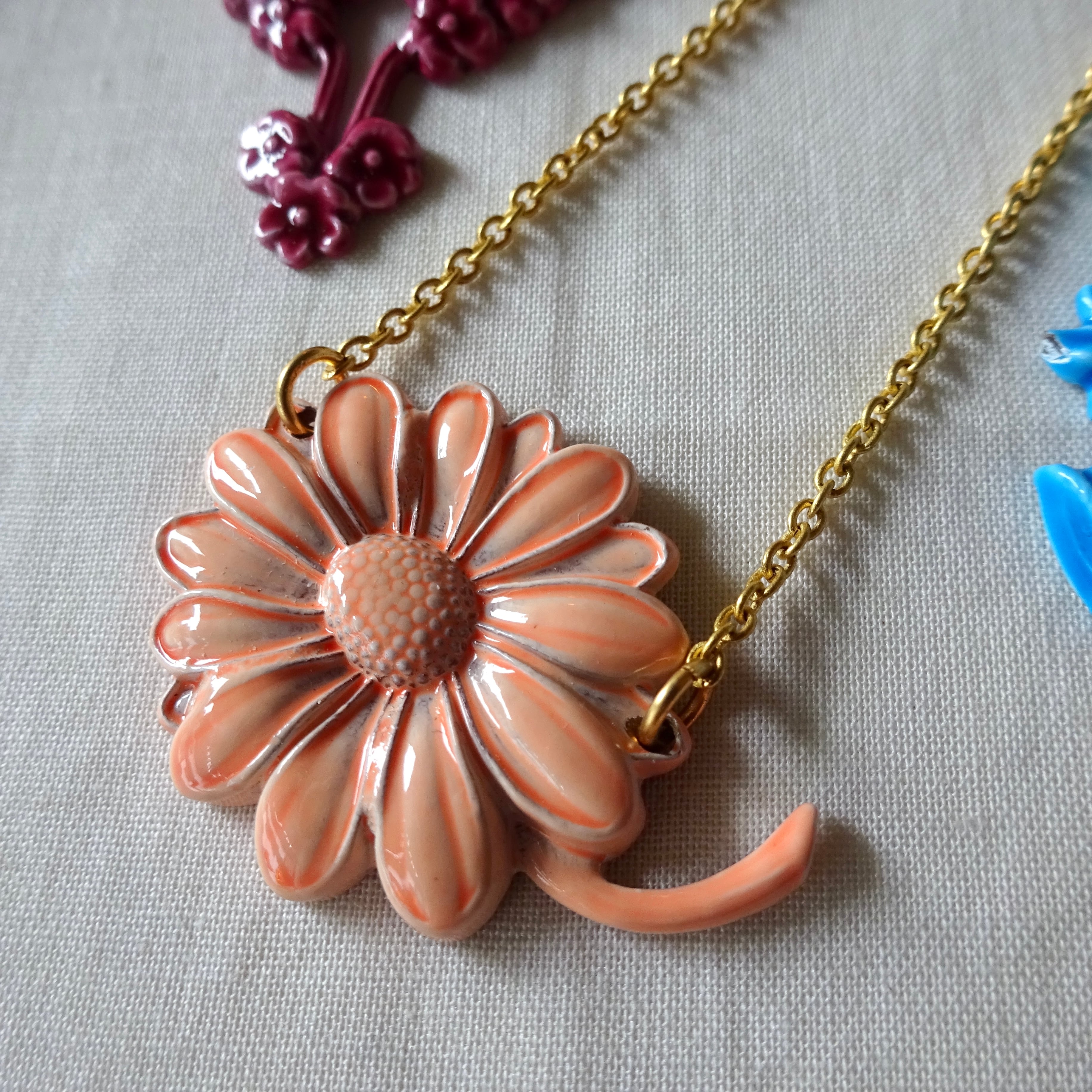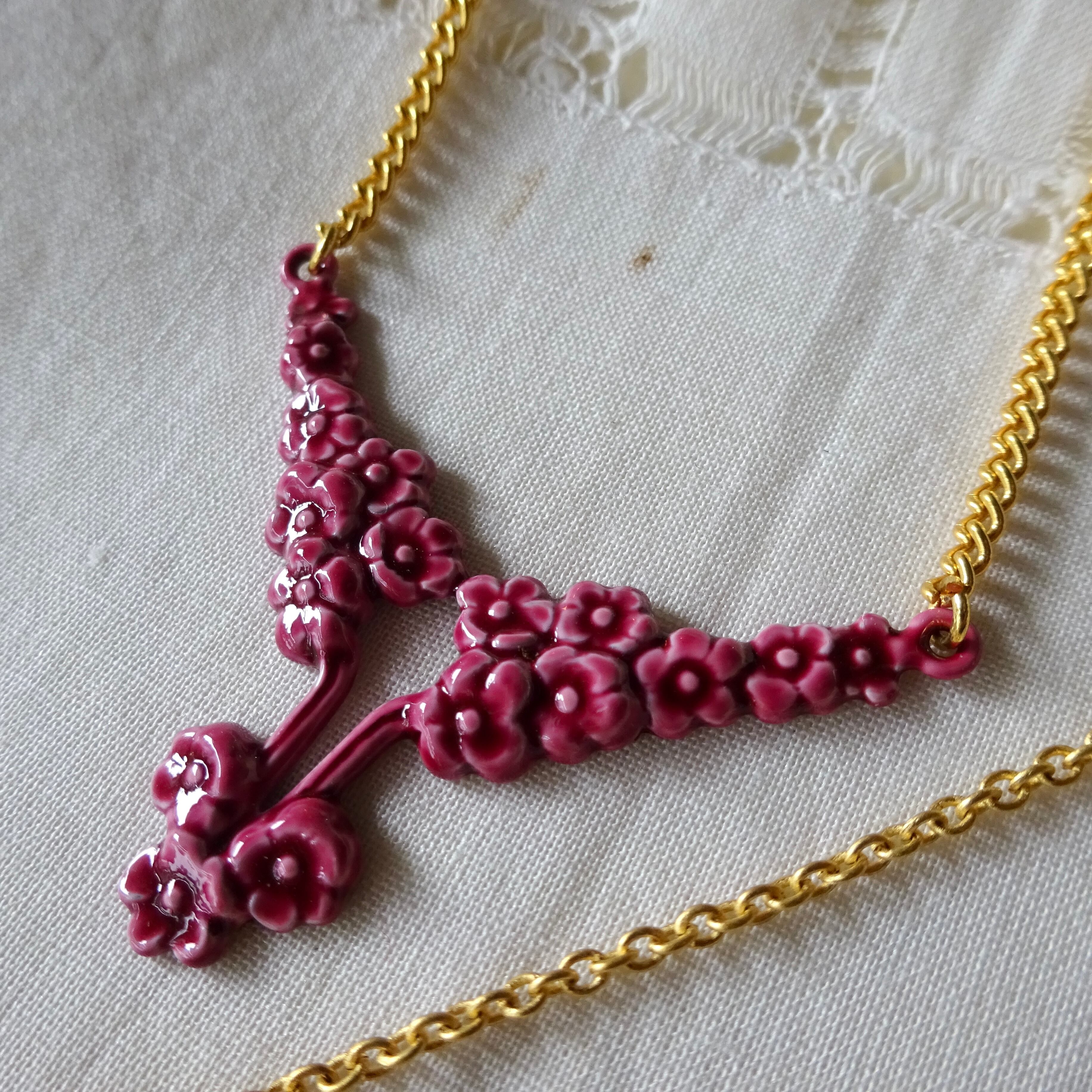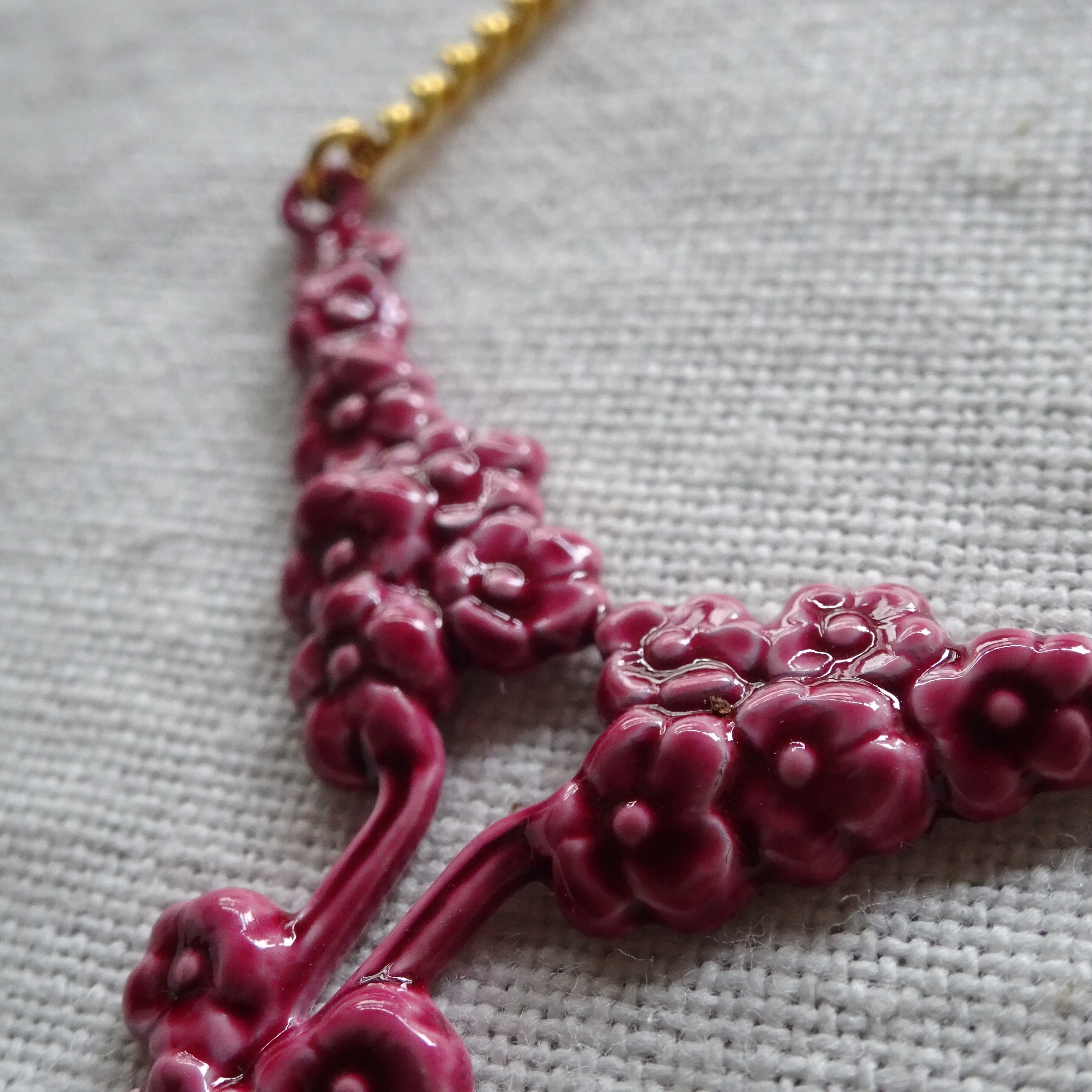 金属にエナメル加工してあるのですが、立体的なモチーフでまるで陶器の釉薬のような濃淡が楽しめる素敵なネックレスです。