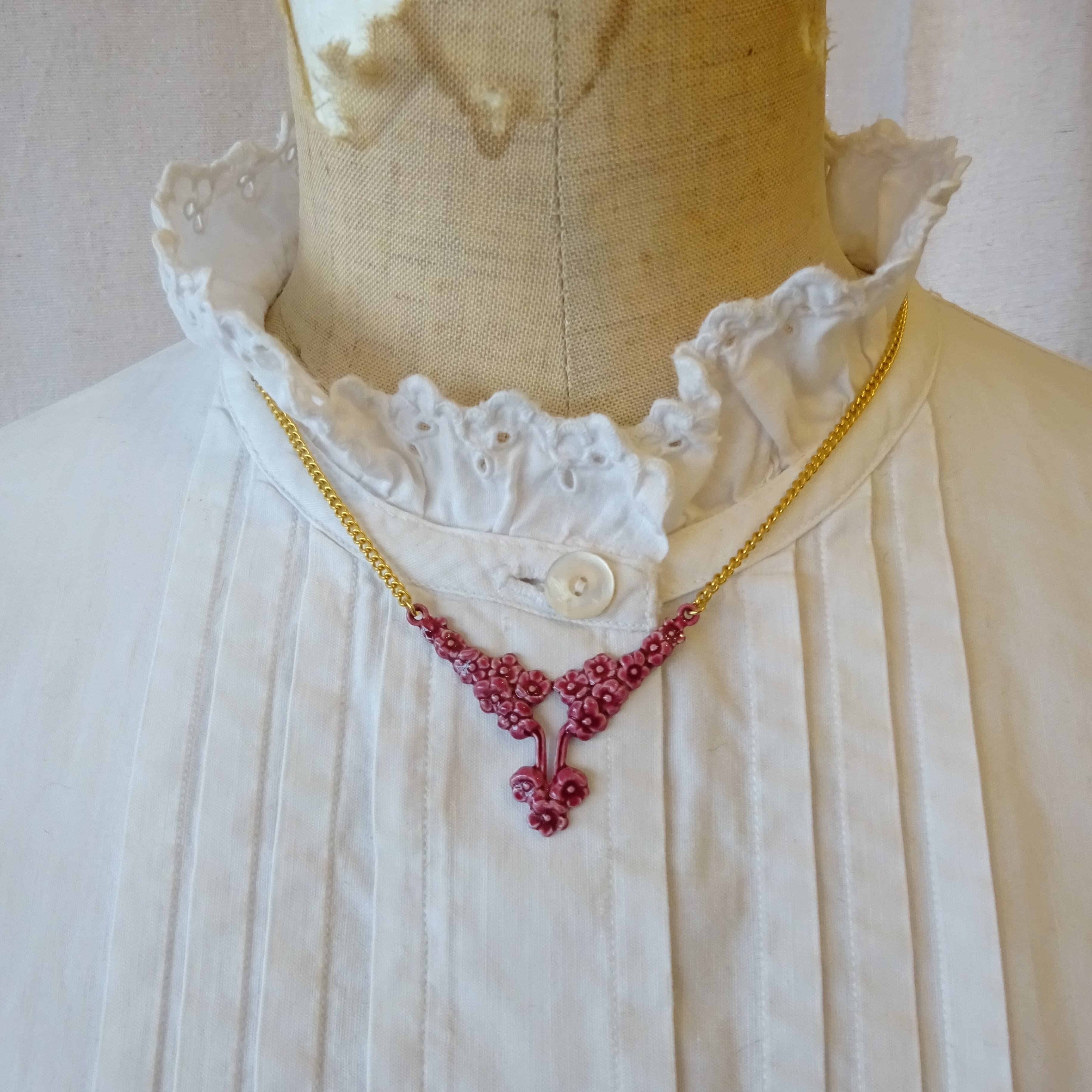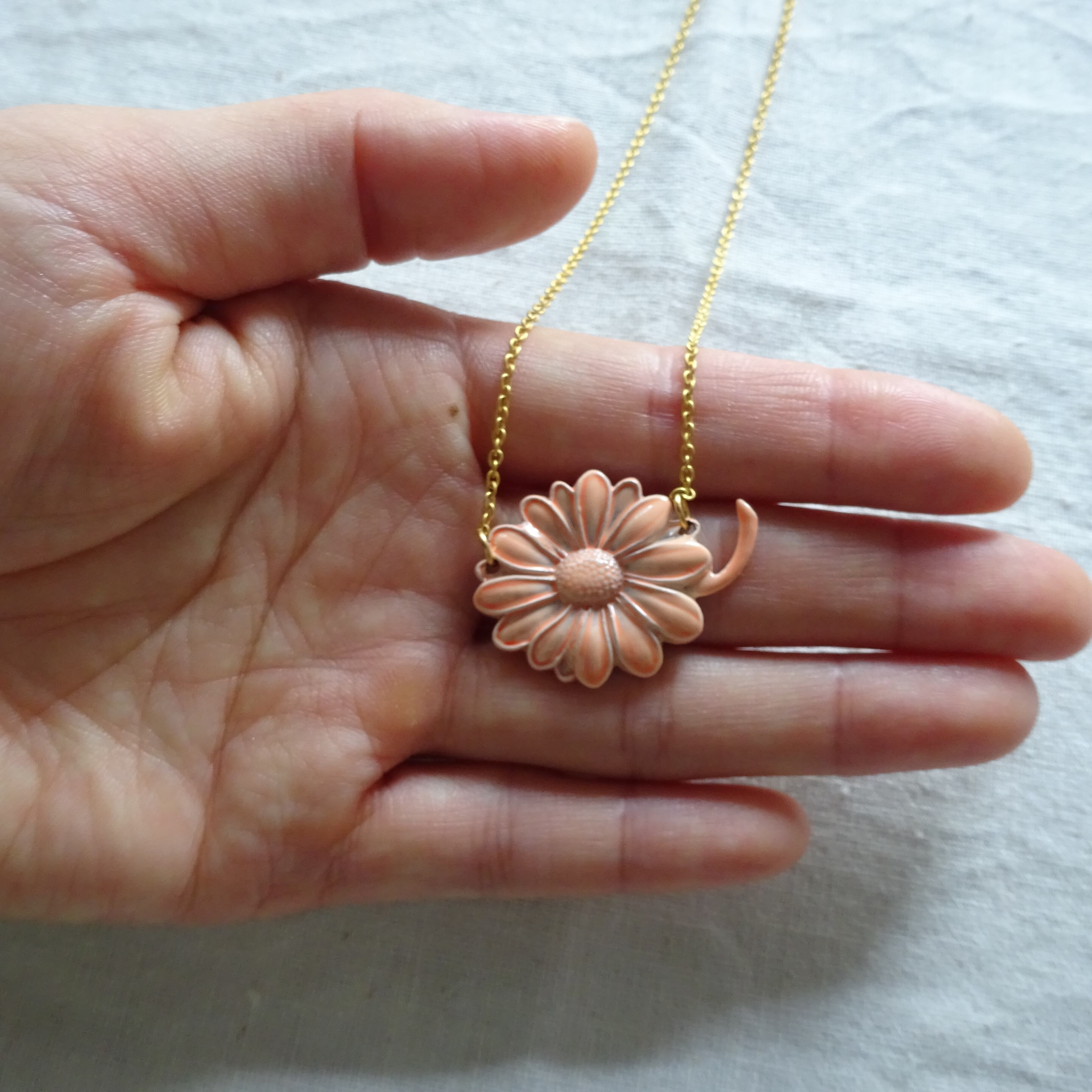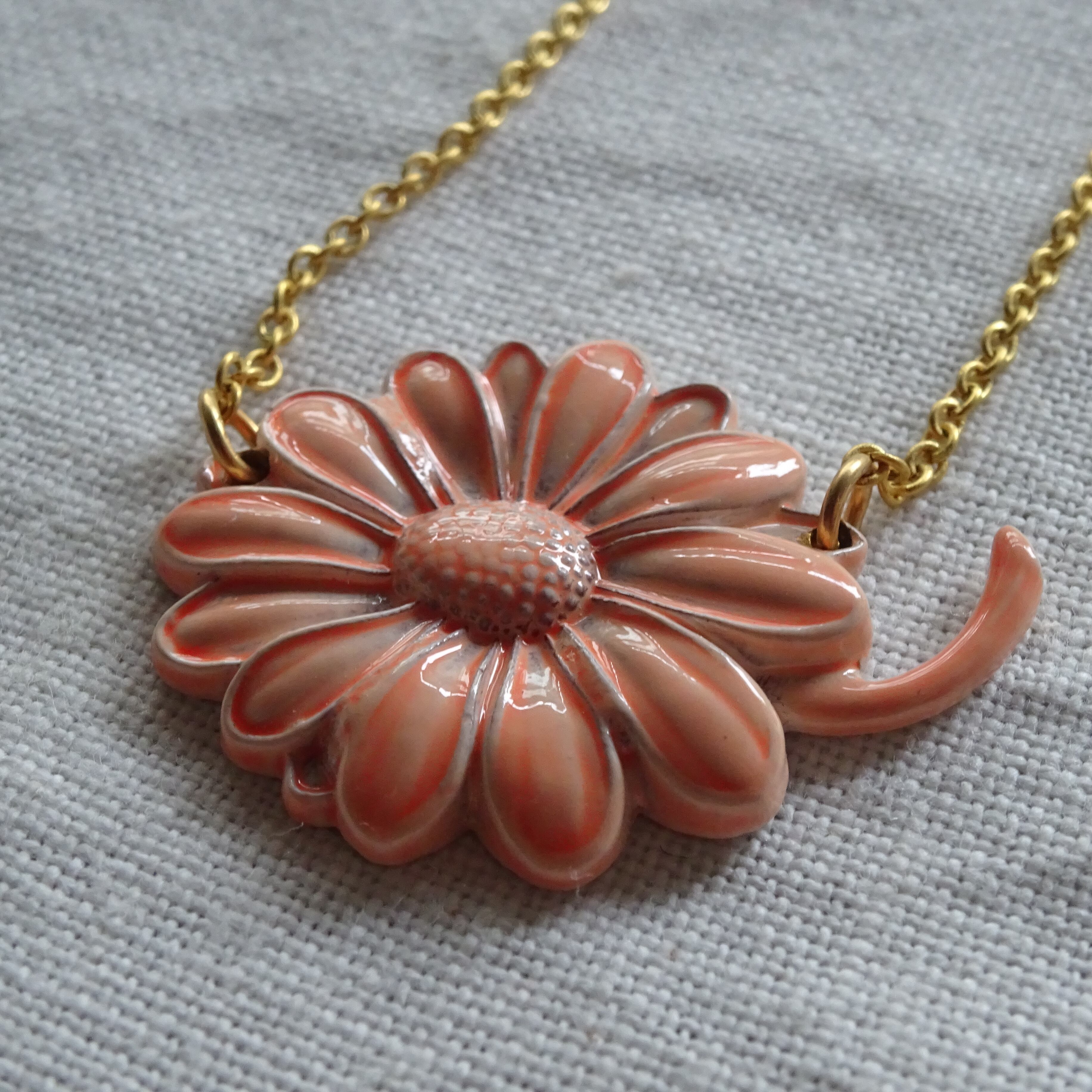金属にエナメル加工してあるのですが、立体的なモチーフでまるで陶器の釉薬のような濃淡が楽しめる素敵なネックレスです。