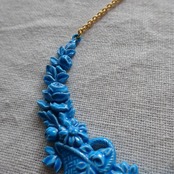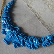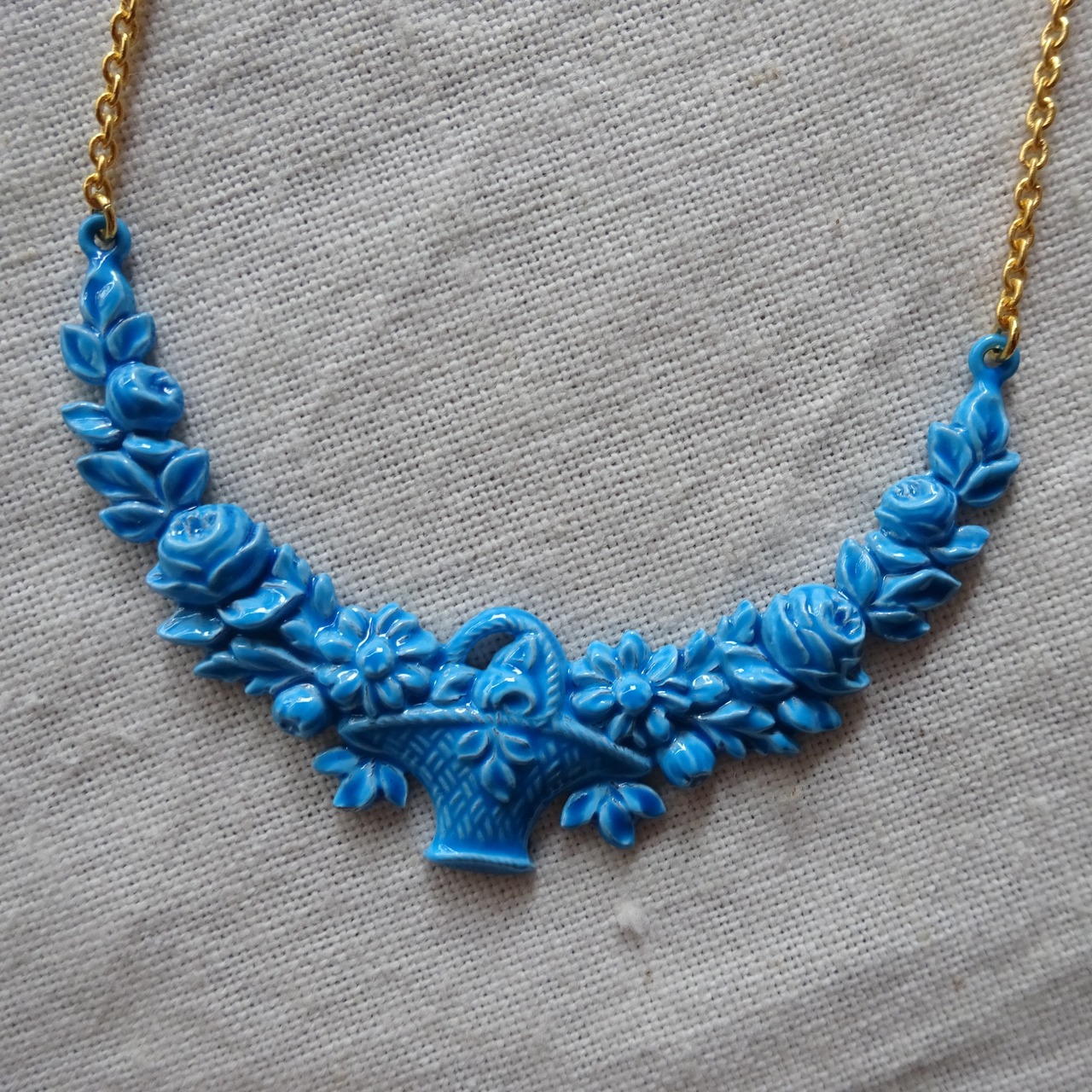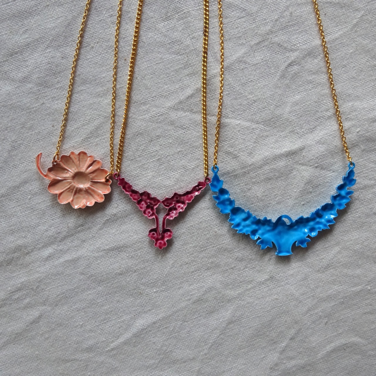 金属にエナメル加工してあるのですが、立体的なモチーフでまるで陶器の釉薬のような濃淡が楽しめる素敵なネックレスです。