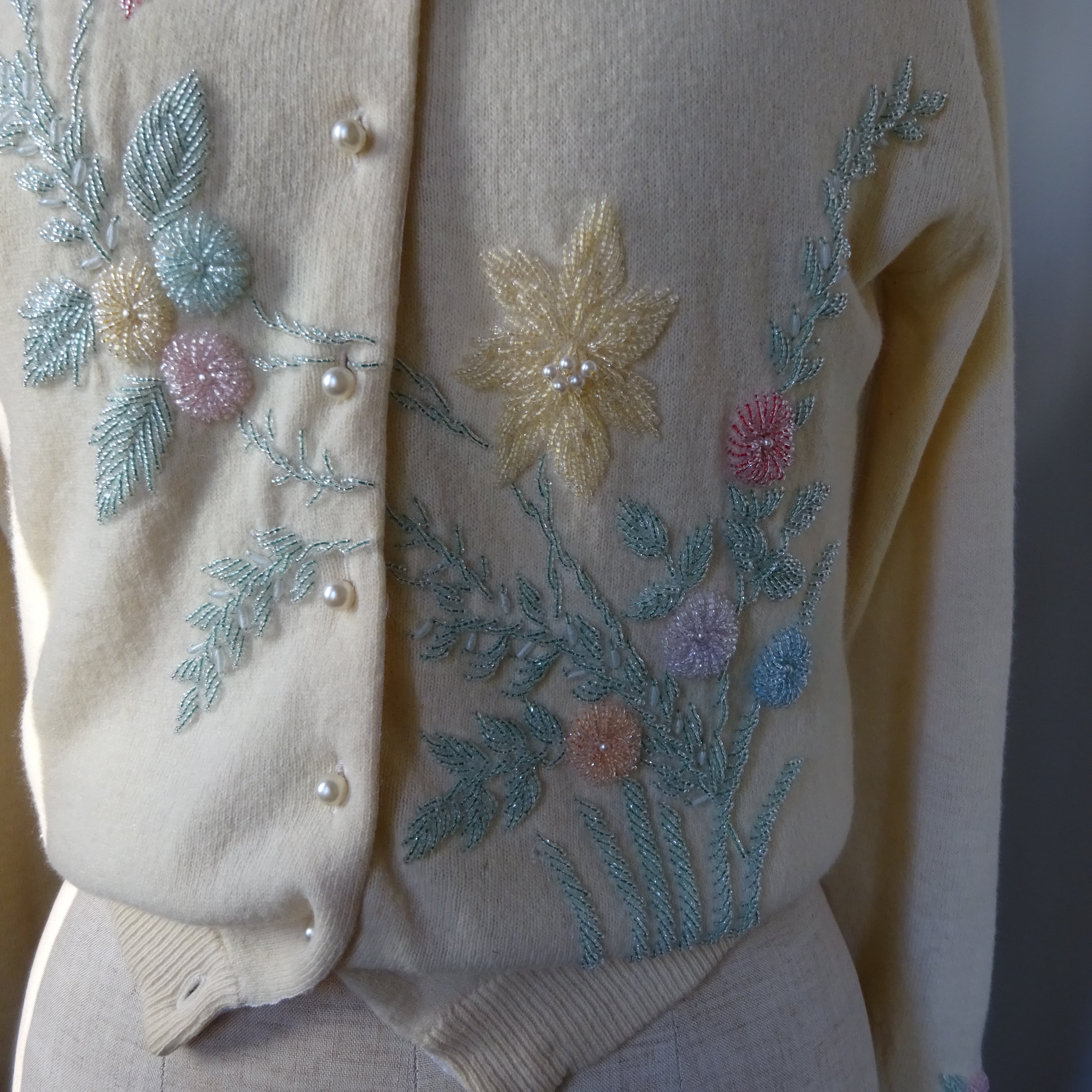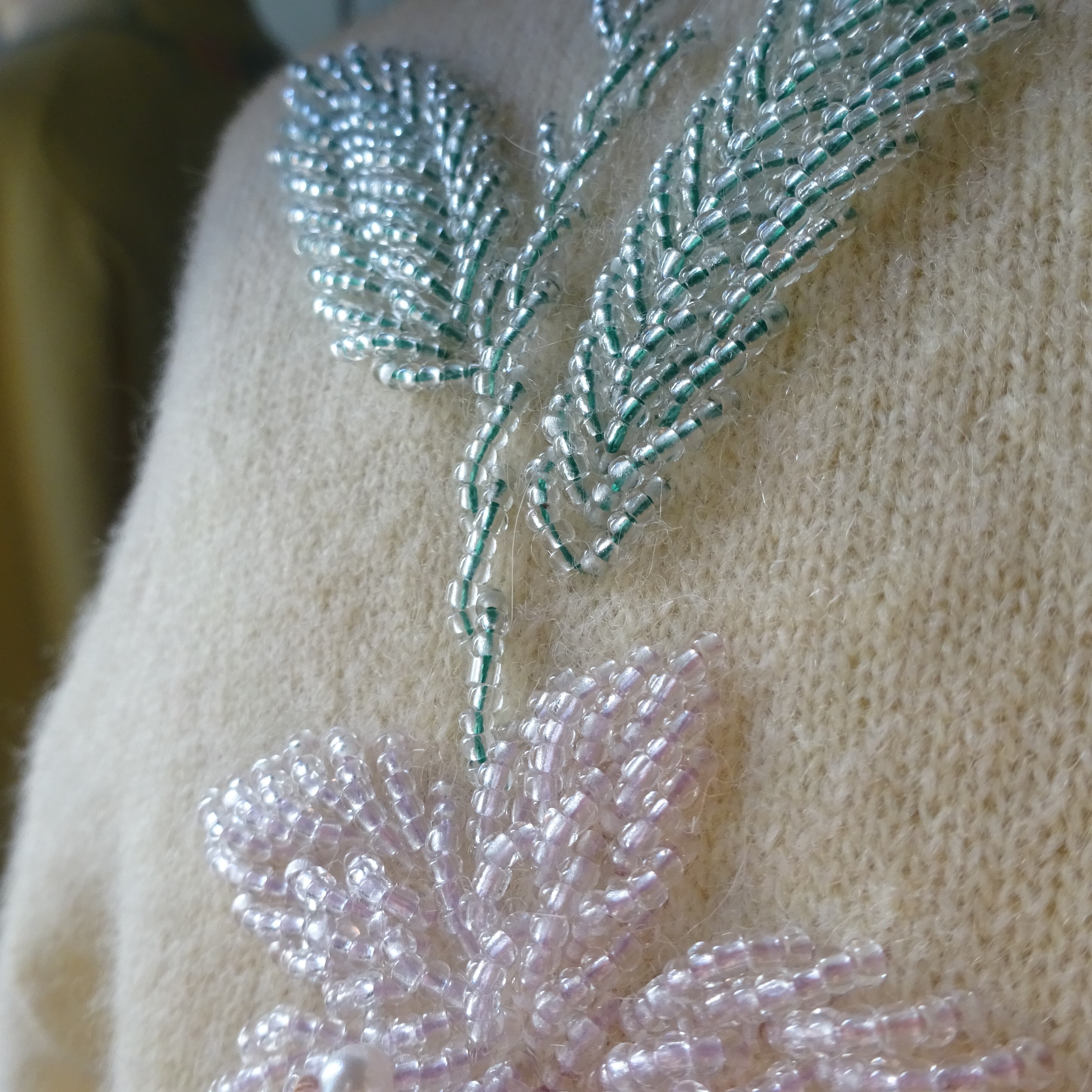 透明のガラスビーズに緑や赤の刺繍糸でお花が刺繍されたウールのカーディガン