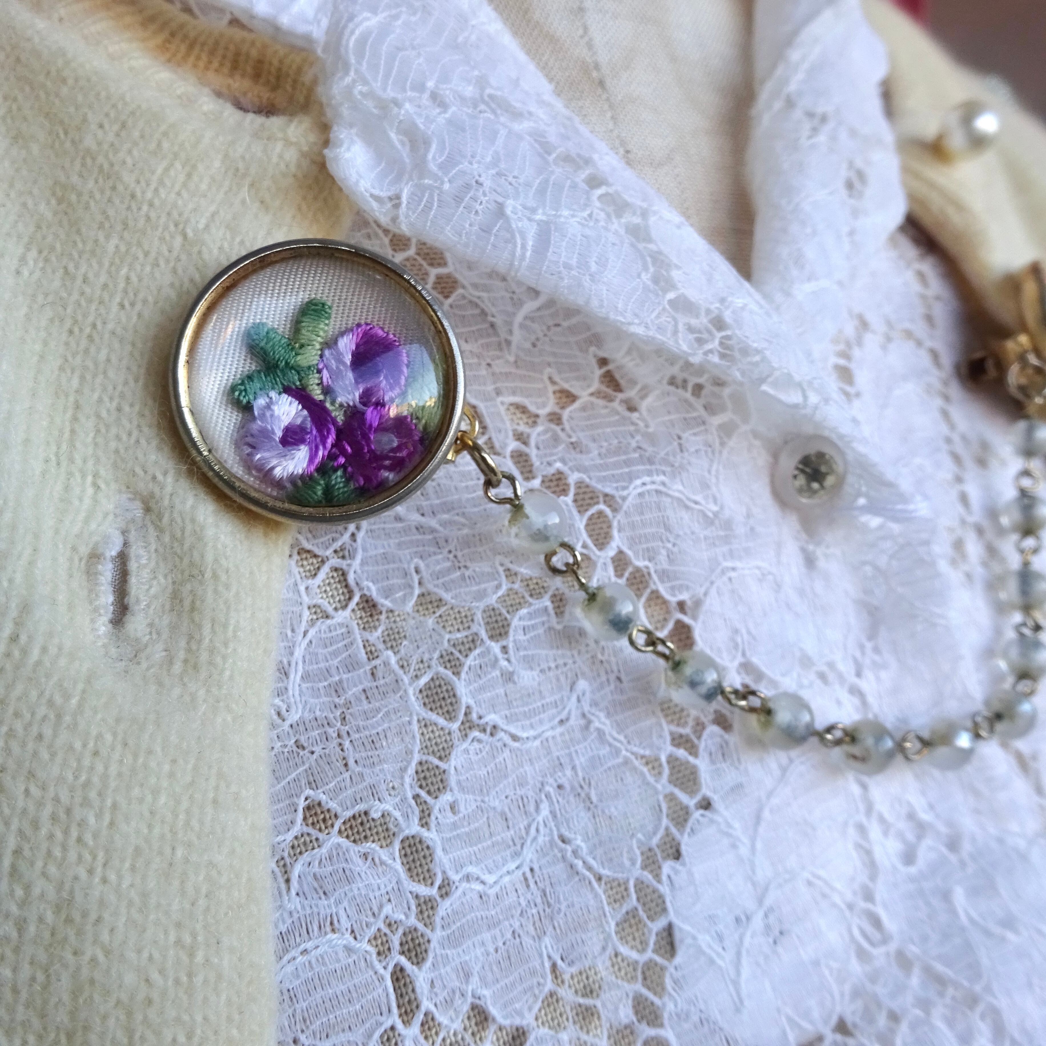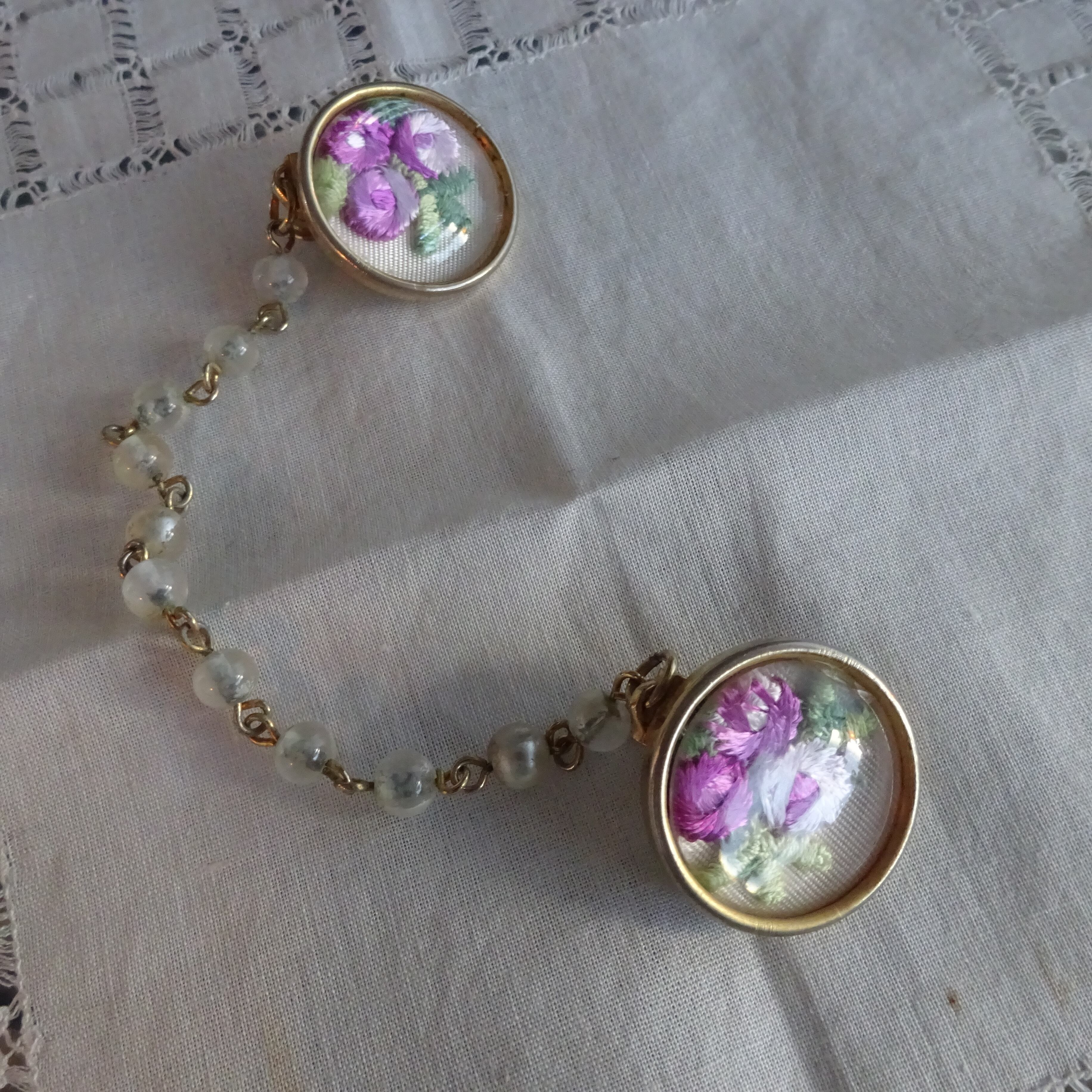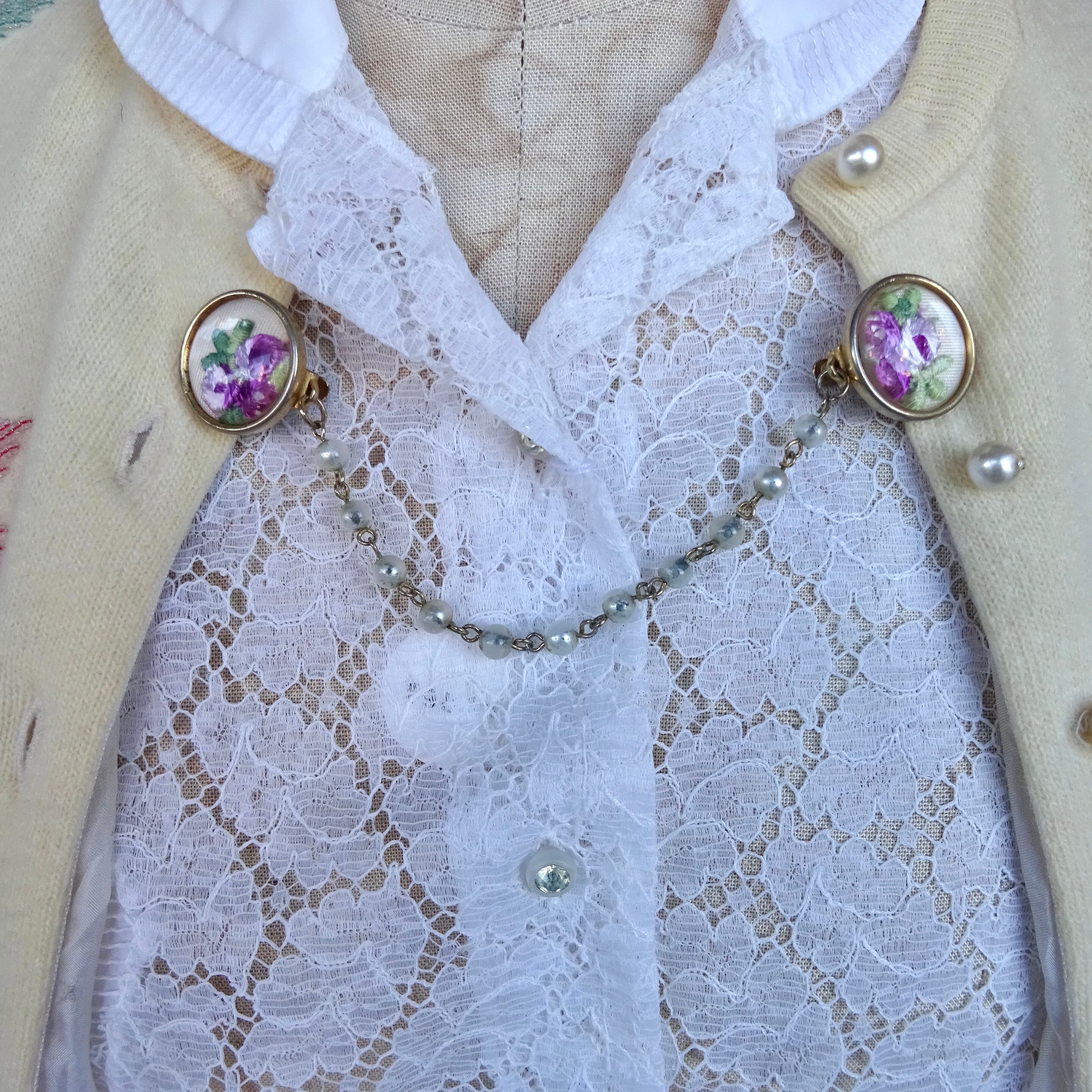 ドーム型のガラスに手刺繍の薔薇が閉じ込められた可愛らしいカーディガンクリップ