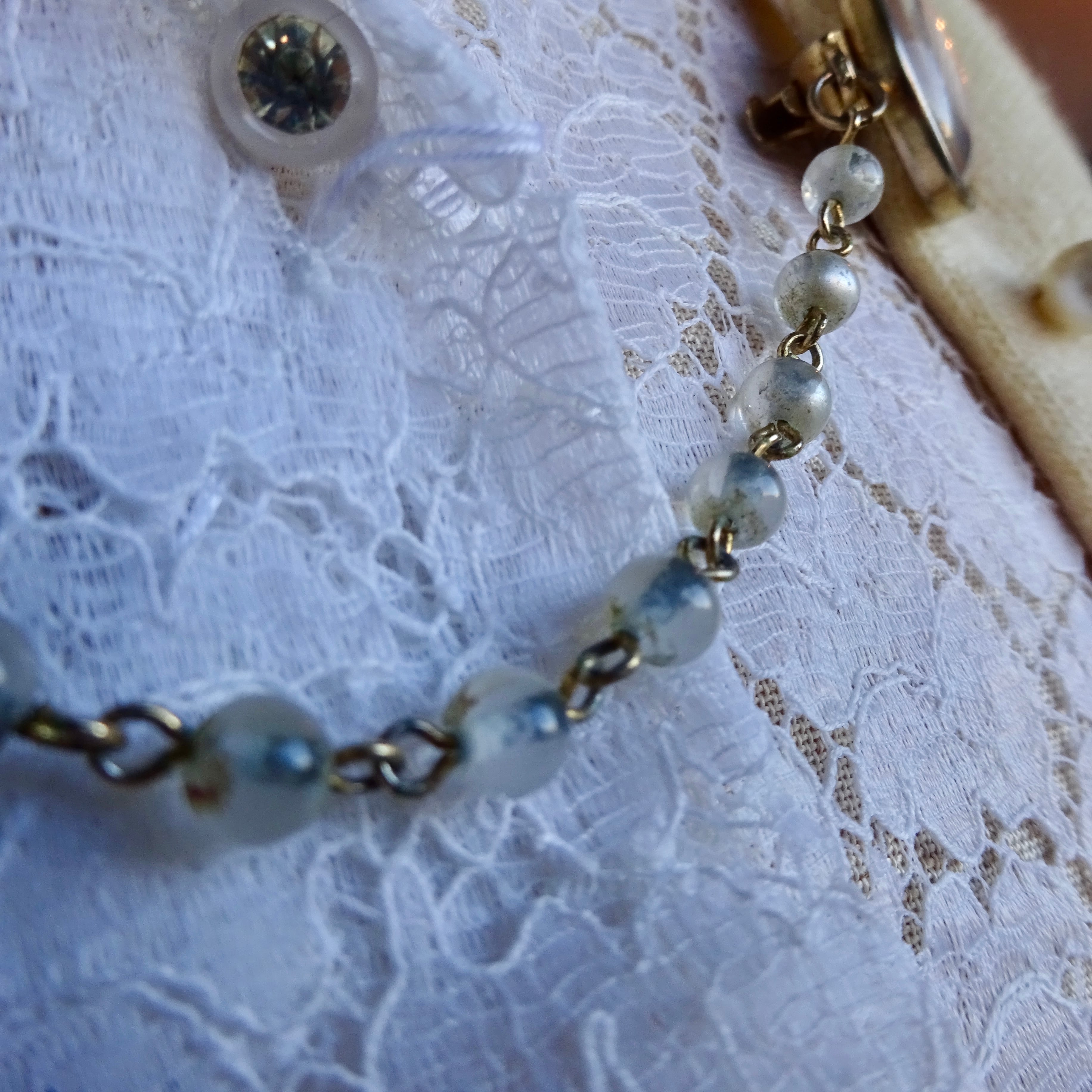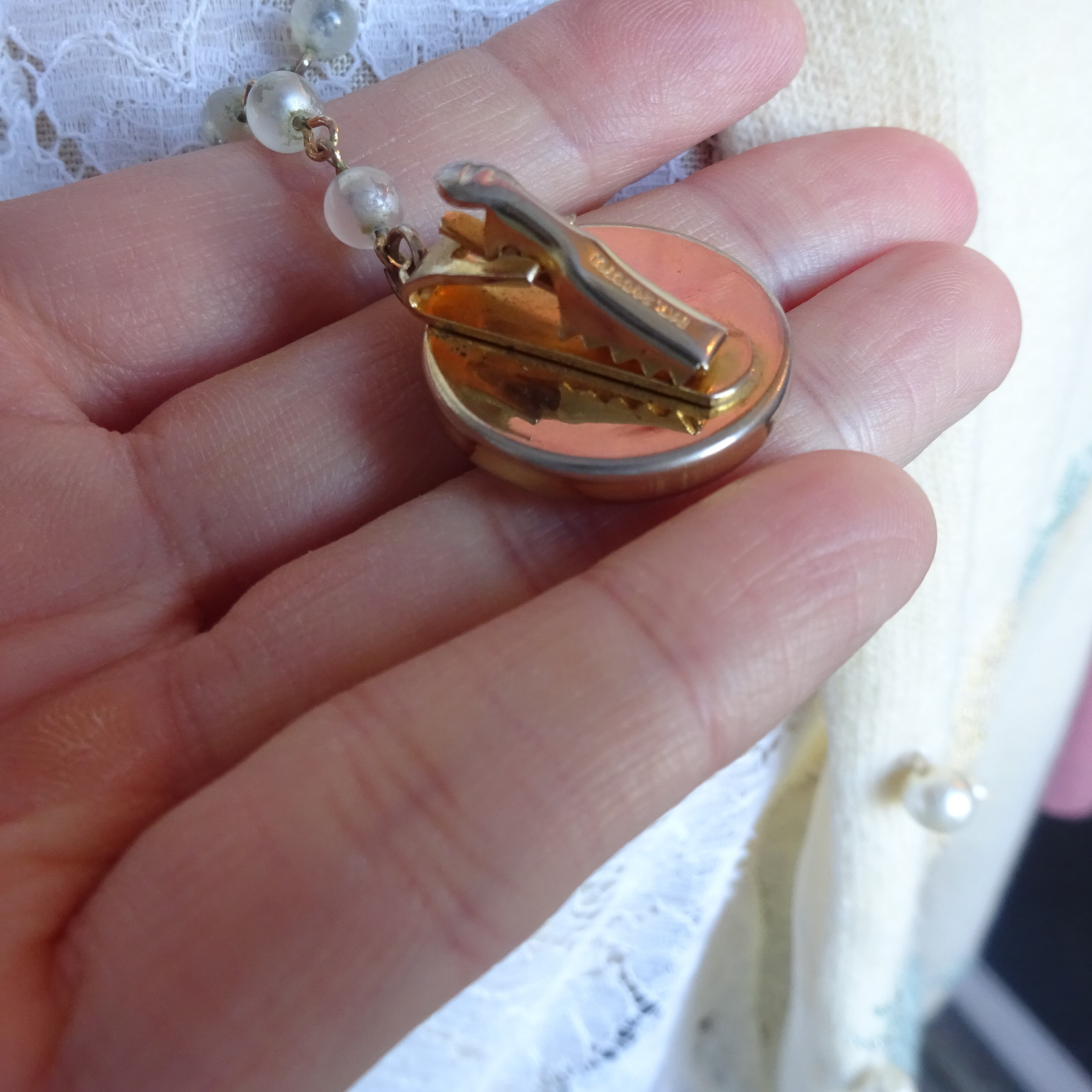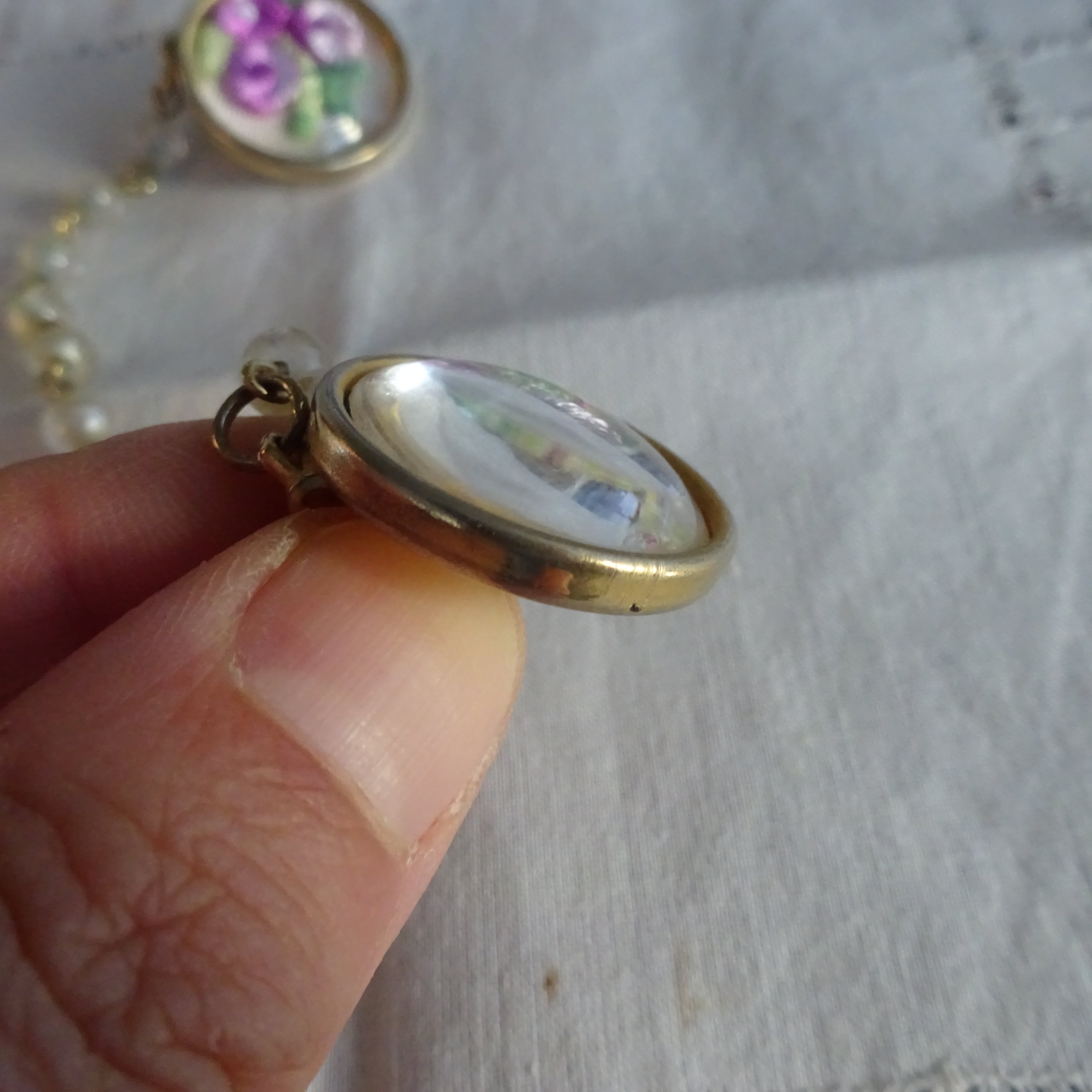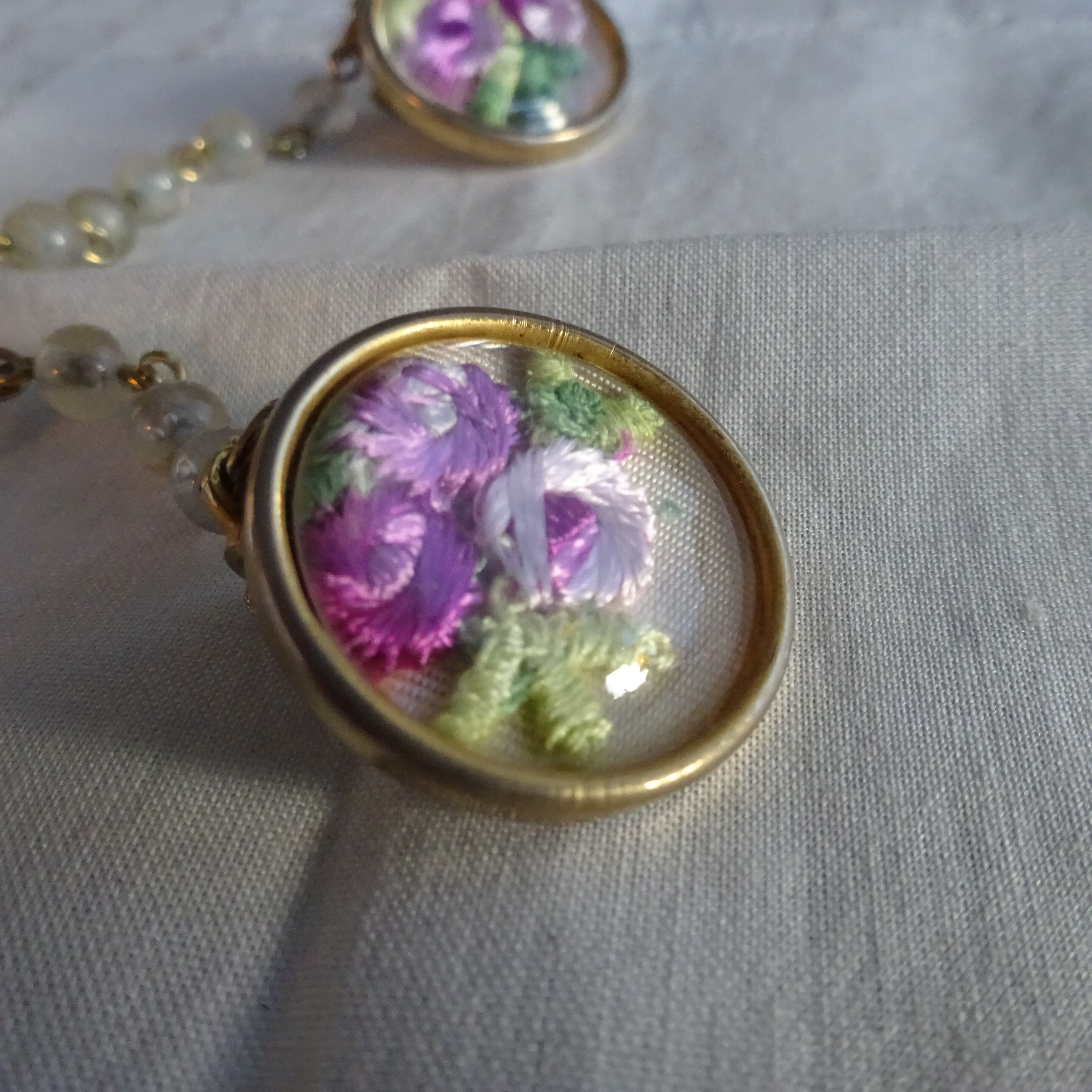 ドーム型のガラスに手刺繍の薔薇が閉じ込められた可愛らしいカーディガンクリップ