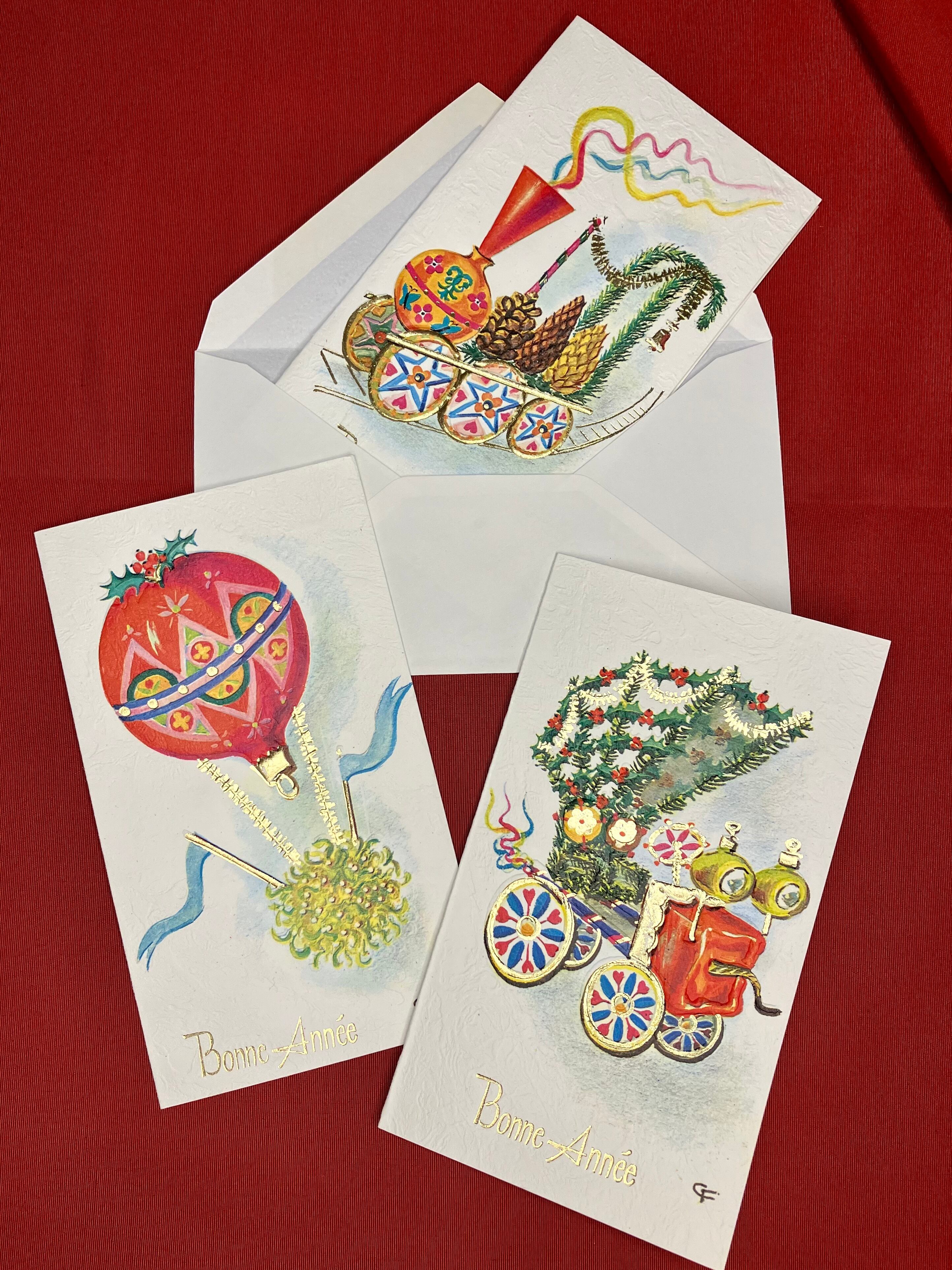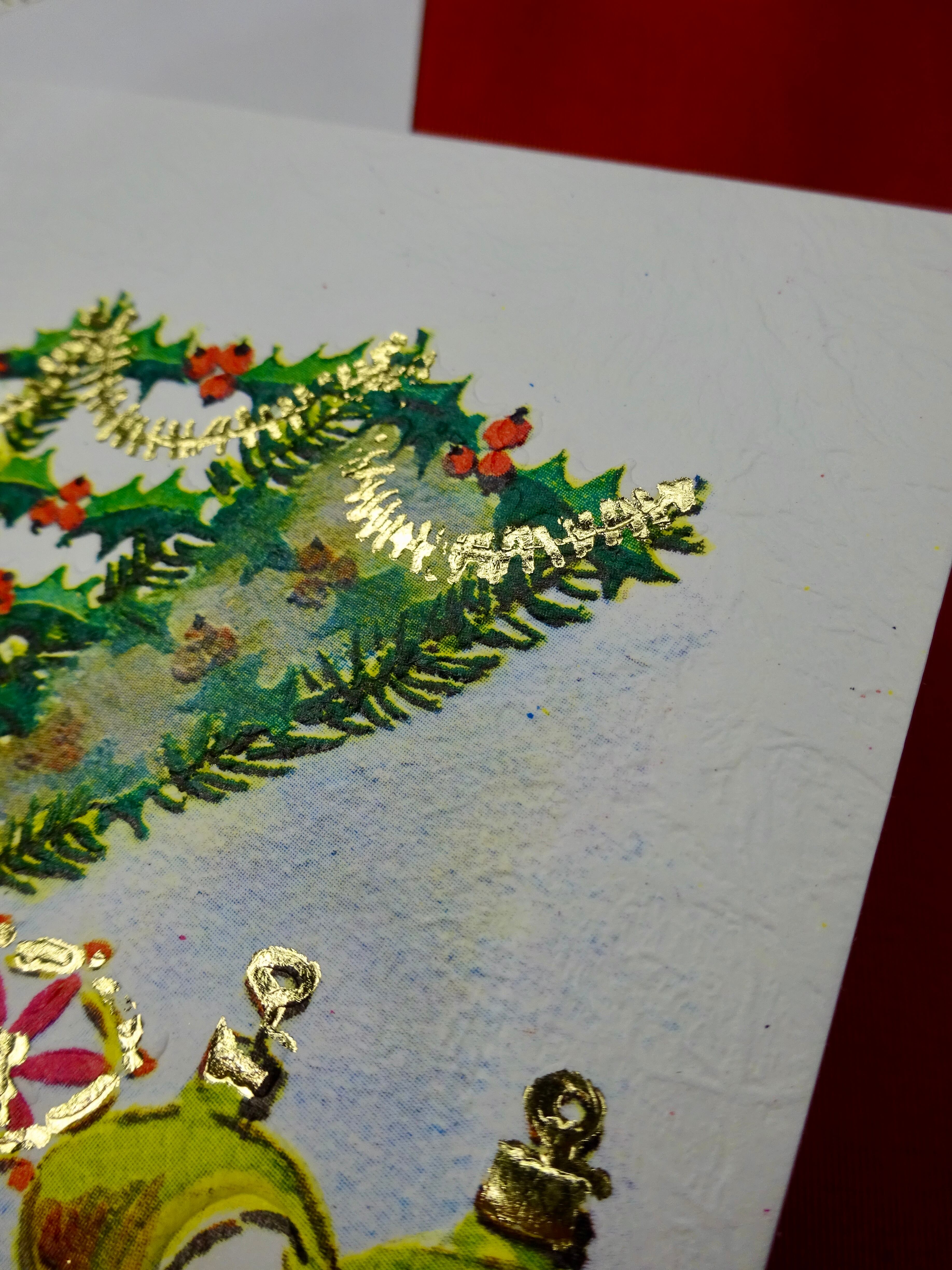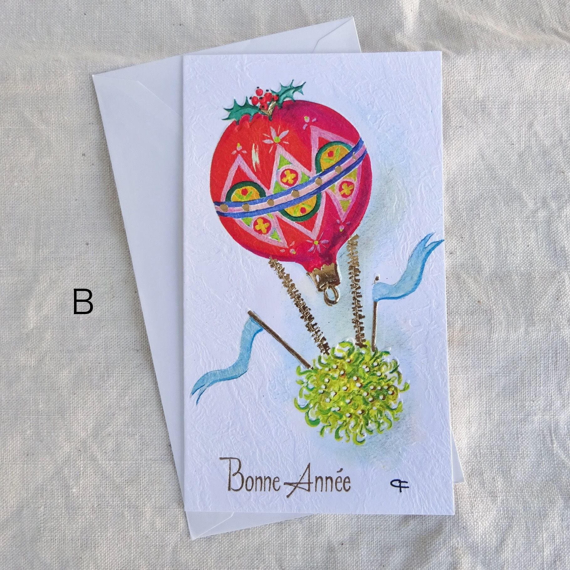 手描きタッチのクリスマスオーナメントはキラキラと金彩してあって、クリスマス独特の幸せムードに包まれたとても可愛らしいカードです。