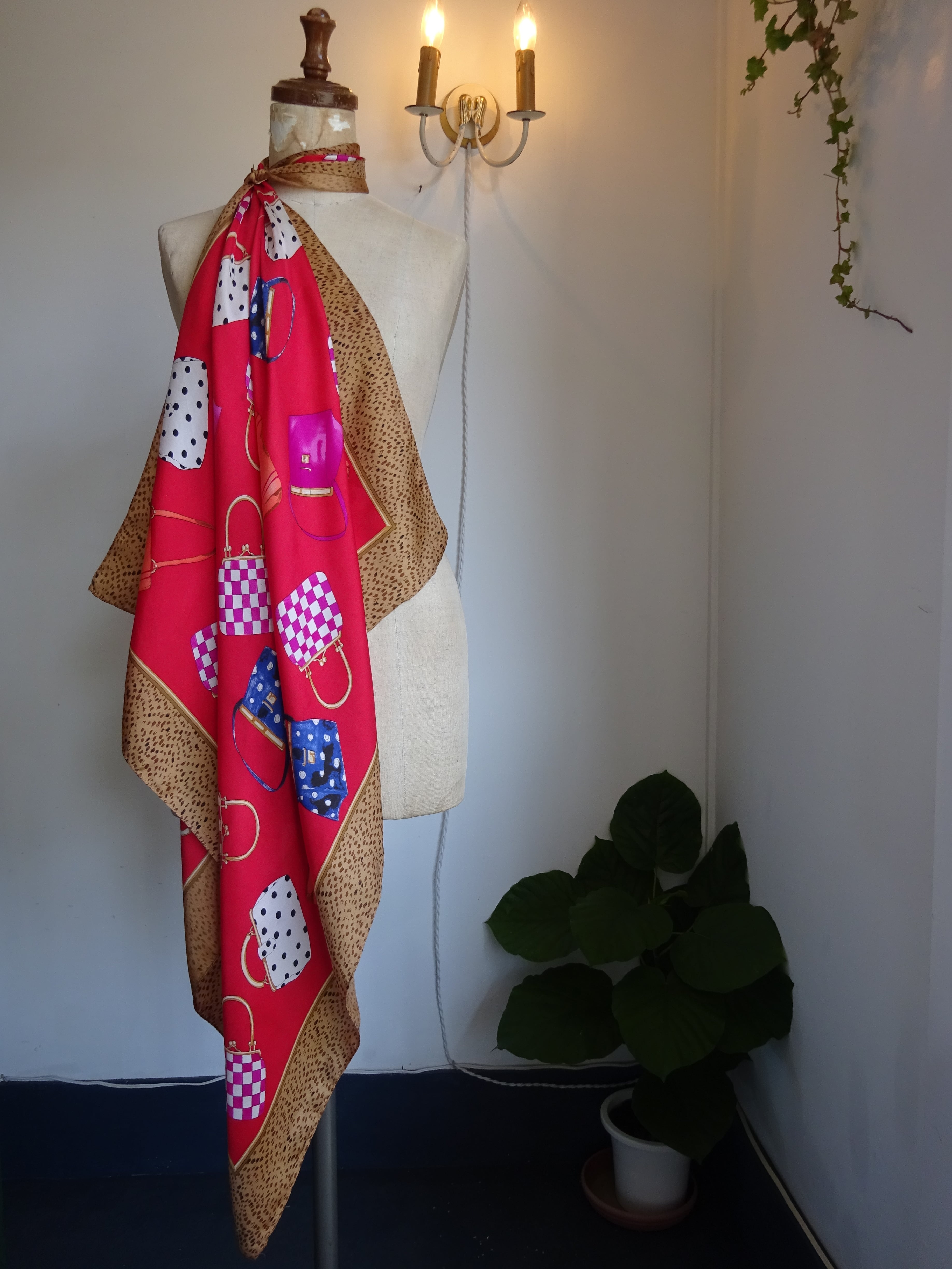 とても大判で首や頭、腰や胸など小物の域を超えてむしろお洋服まで担ってしまう万能スカーフ