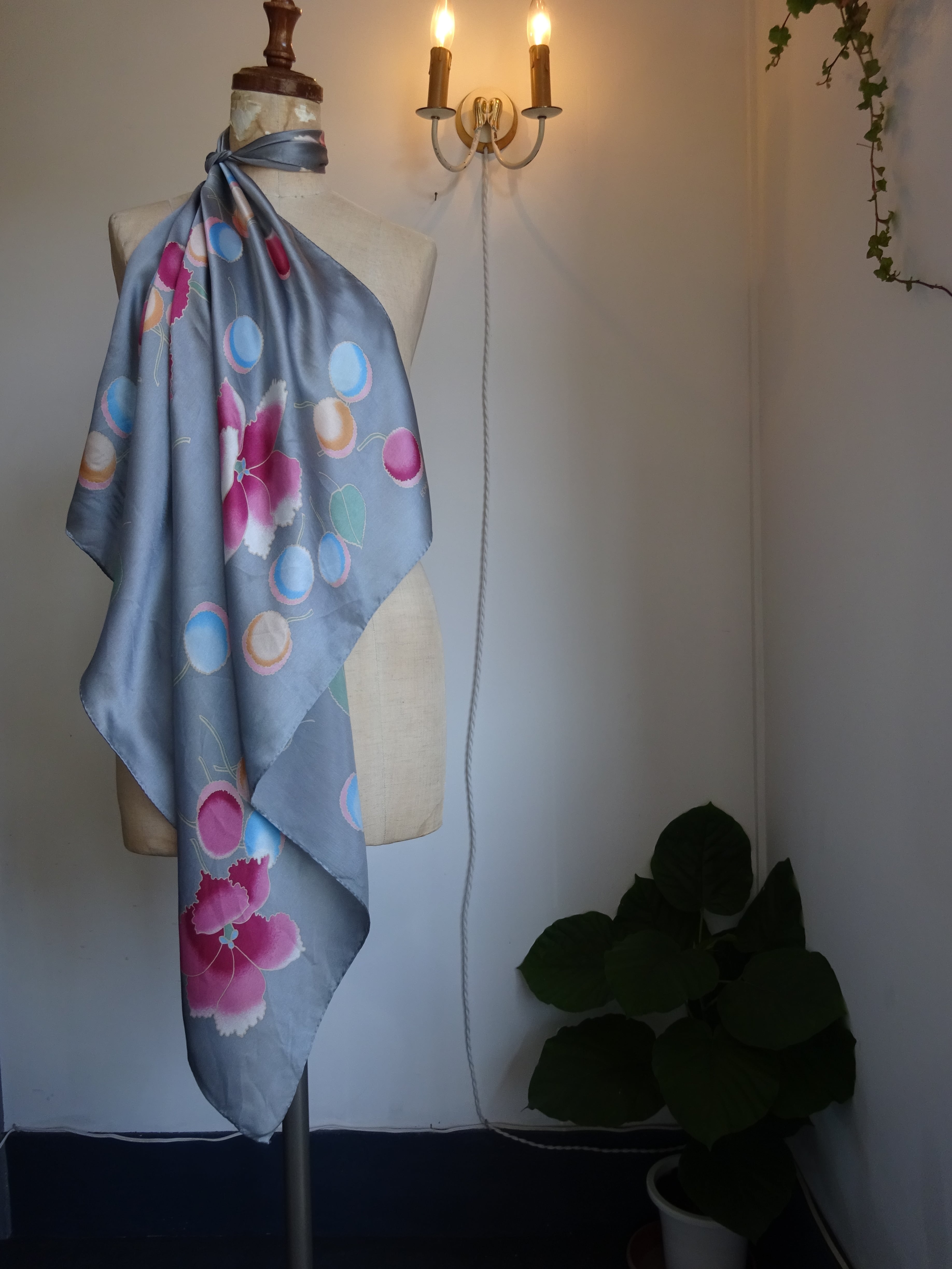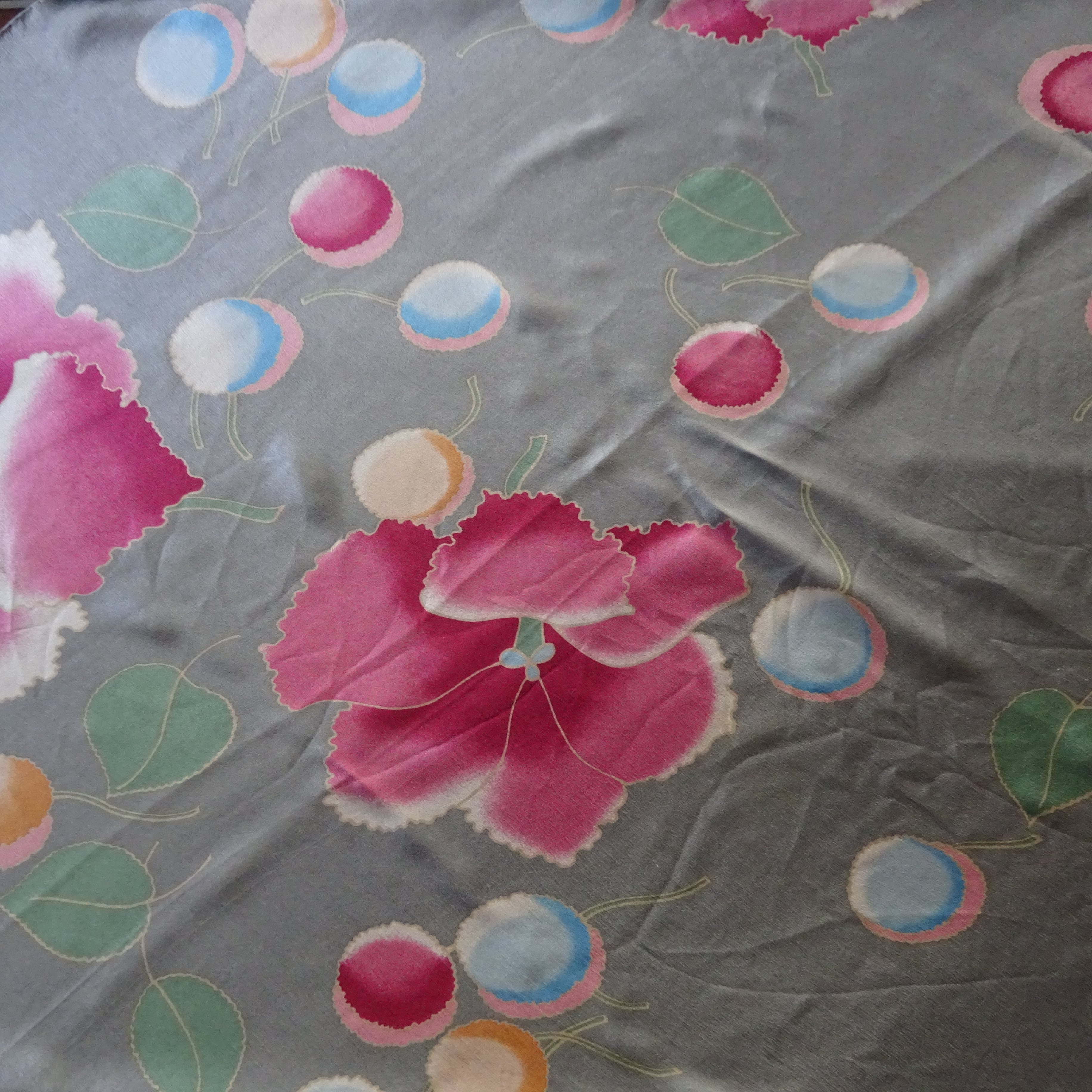 淡い色合いがとても可愛らしく、色遣いや柄の雰囲気からどことなく着物っぽさを感じる一枚です。