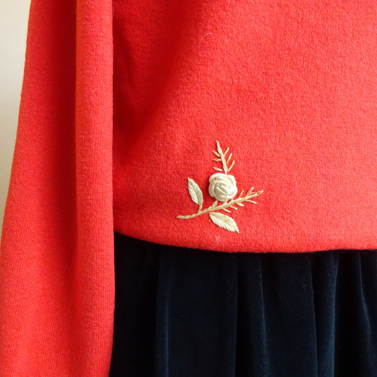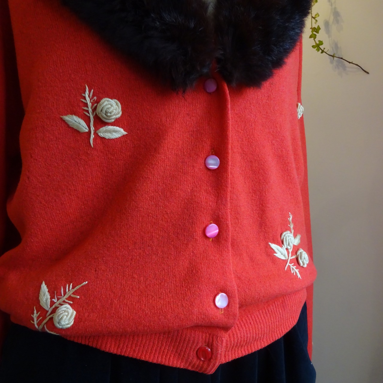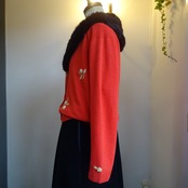珍しい赤ボディーの刺繍カーディガンにラビットファーの襟がついた可愛いカーディガン