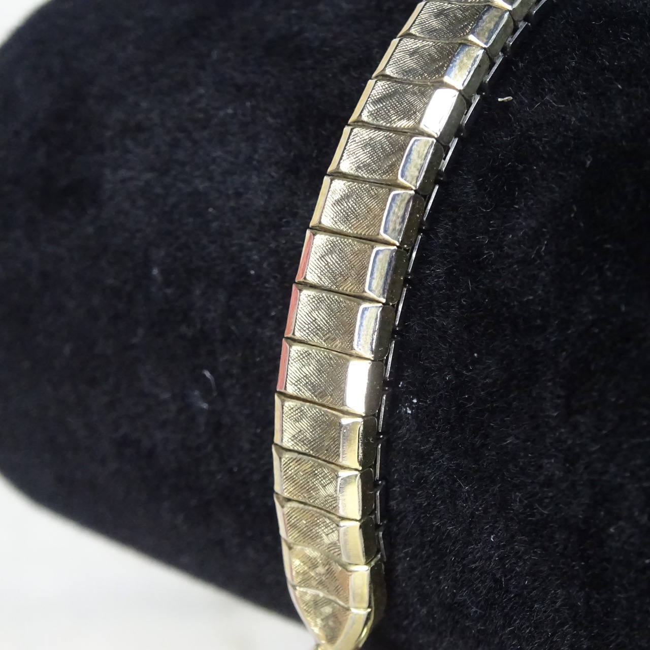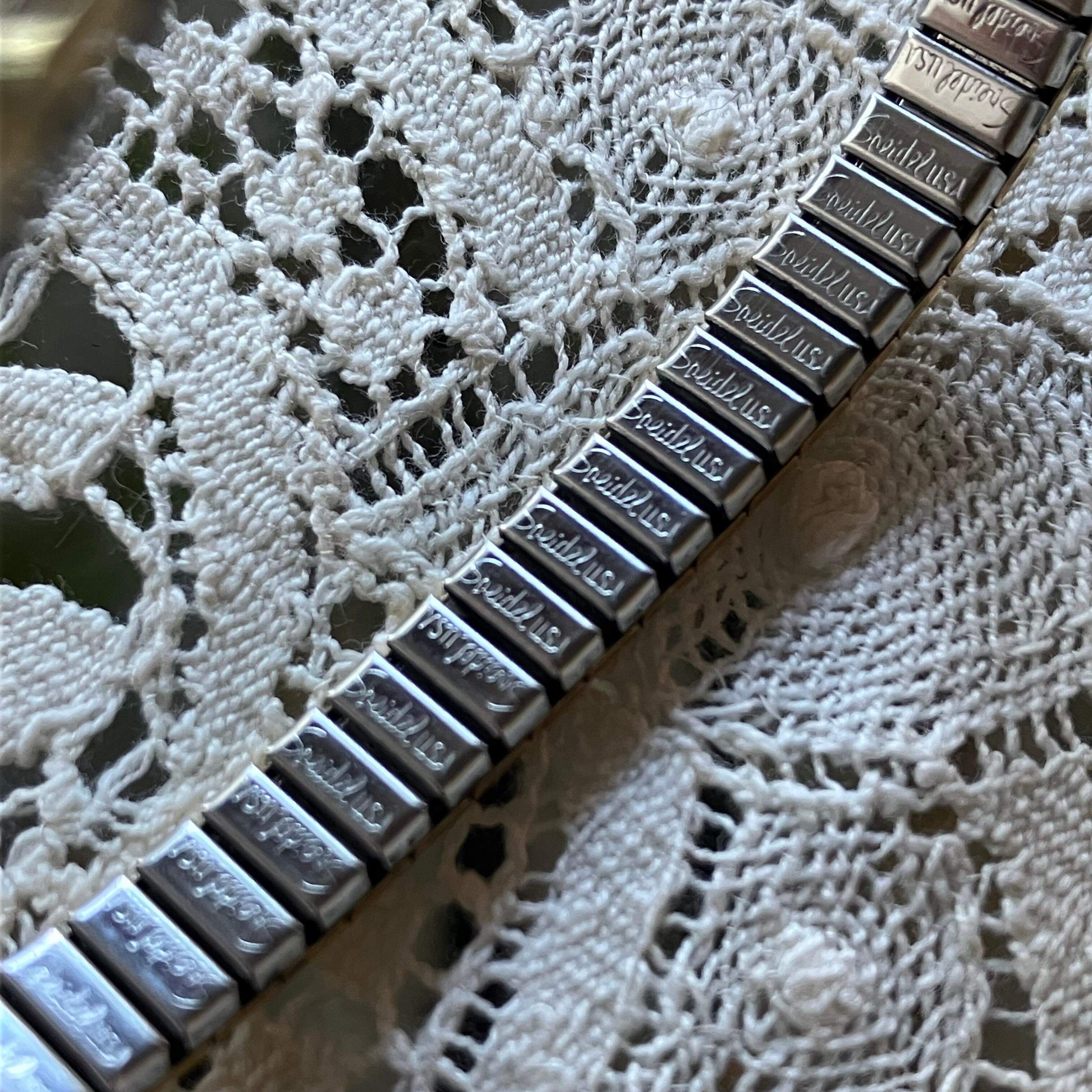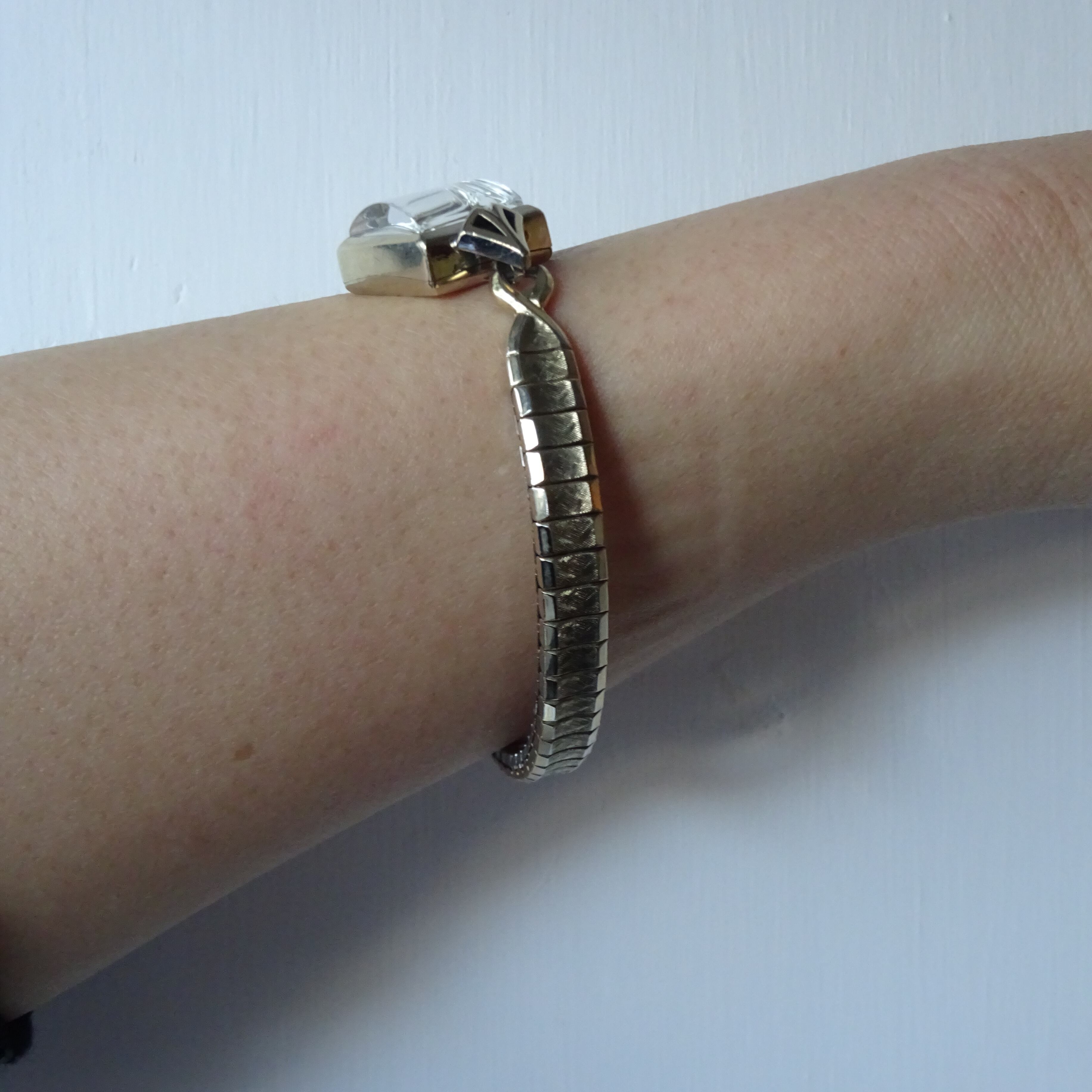 黄色が弱いゴールドトーンなので、シルバーのアクセサリーにも合わせやすく、フレックスバンドですが比較的大きめなのでブレスレット感覚でお使いいただけます。
