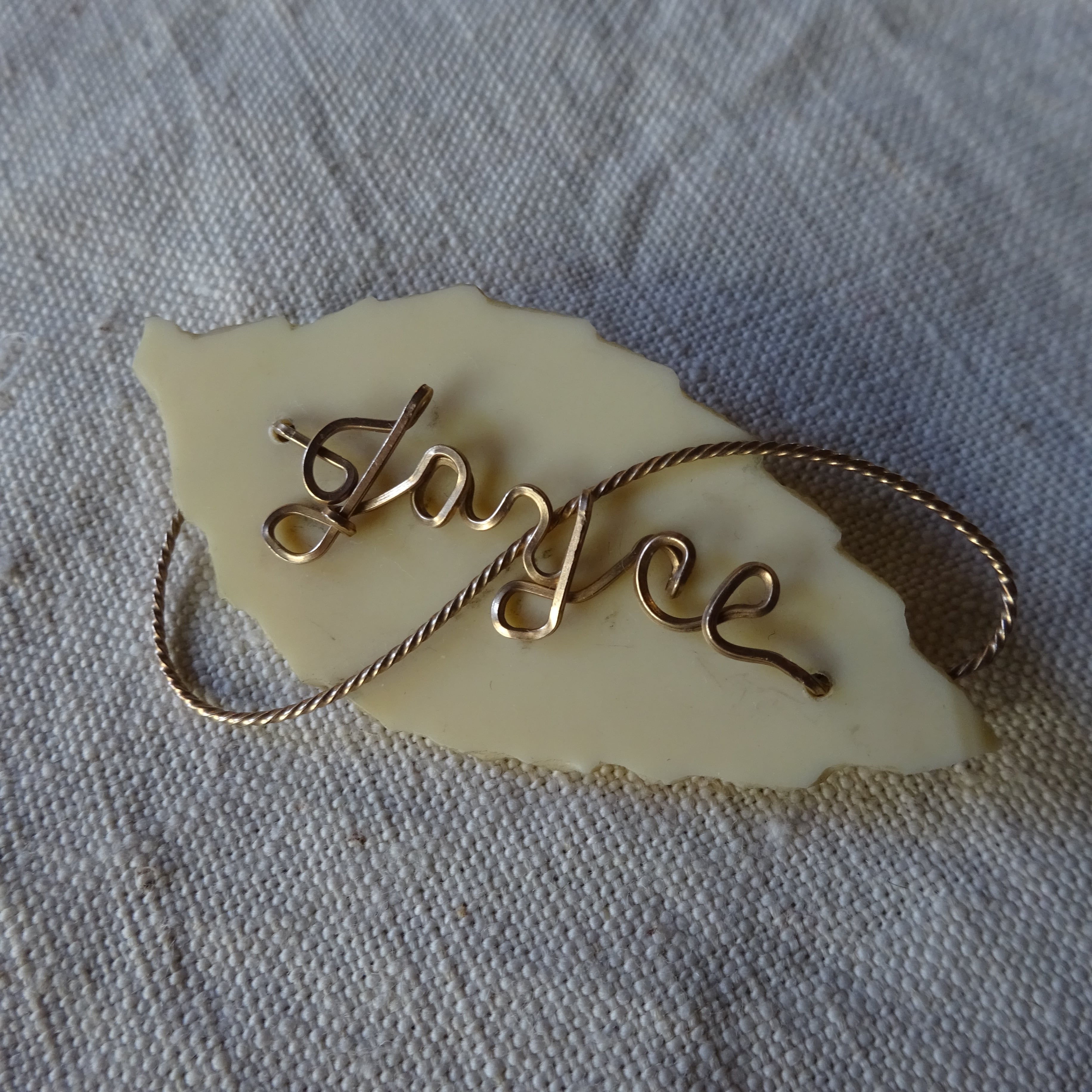"Joyce" と書かれたワイヤーのネームブローチ