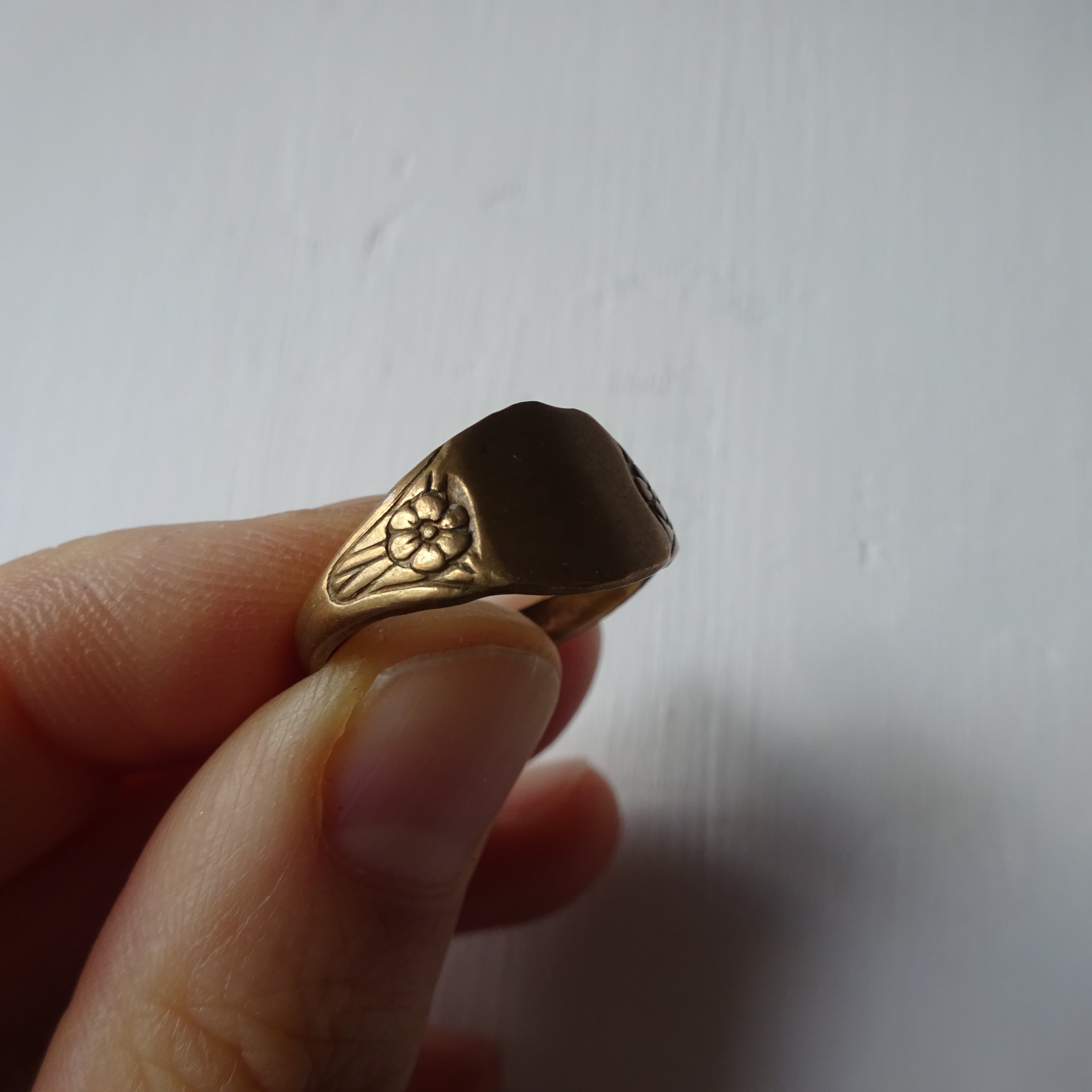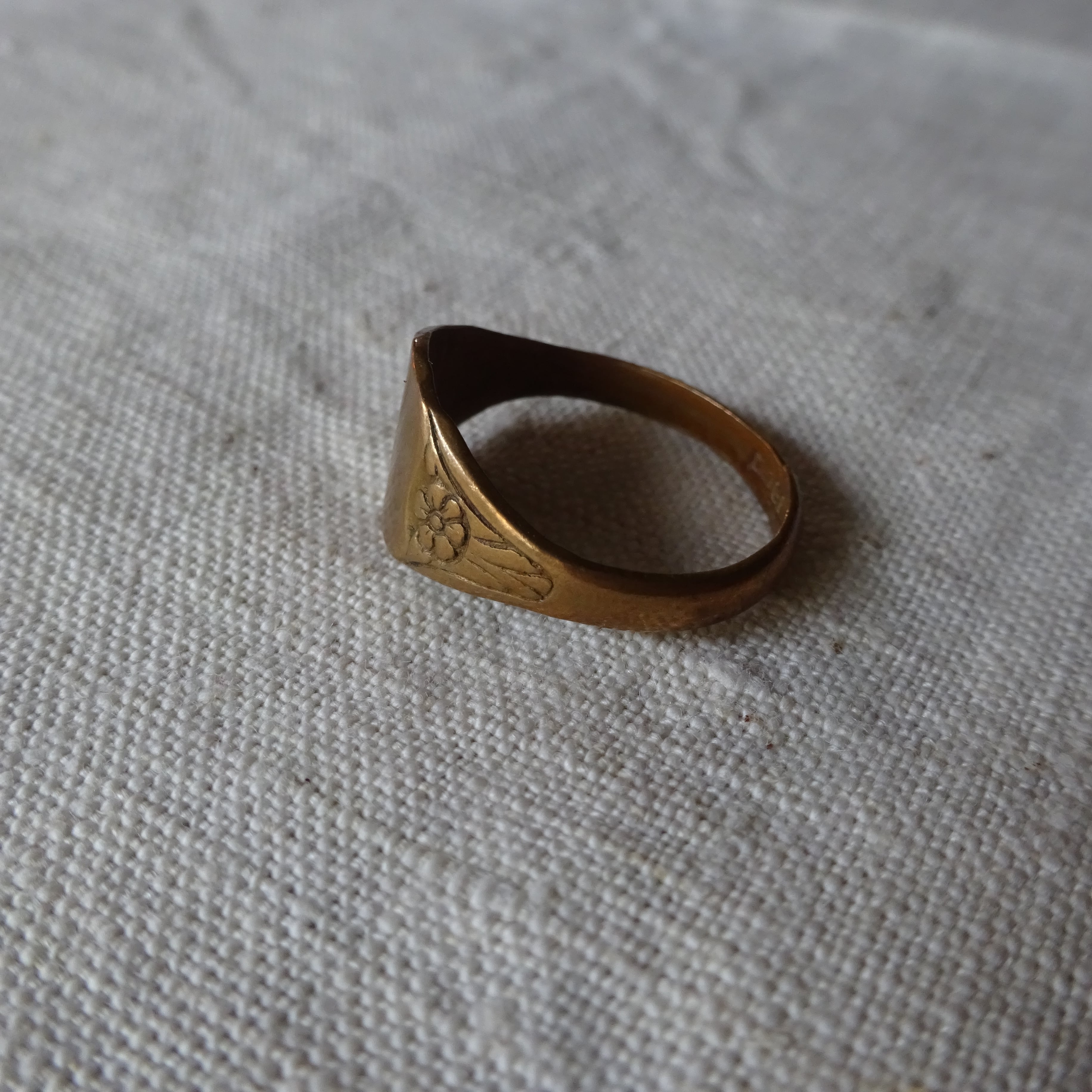 サイドにお花が彫り込まれている真鍮のシグネットリング