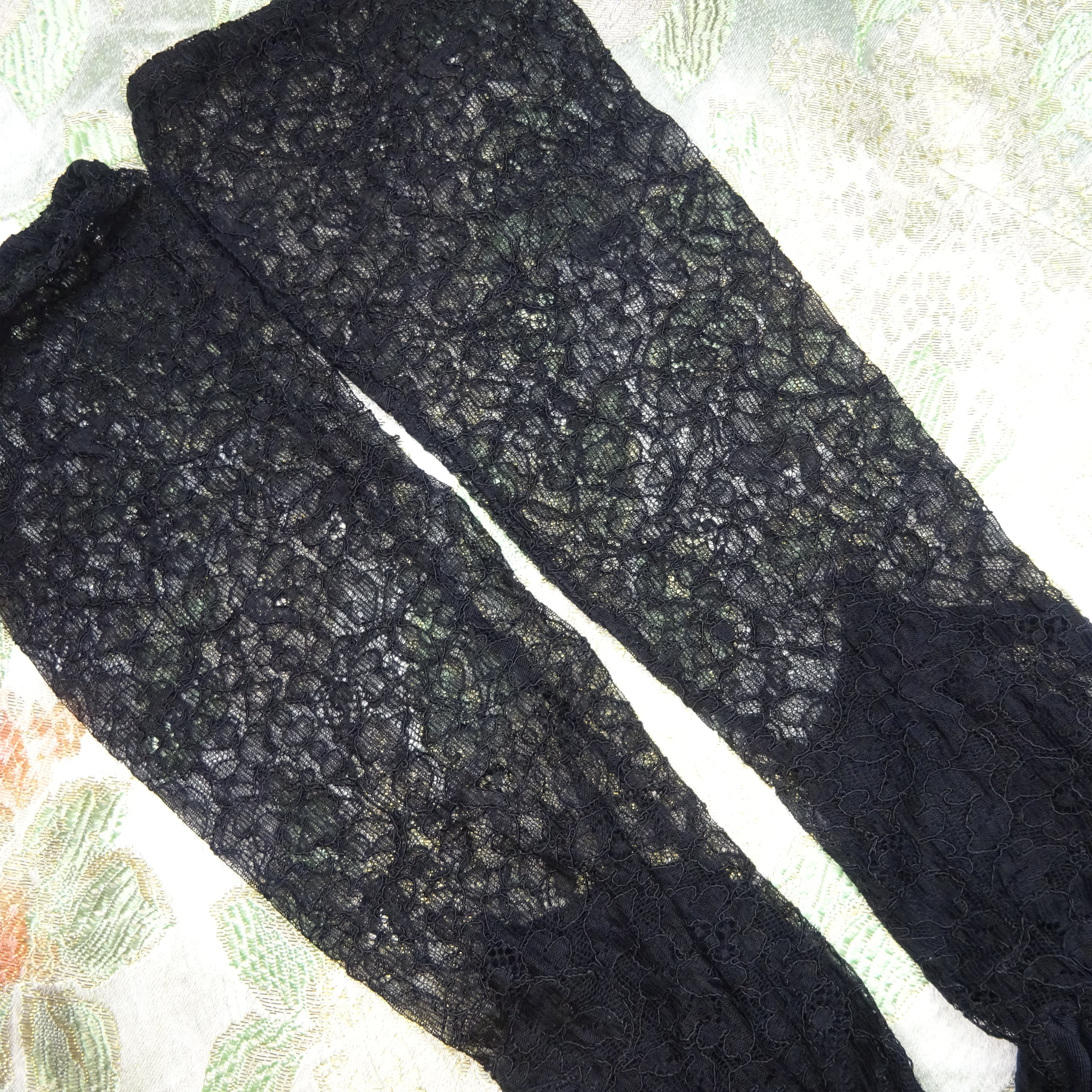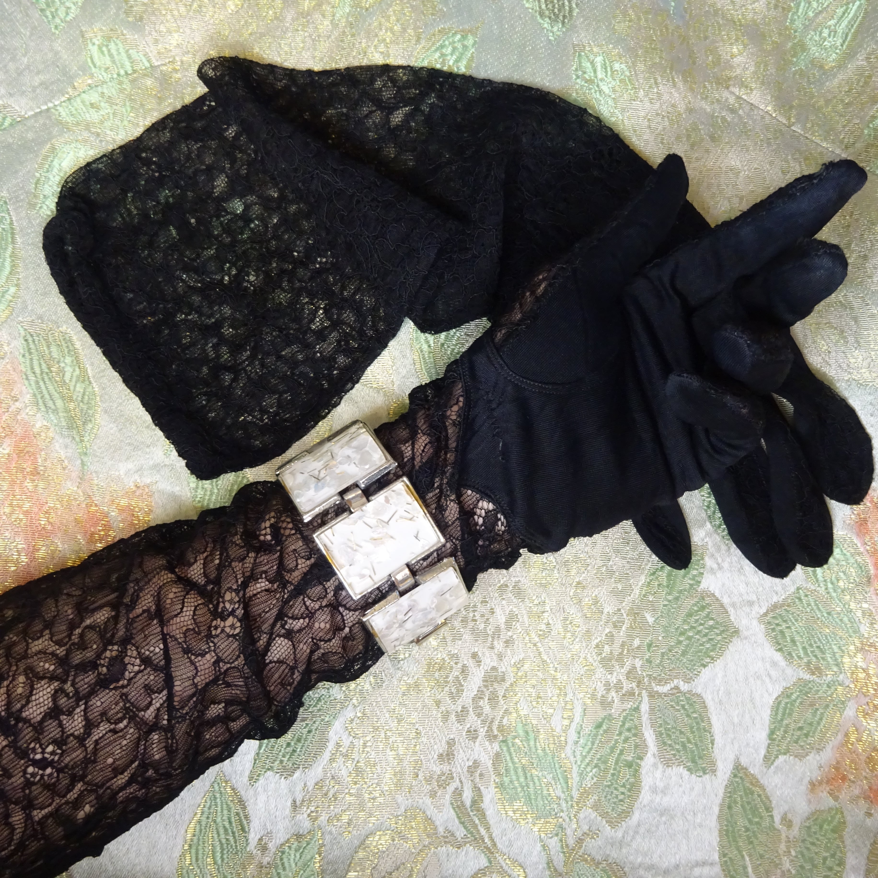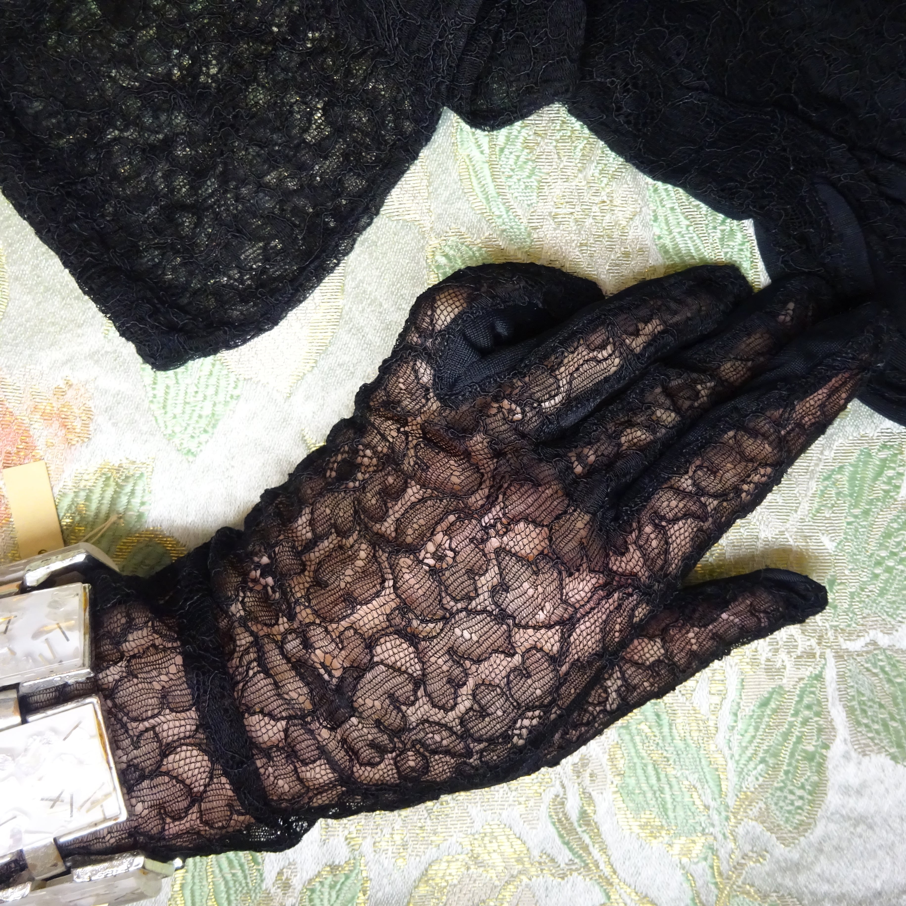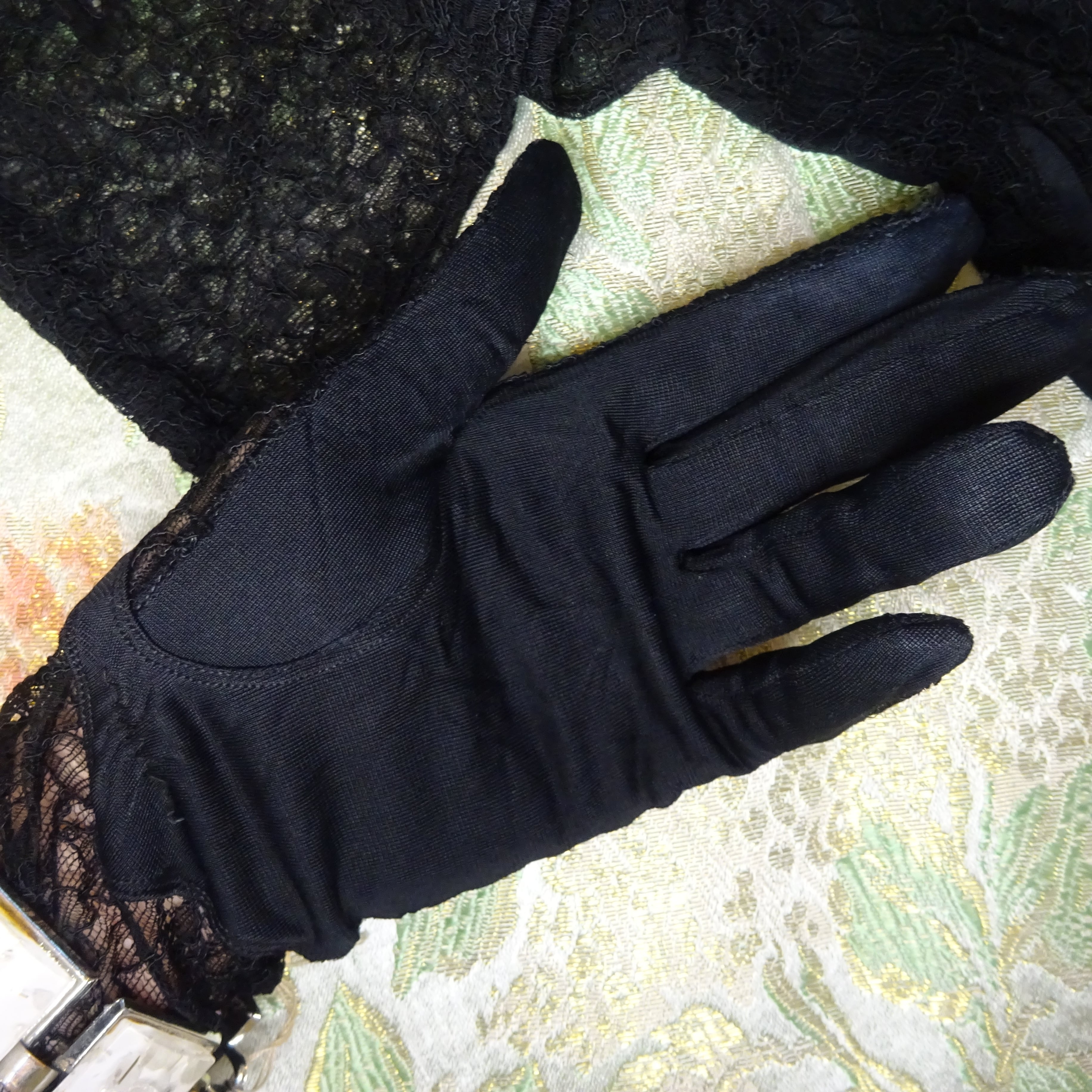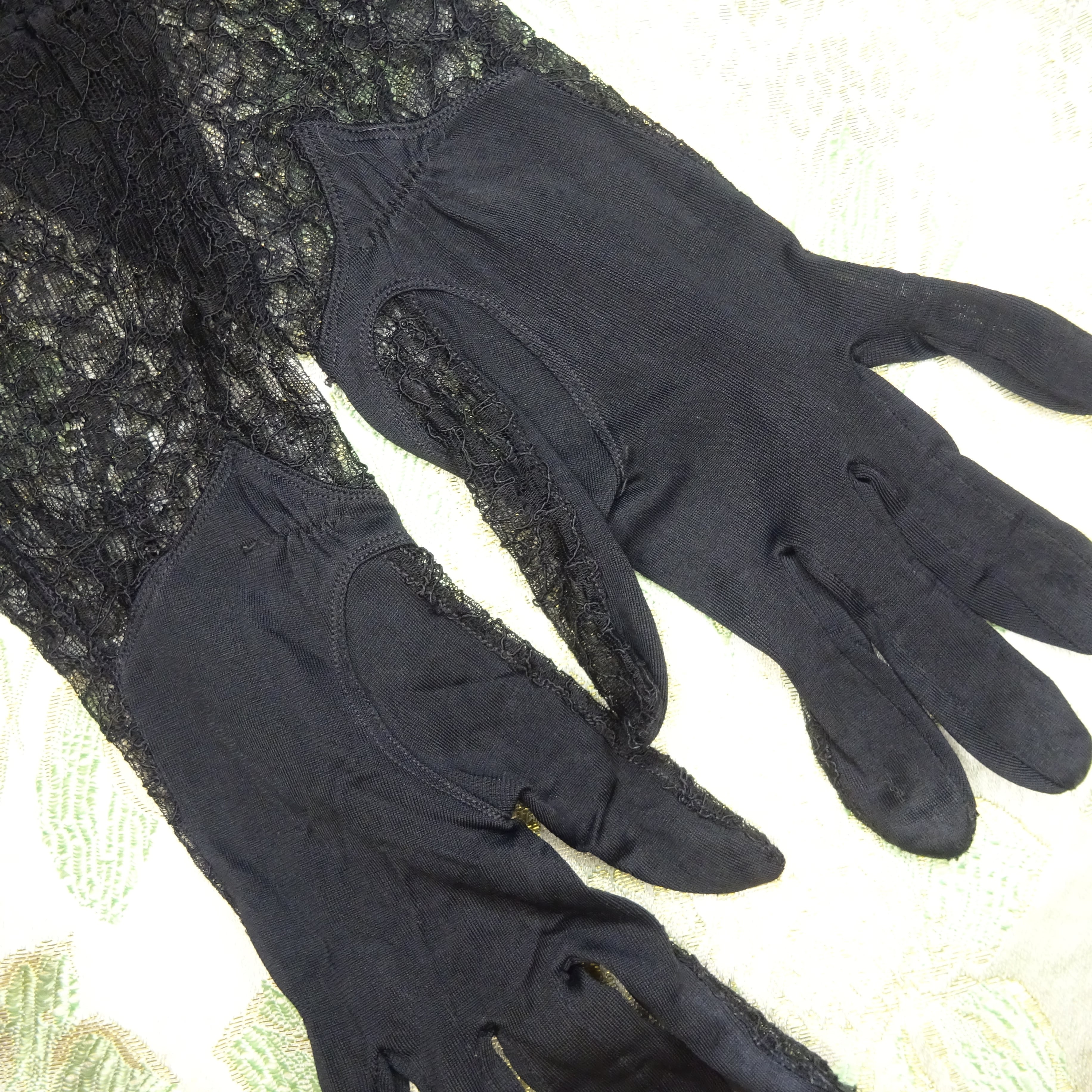肘のあたりまであたるロングタイプですが、クシュっと緩めて装着しても可愛いし、ヴィンテージならではの繊細なレースと、手のひら側の生地の雰囲気やパターンがとてもエレガントです。