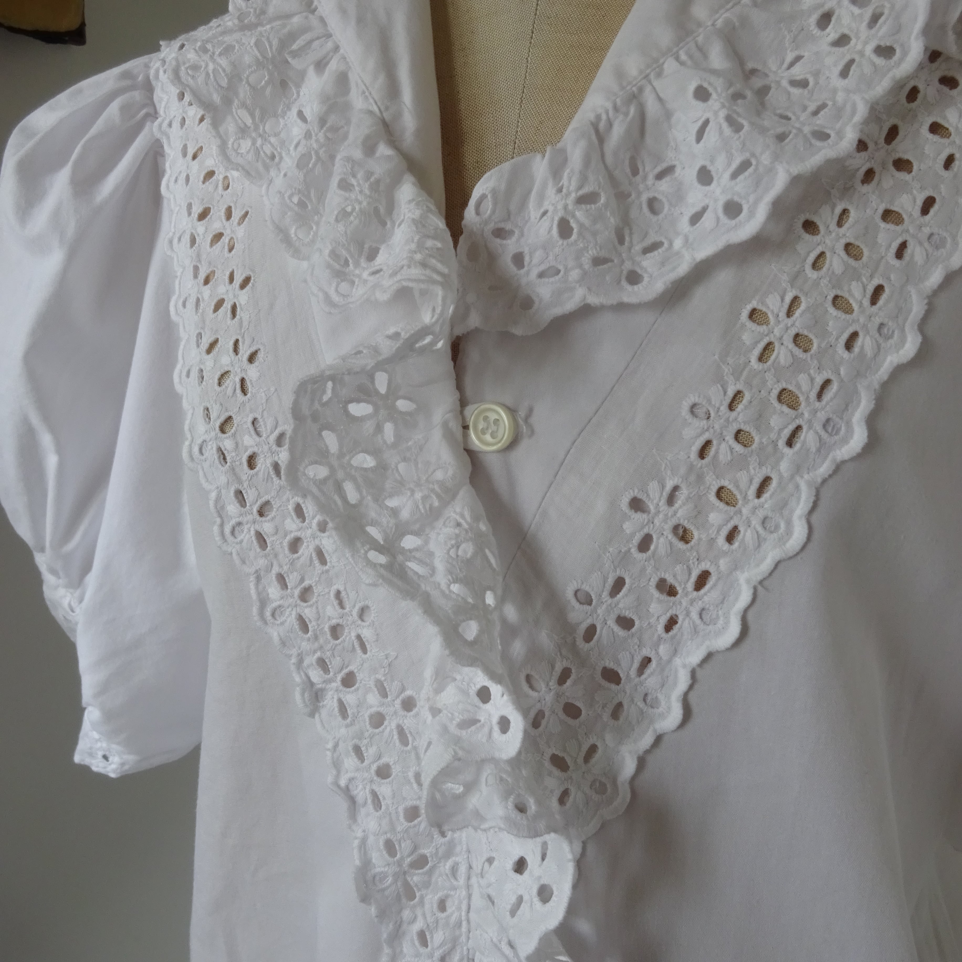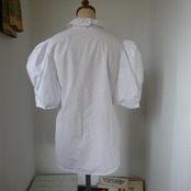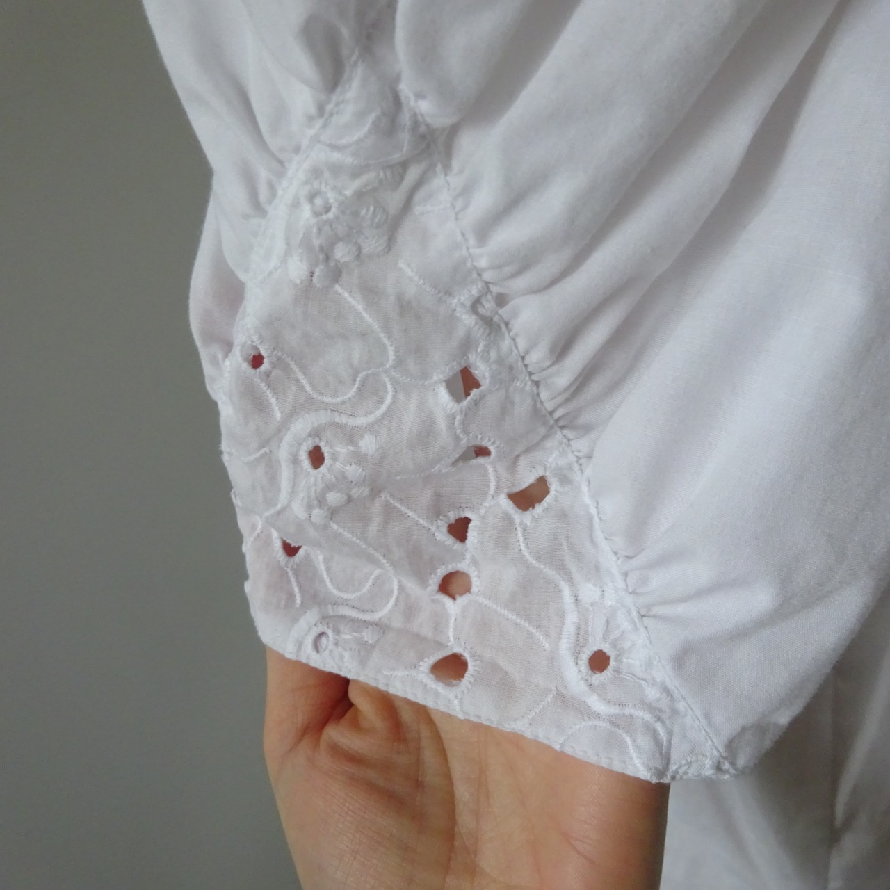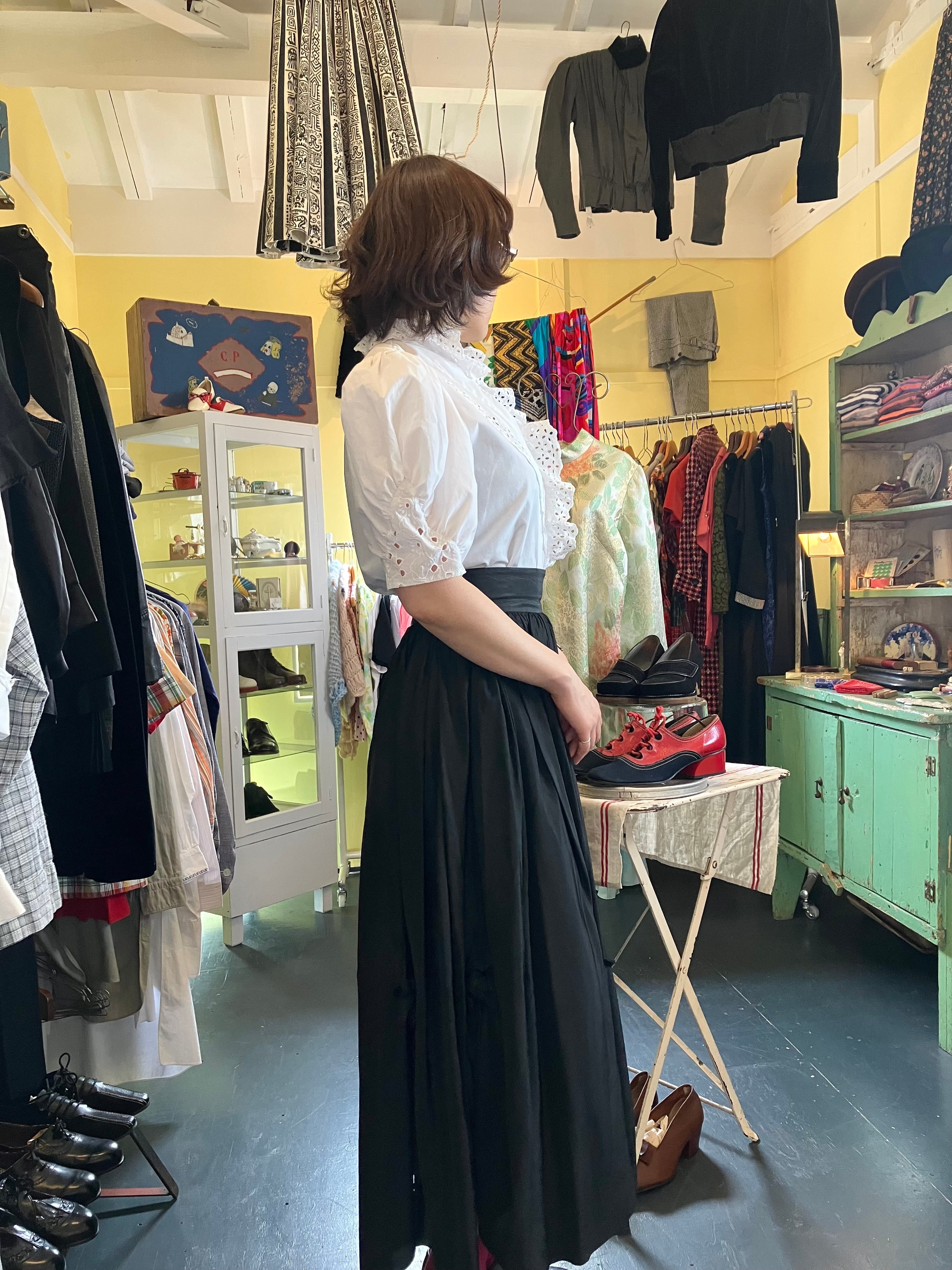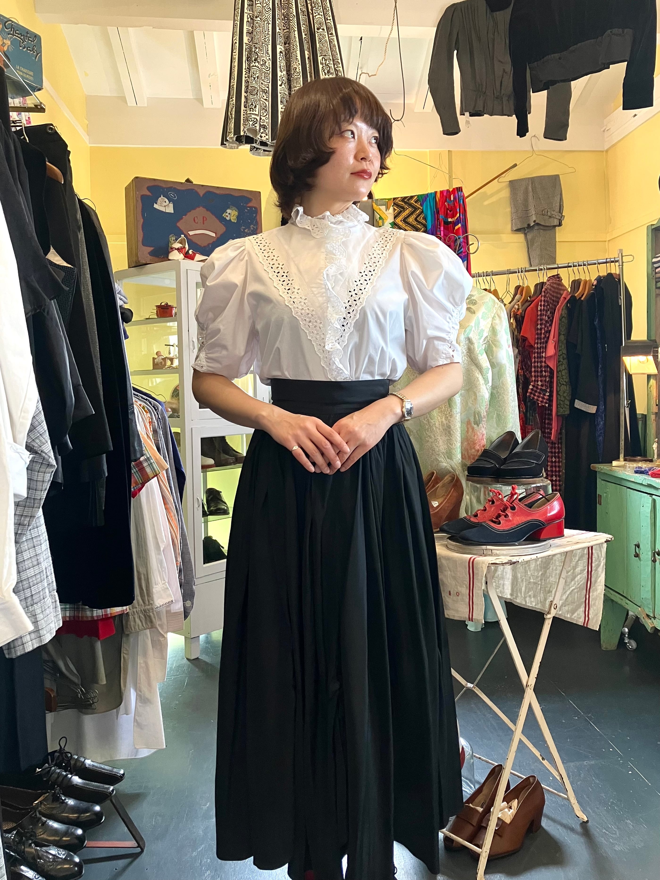 本来はこのブラウスの上からデコルテの開いたフィットアンドフレアのワンピースや、ふんわりしたスカートとエプロンを合わせたりするためのものです。