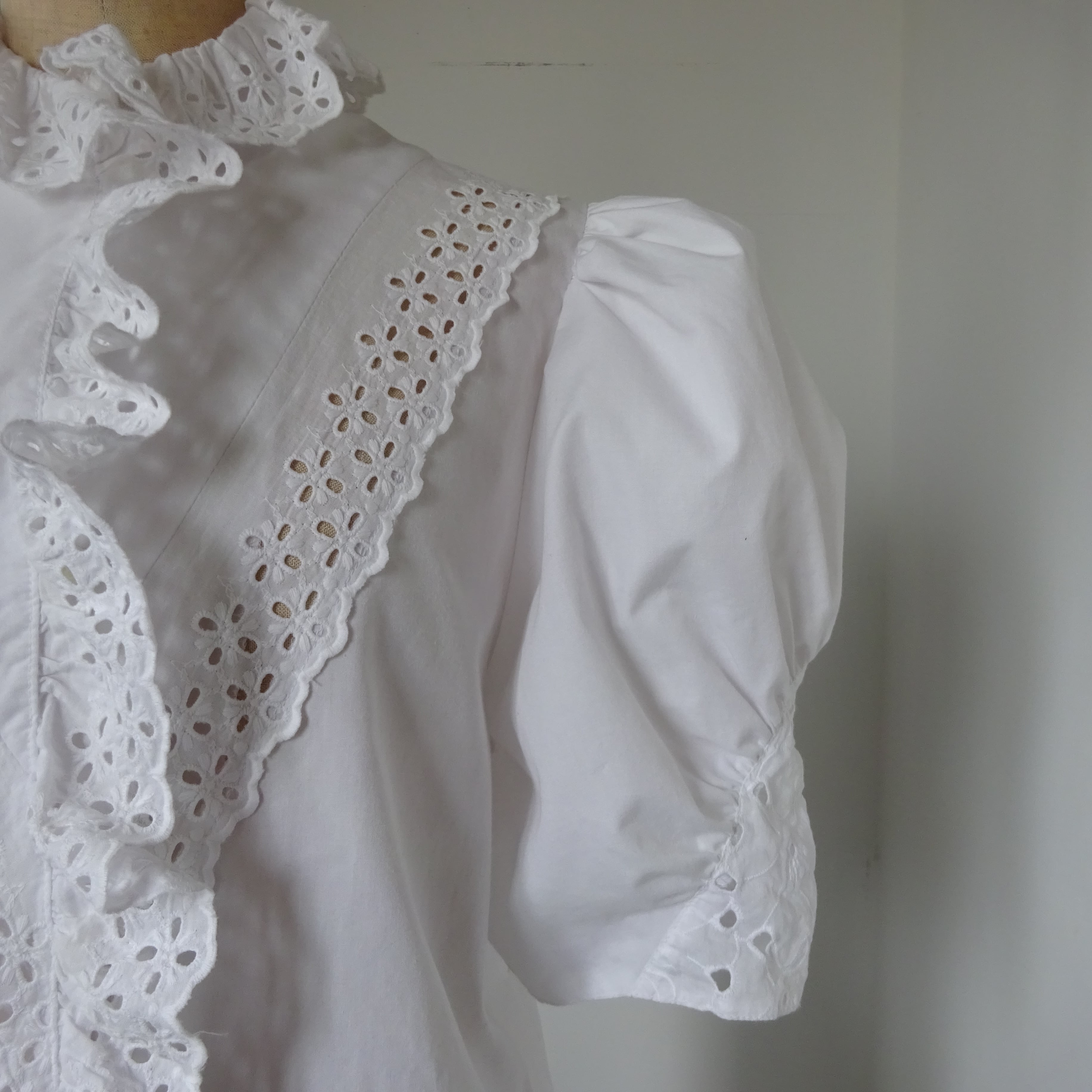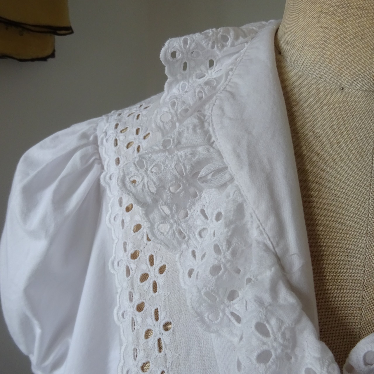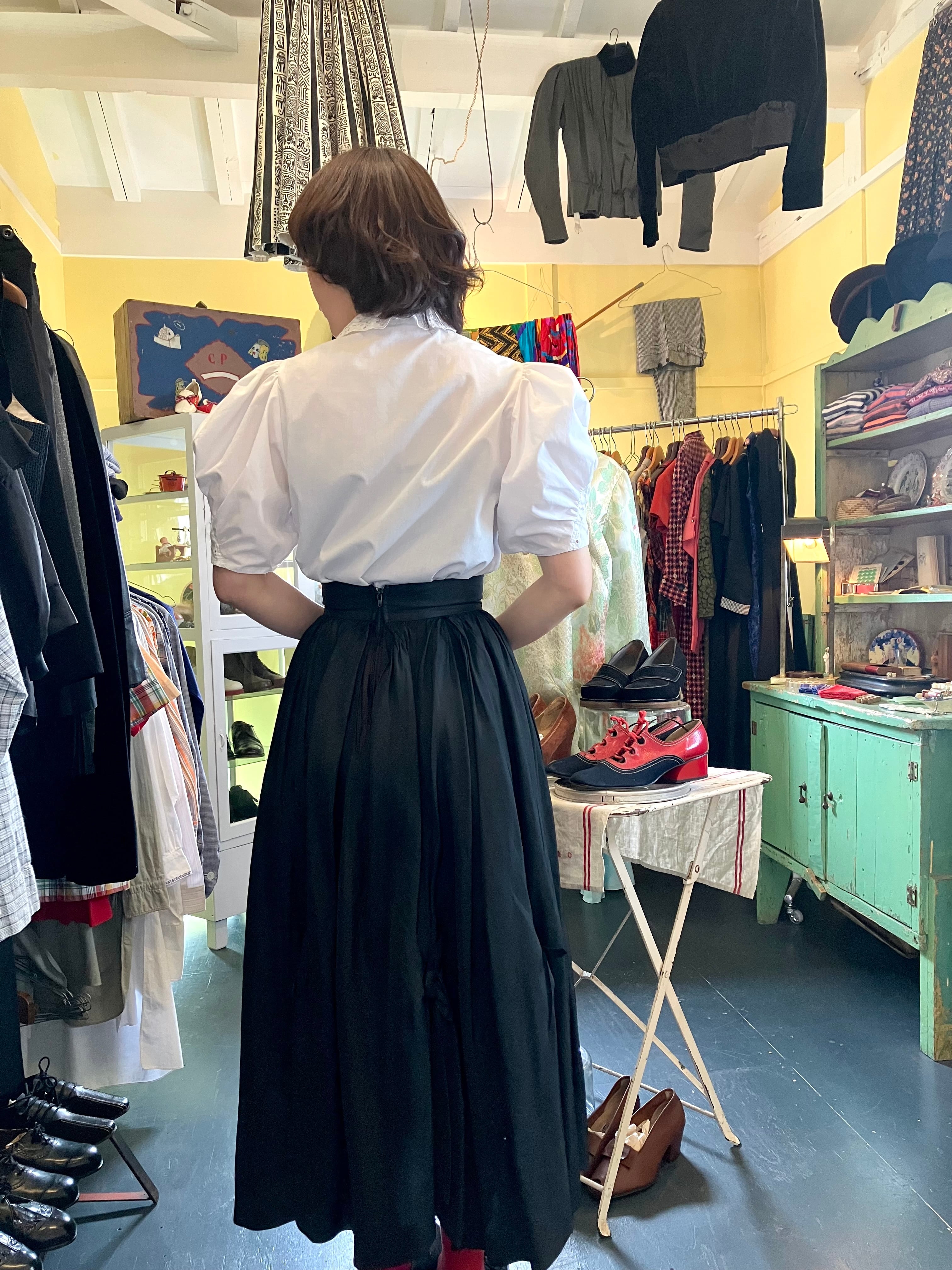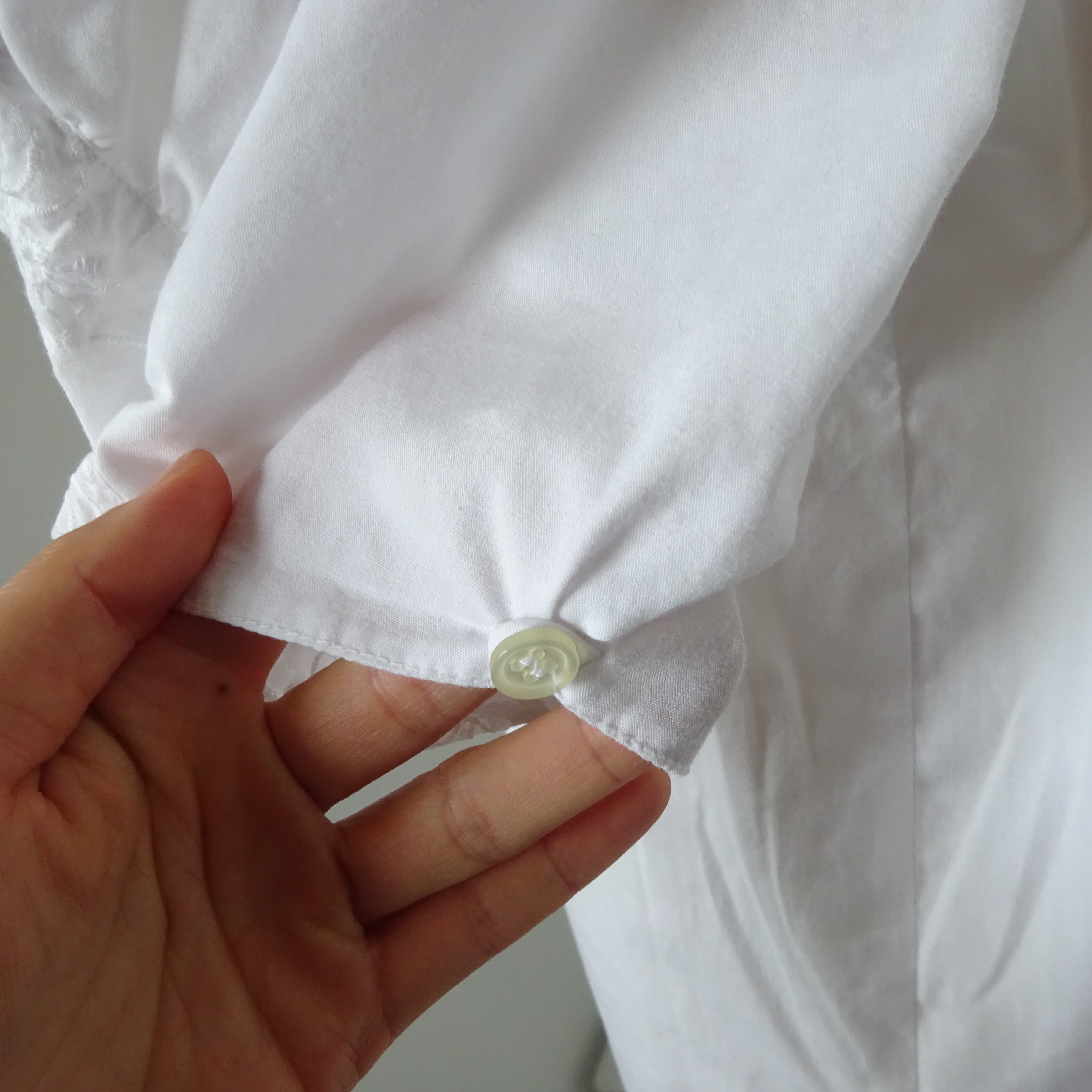 本来はこのブラウスの上からデコルテの開いたフィットアンドフレアのワンピースや、ふんわりしたスカートとエプロンを合わせたりするためのものです。