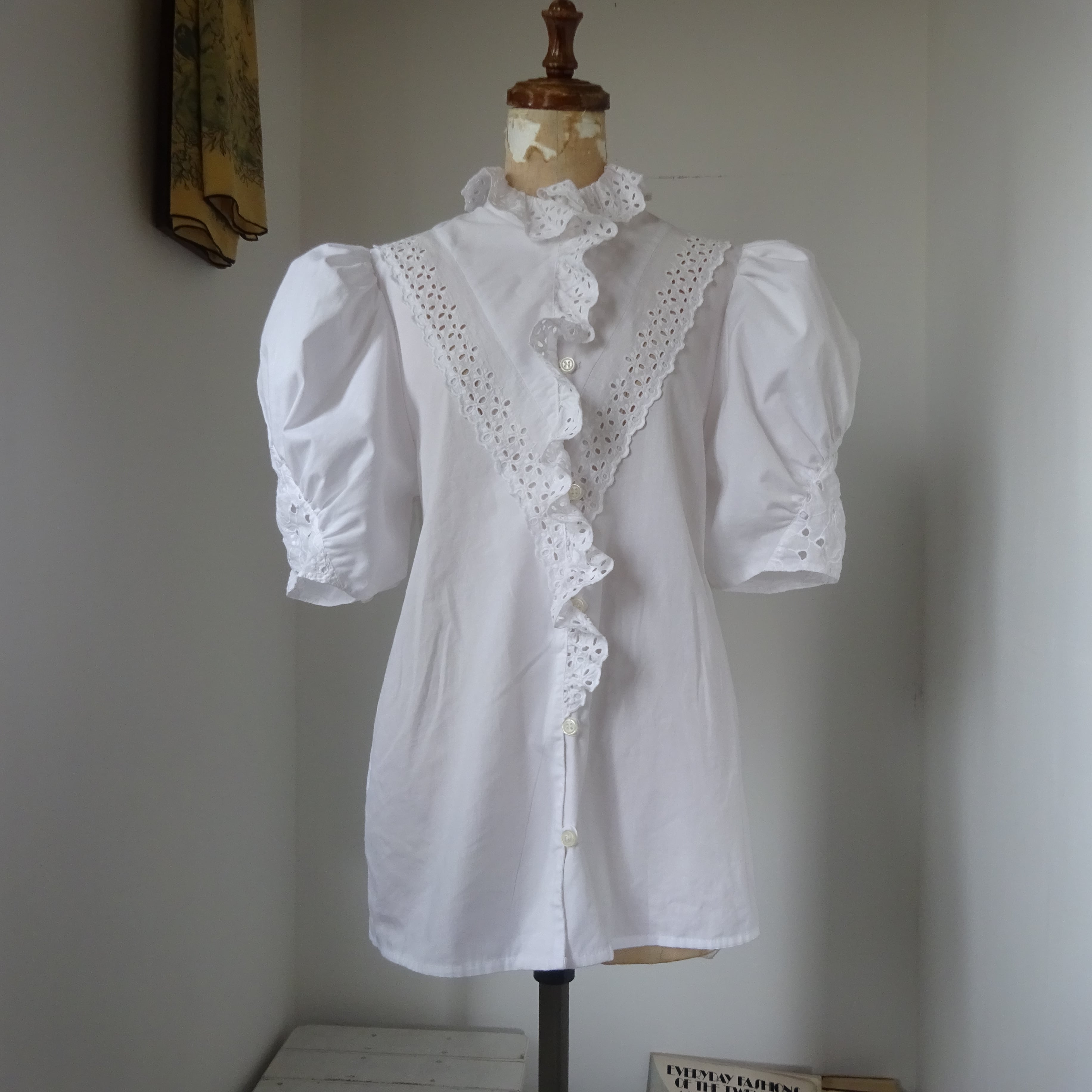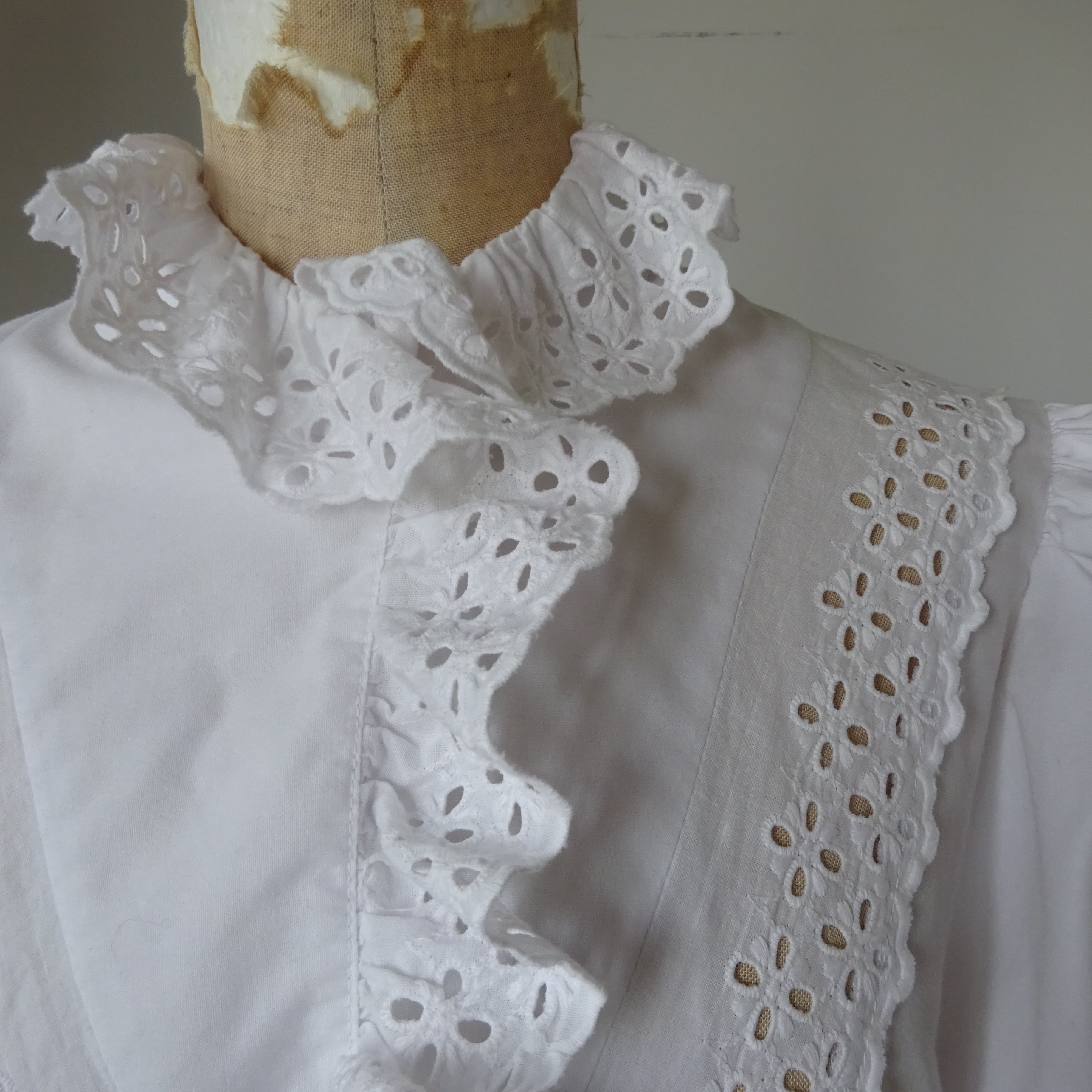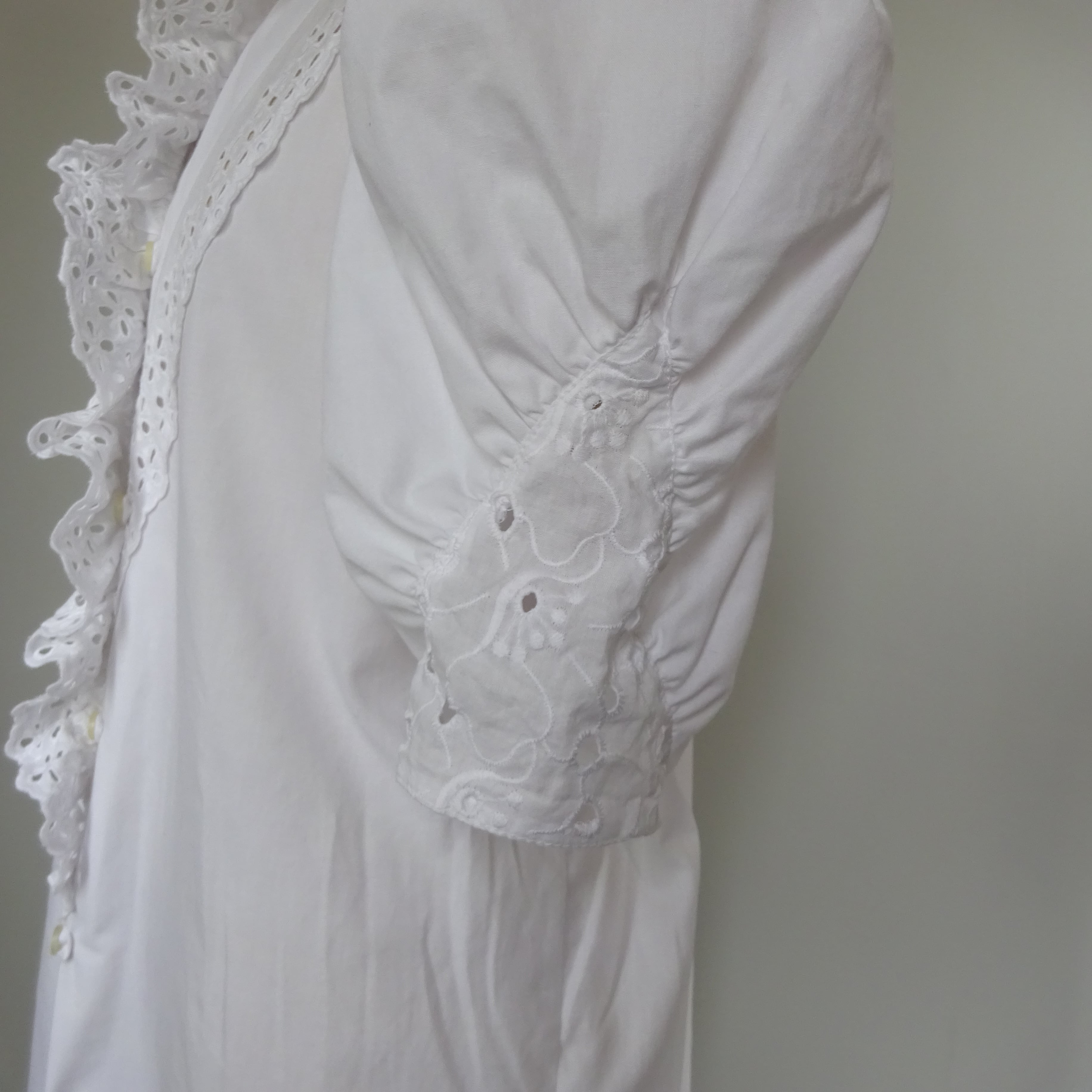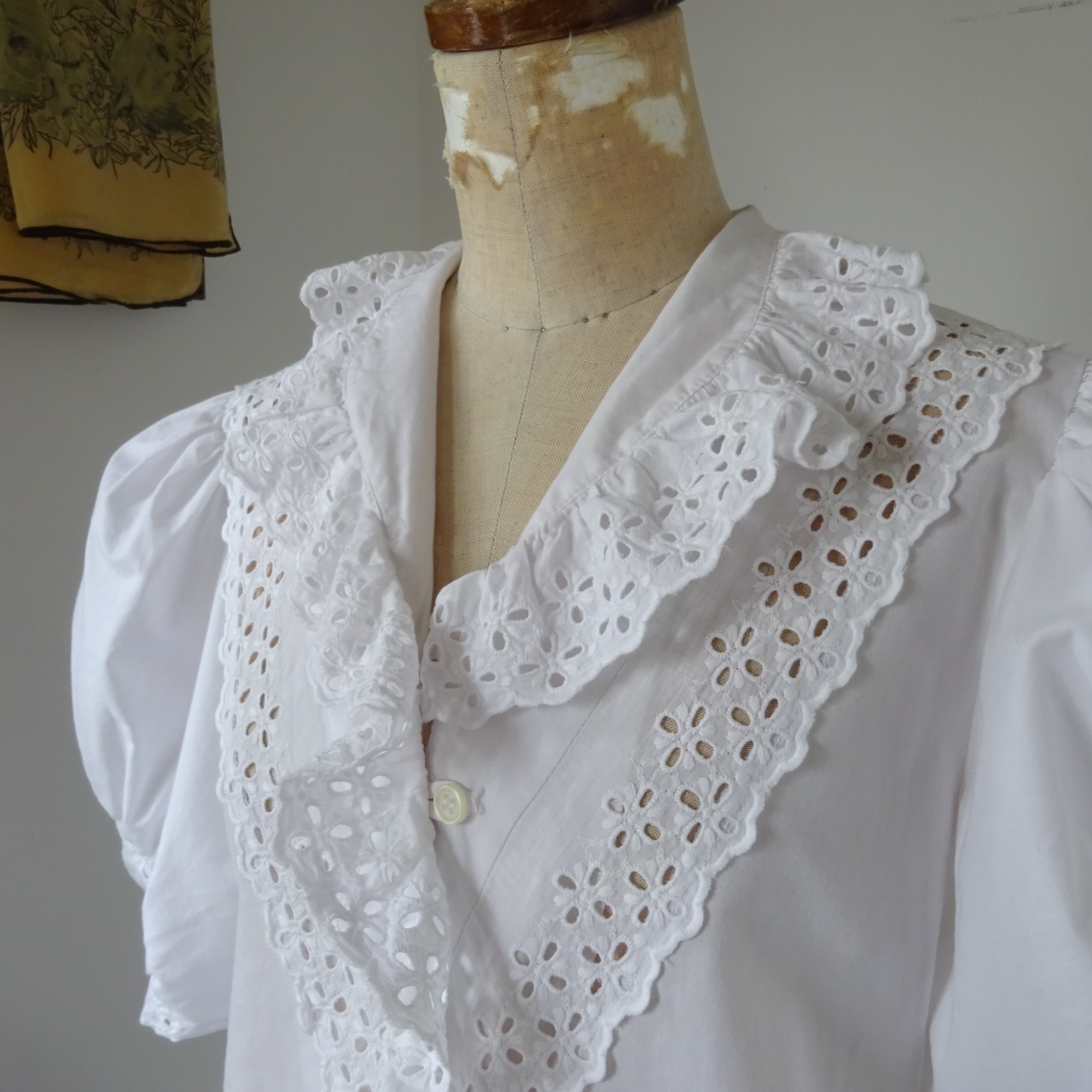 本来はこのブラウスの上からデコルテの開いたフィットアンドフレアのワンピースや、ふんわりしたスカートとエプロンを合わせたりするためのものです。