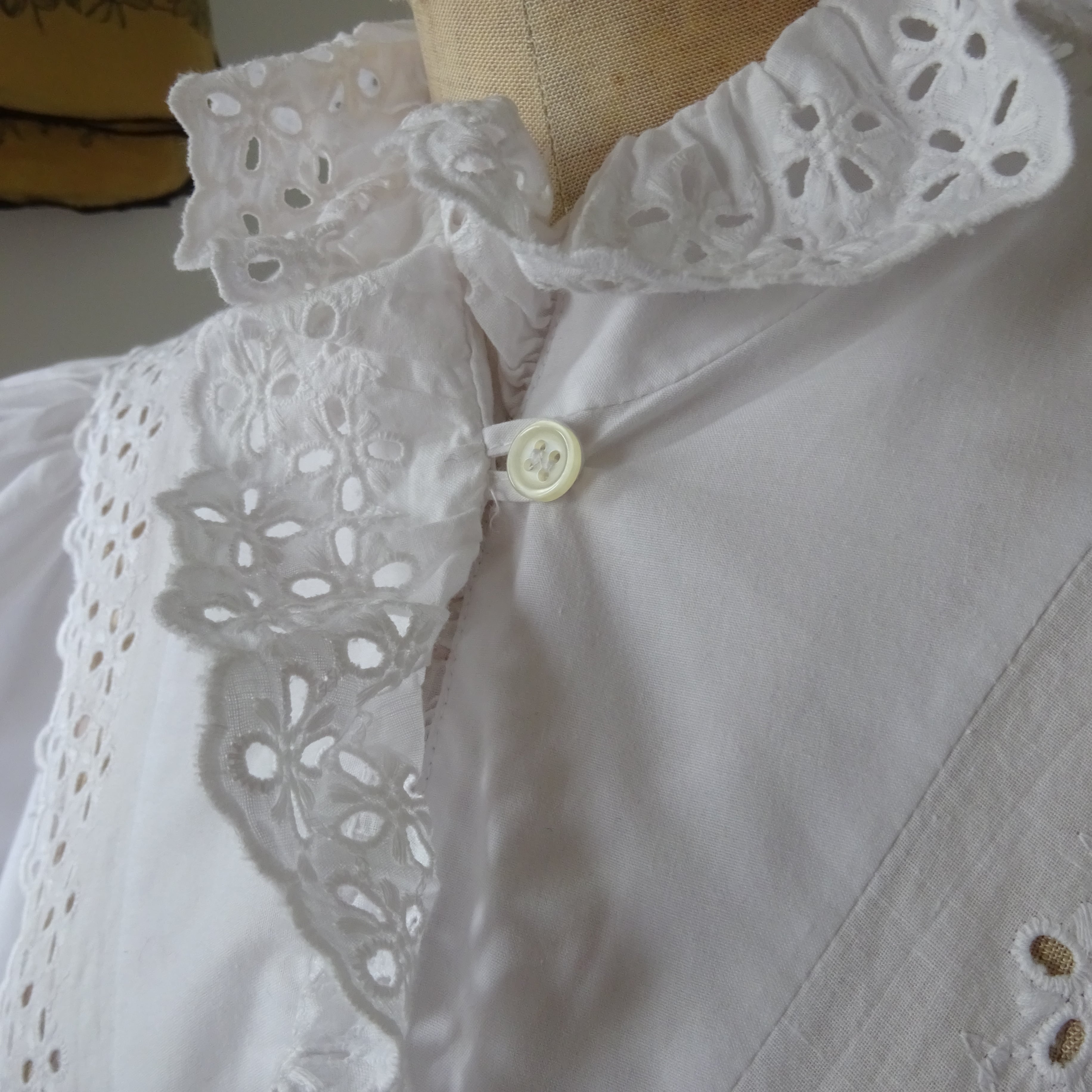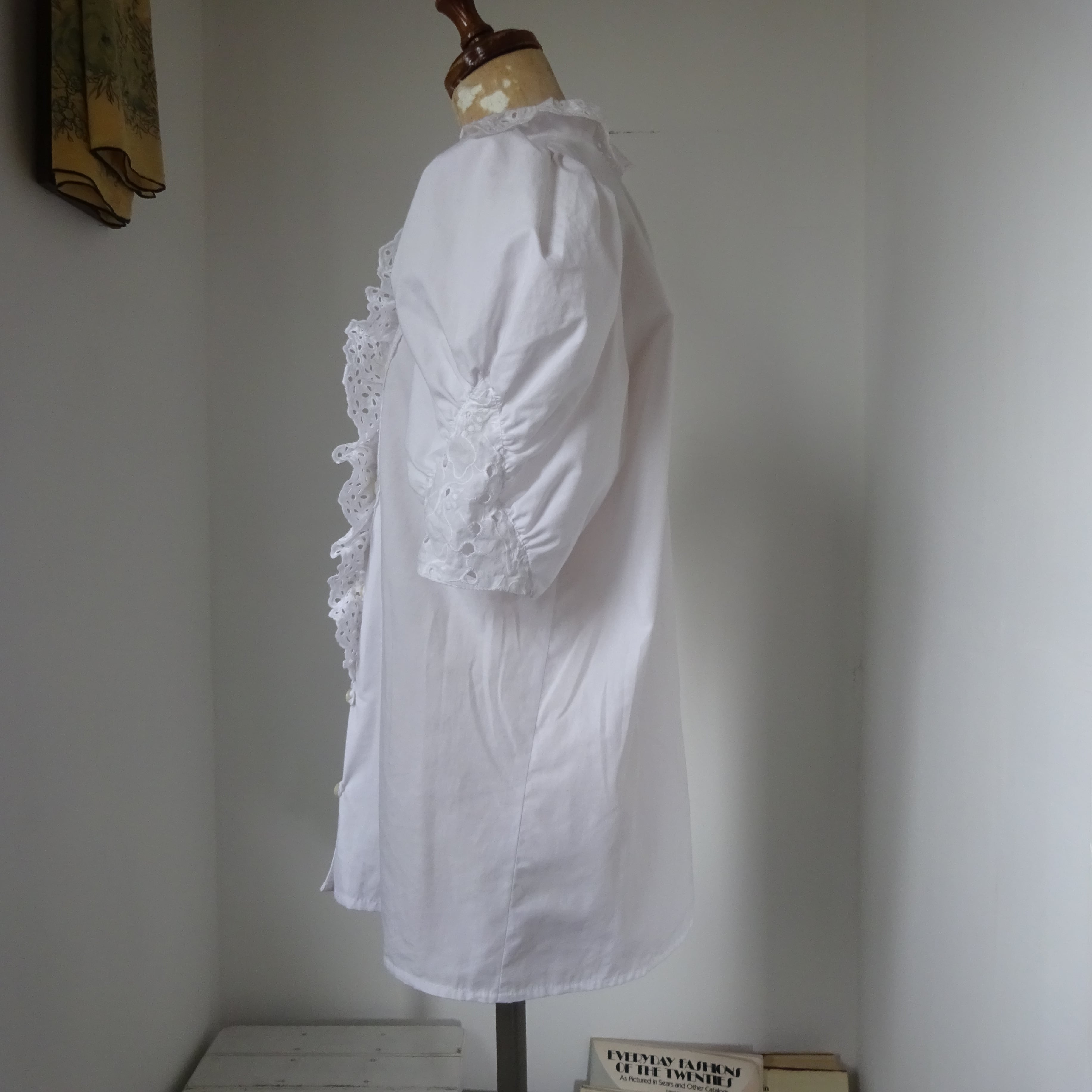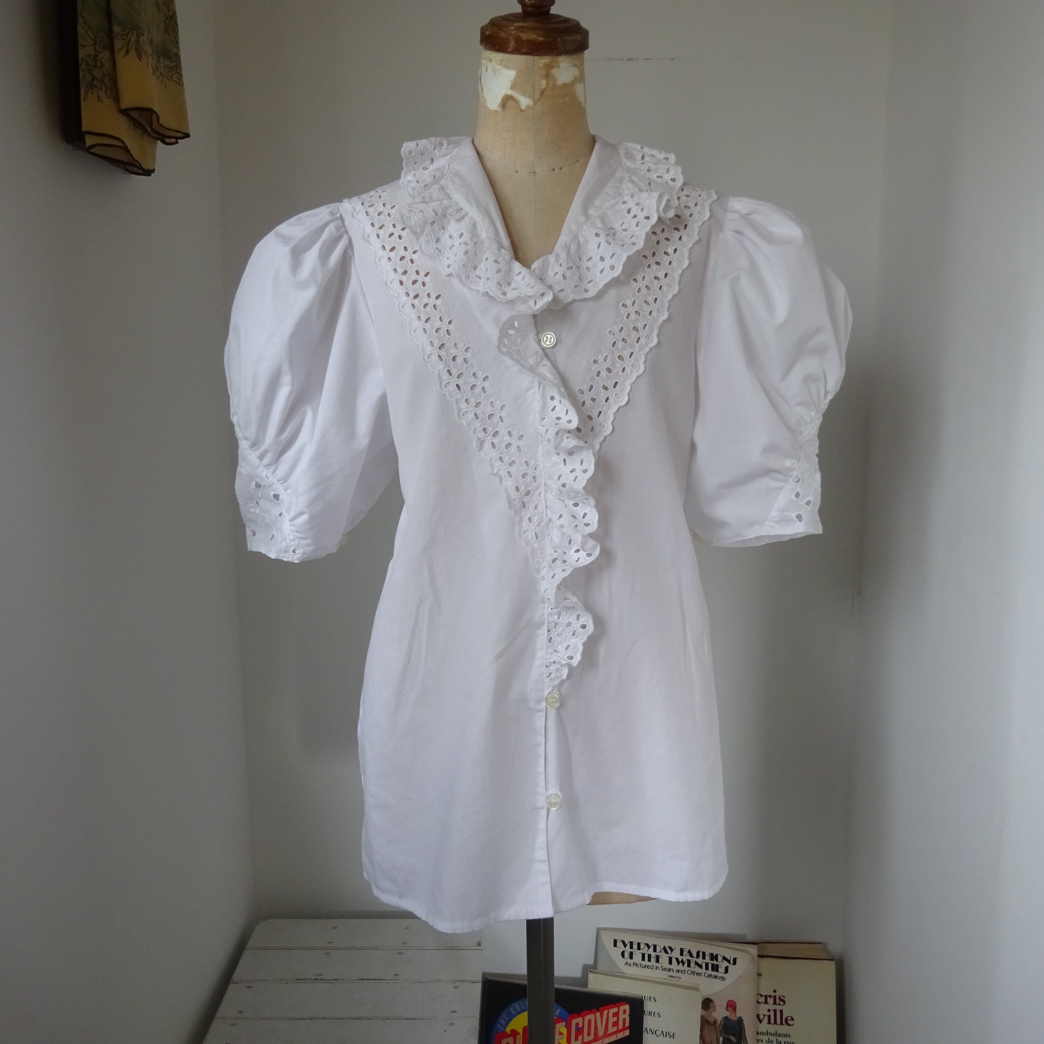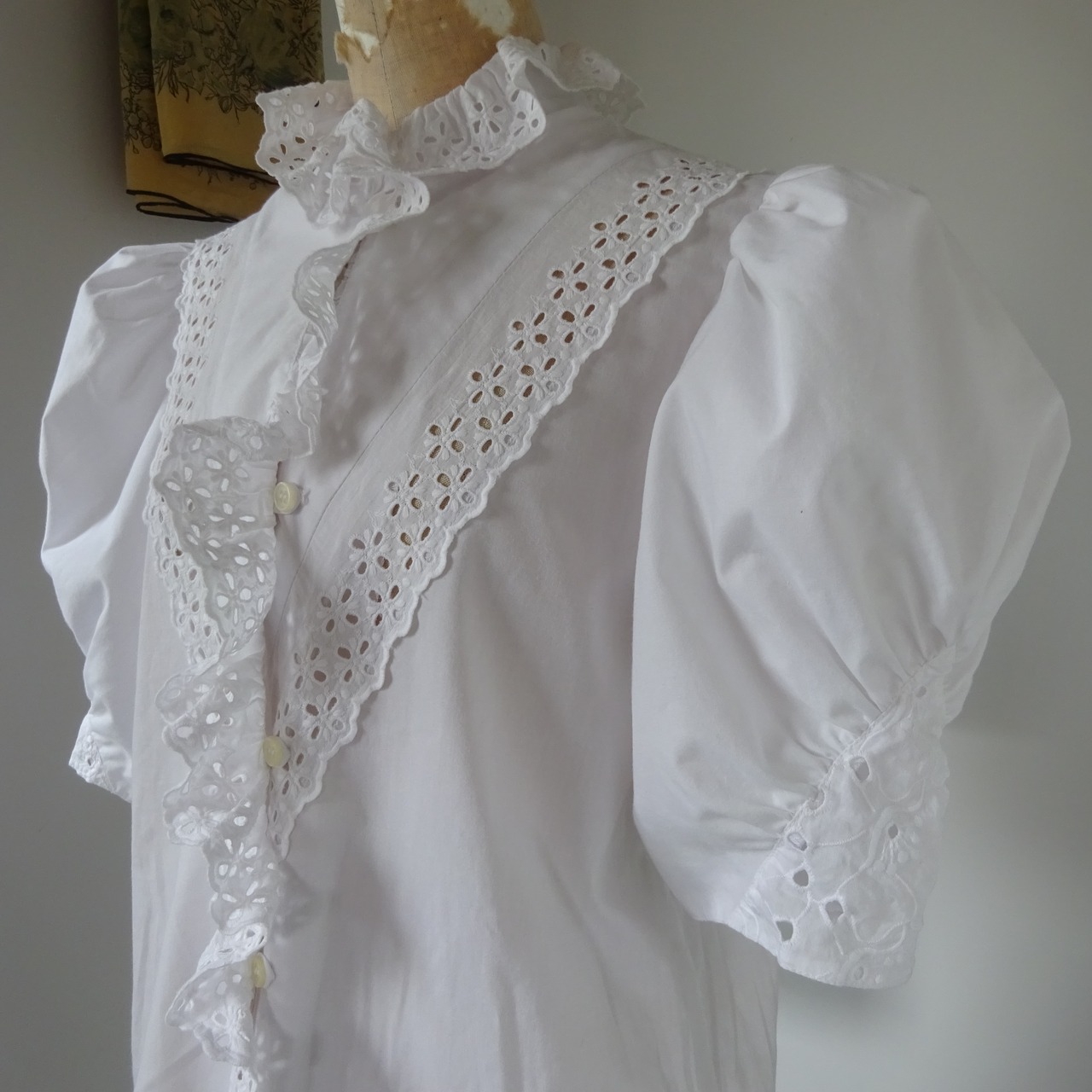 本来はこのブラウスの上からデコルテの開いたフィットアンドフレアのワンピースや、ふんわりしたスカートとエプロンを合わせたりするためのものです。