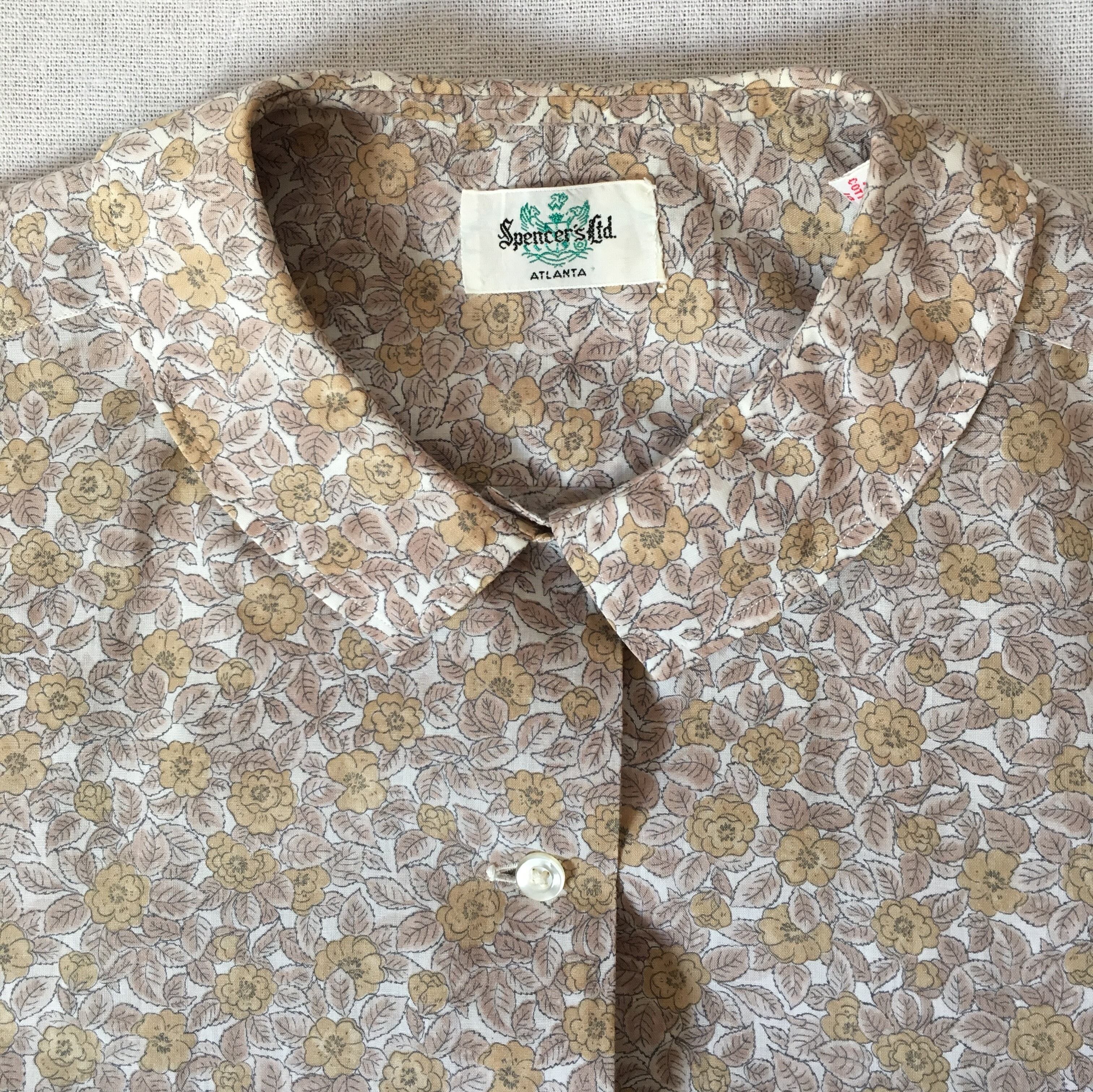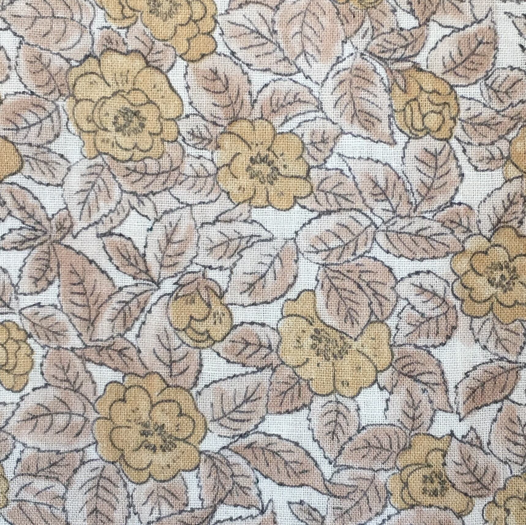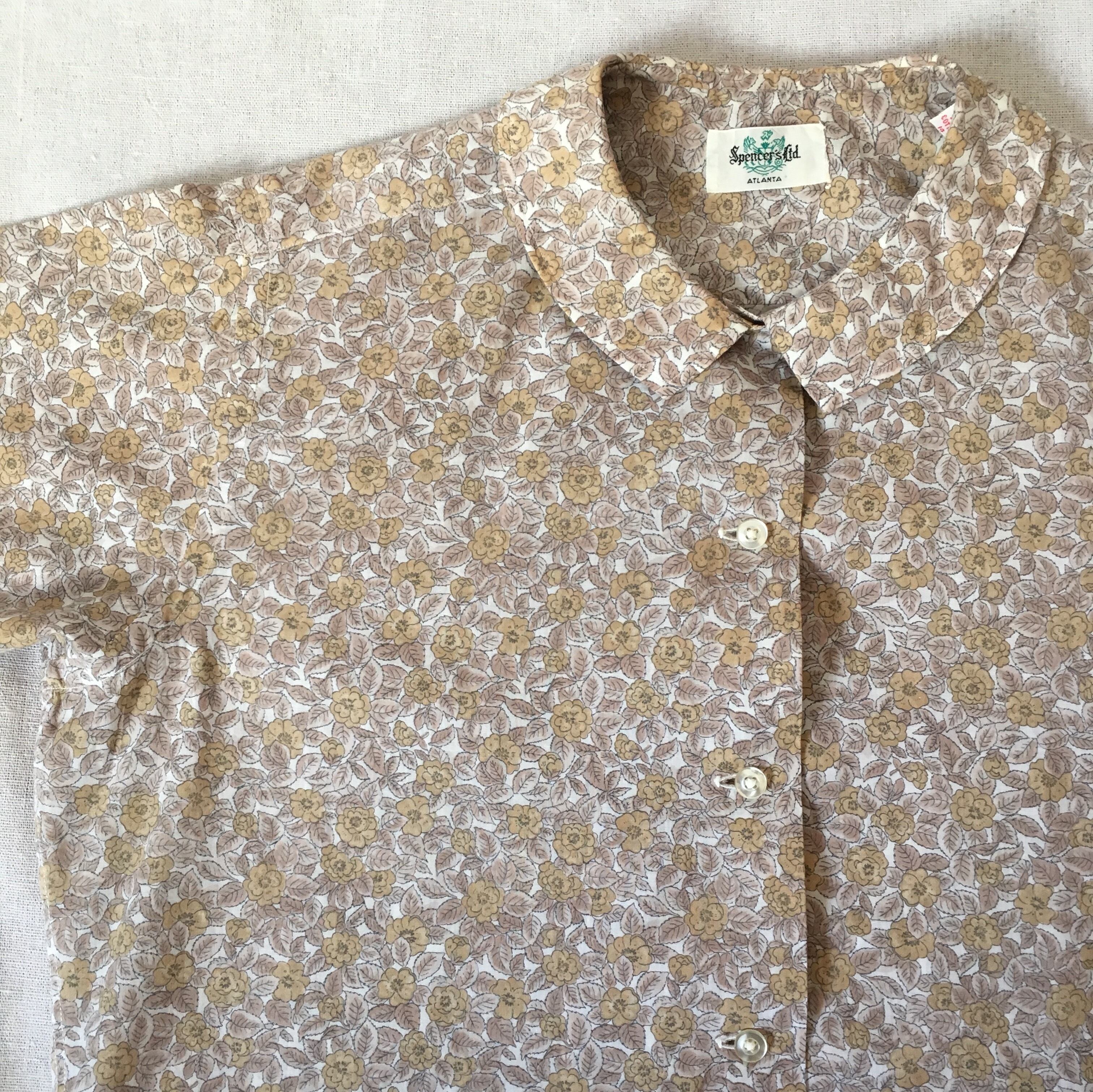 淡い花柄と丸首が女の子らしく、ベージュベースの色合いが優しい印象に。