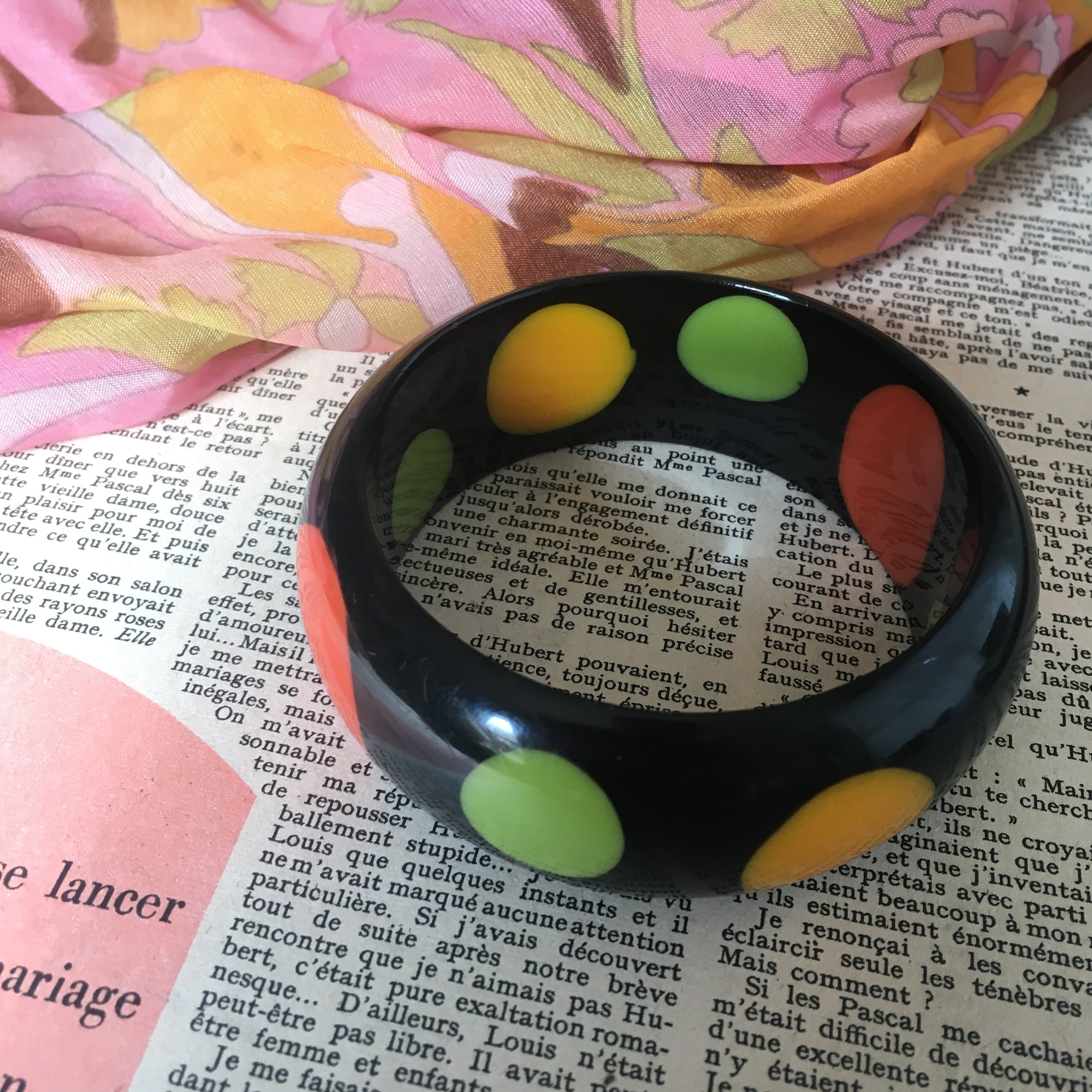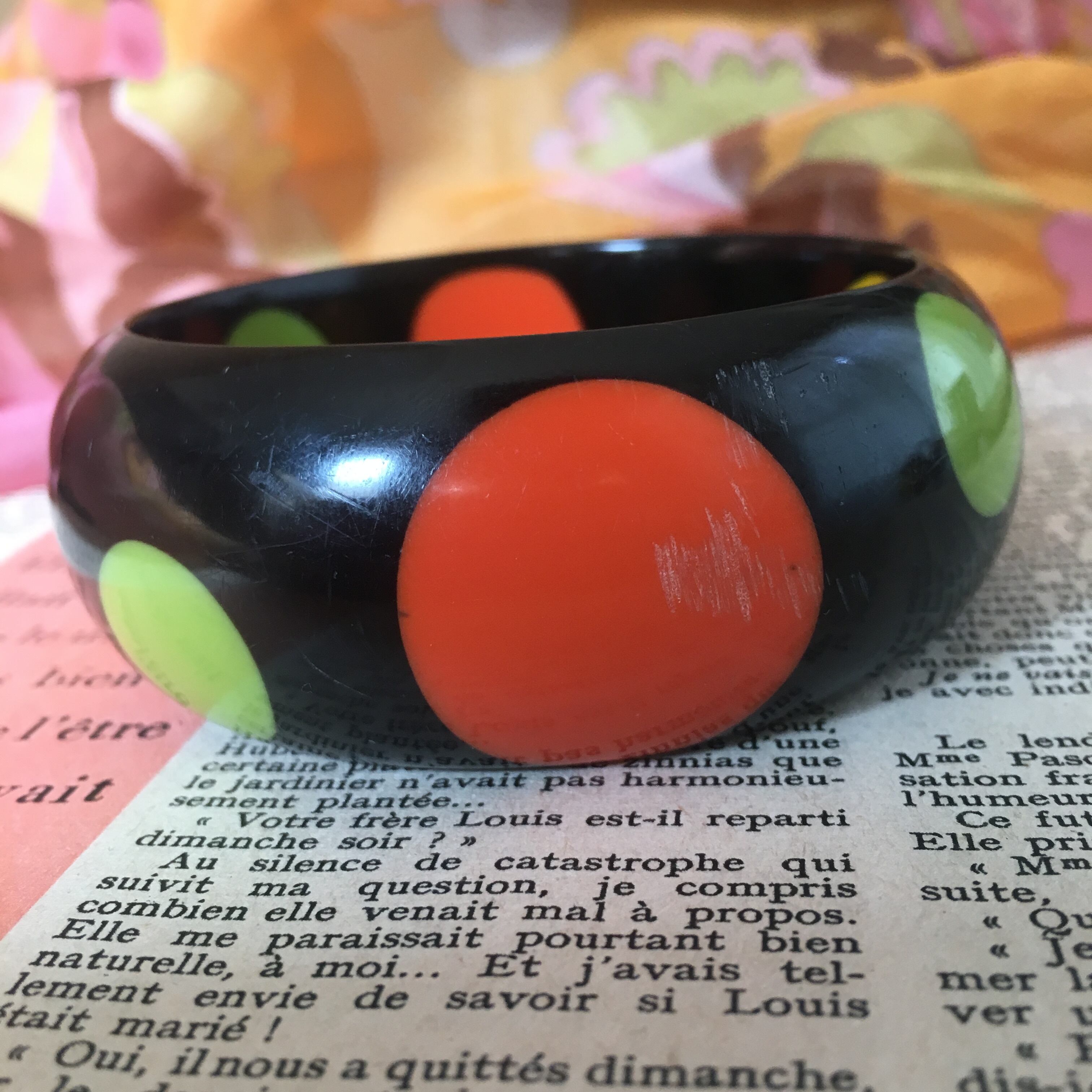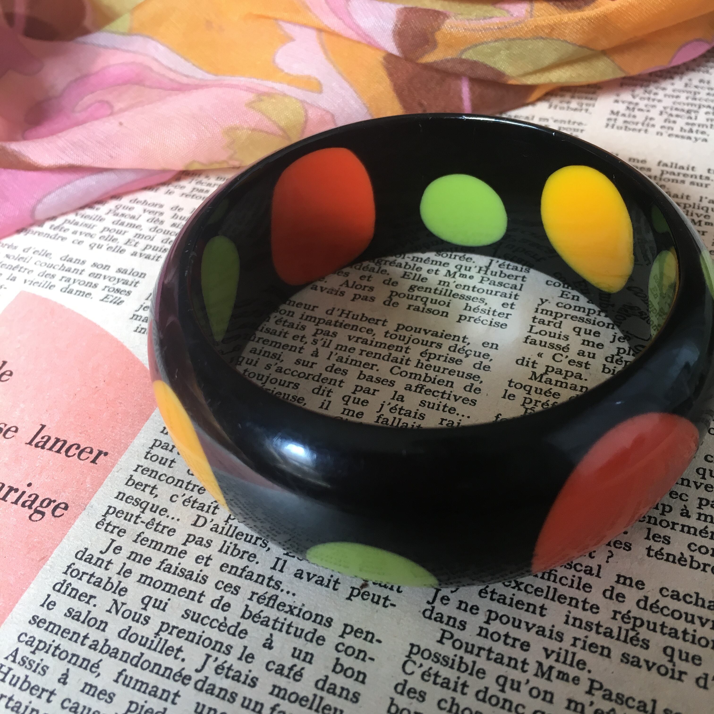 サイケというよりはポップな雰囲気のドット柄。黒に映えるオレンジ、グリーン、イエローのコントラストが可愛いです^ ^