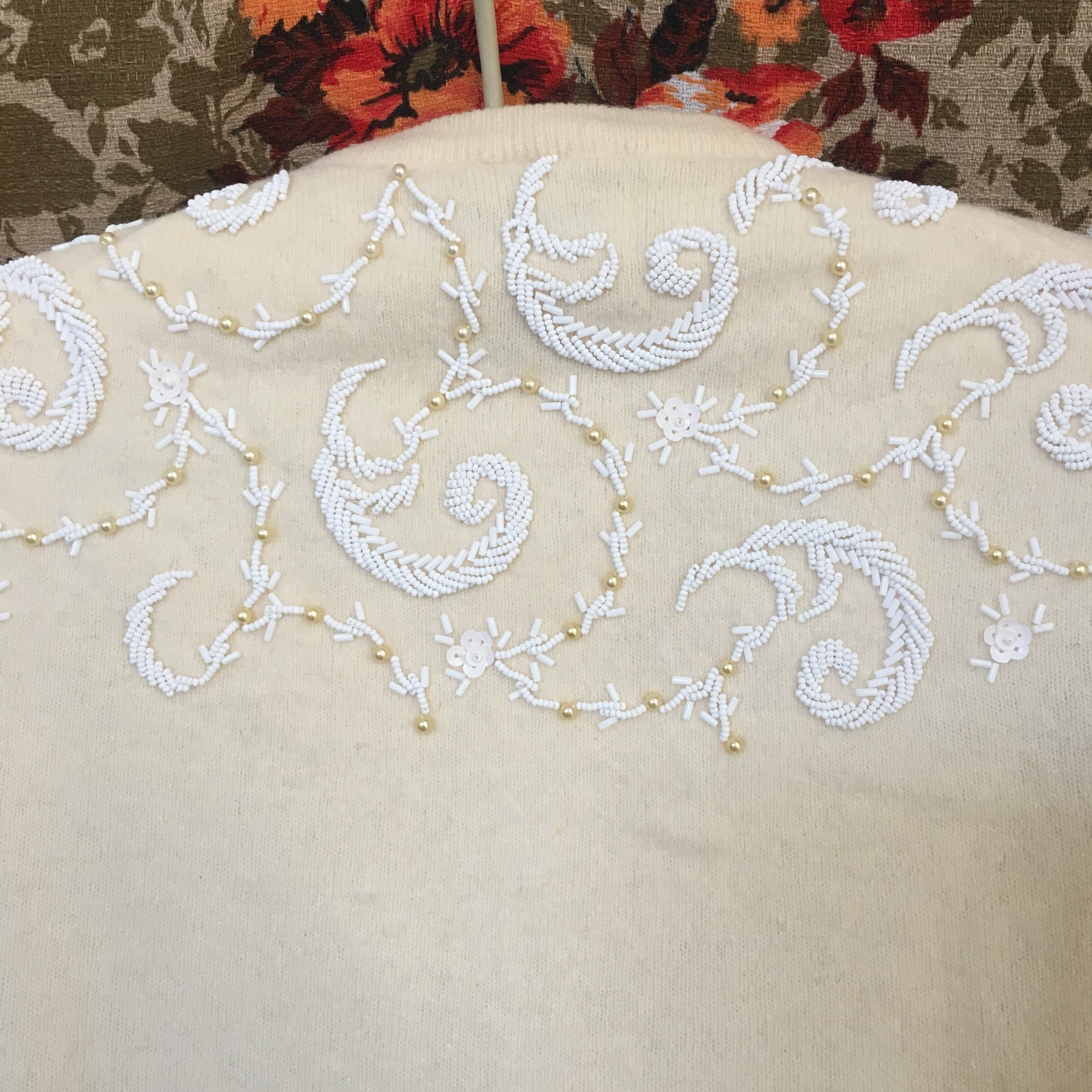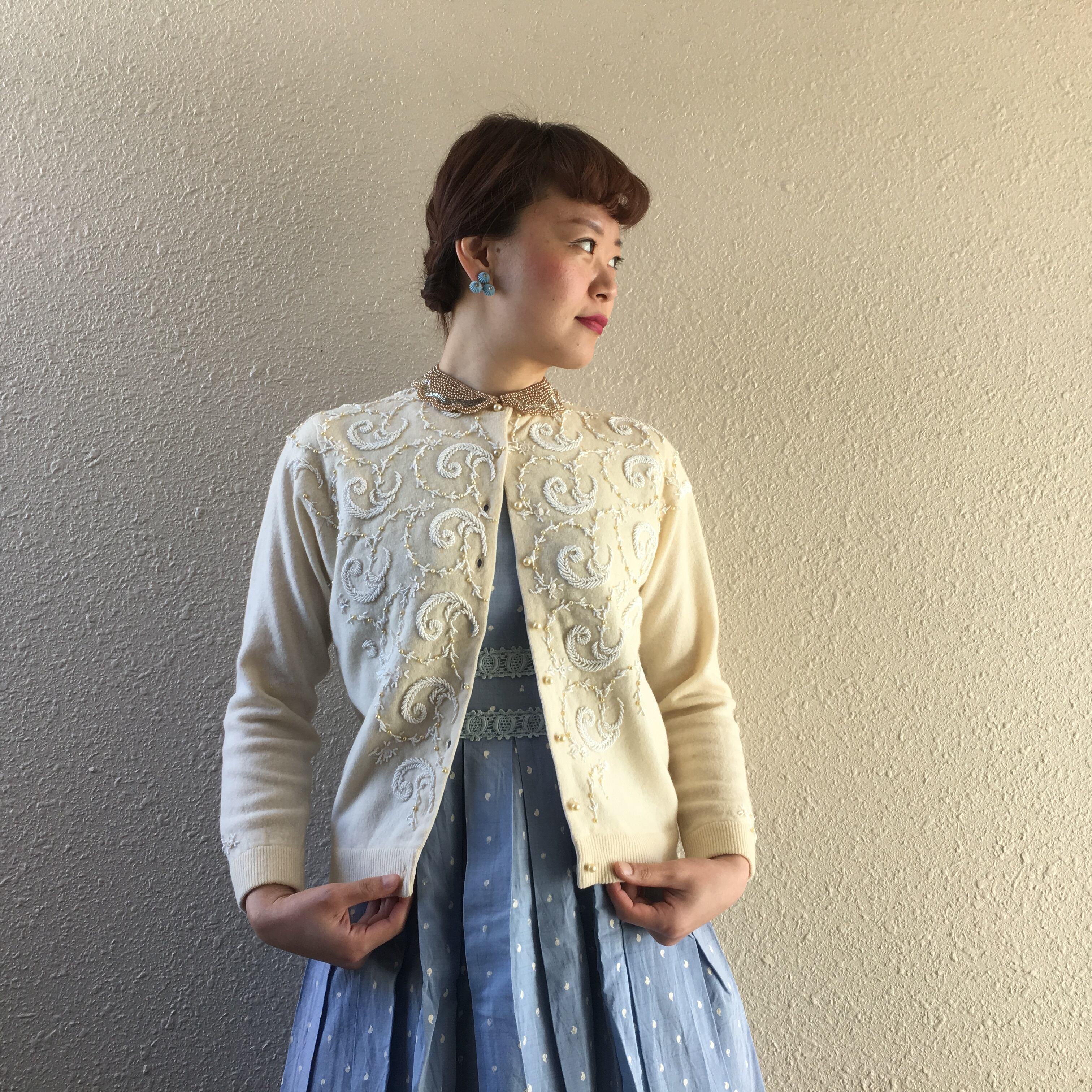 ビンテージのビーズカーディガンは、丁寧に、そして惜しみなくビーズを刺繍するため、持った時のずっしり感や程よく背筋の伸びる着用感がとても心地よいです。
