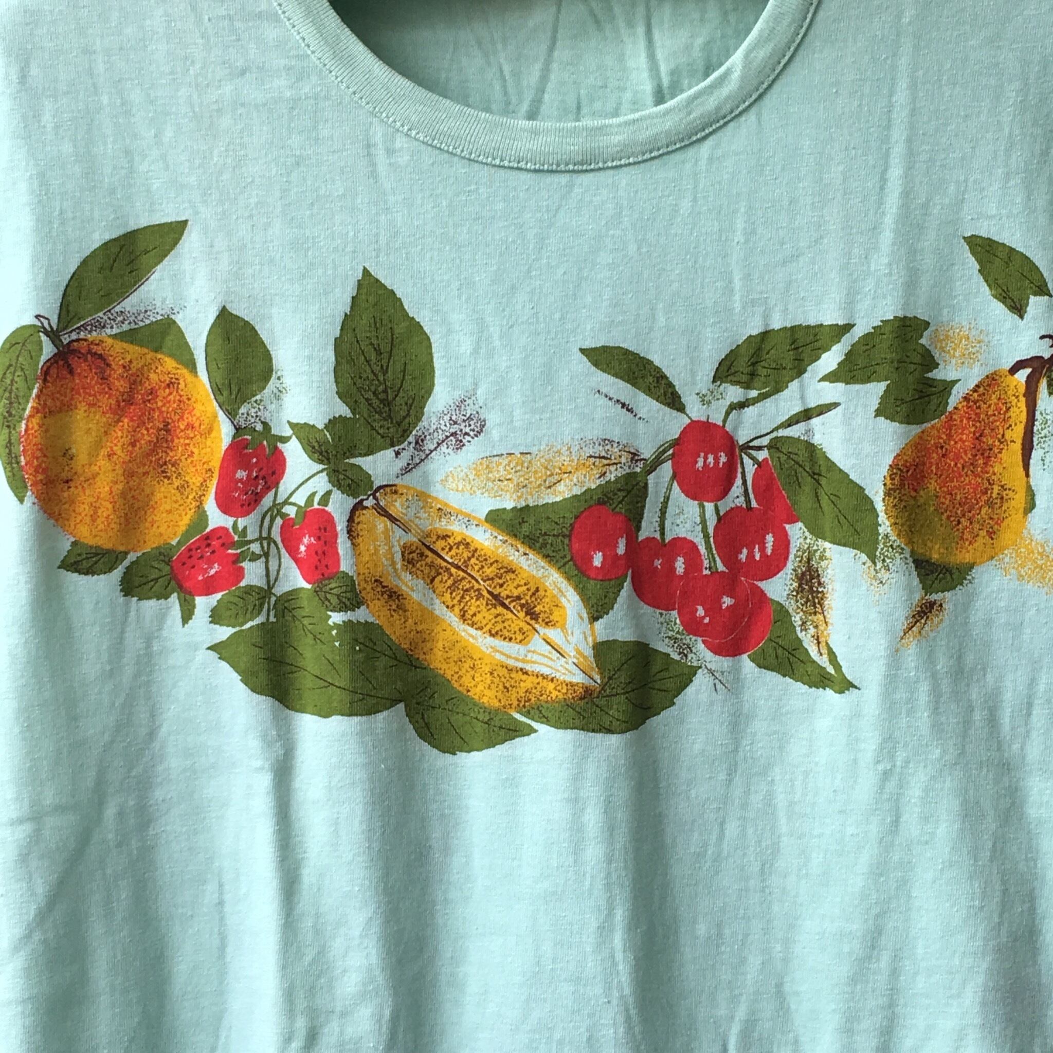 フルーツ柄にミントグリーン、フレンチスリーブと、偏にTシャツという括りに収めるにはなんだか勿体ないような可愛さの詰まったTシャツです。