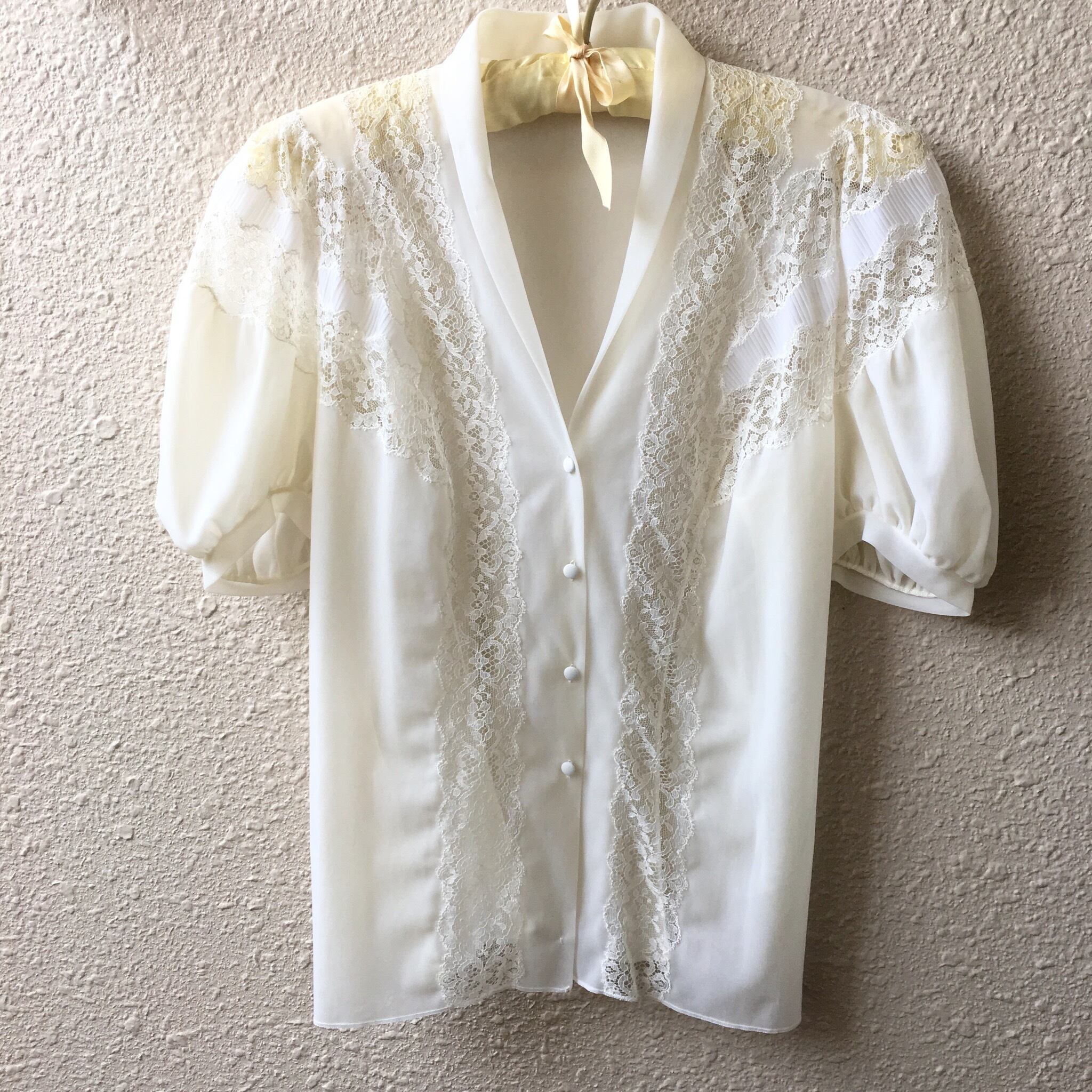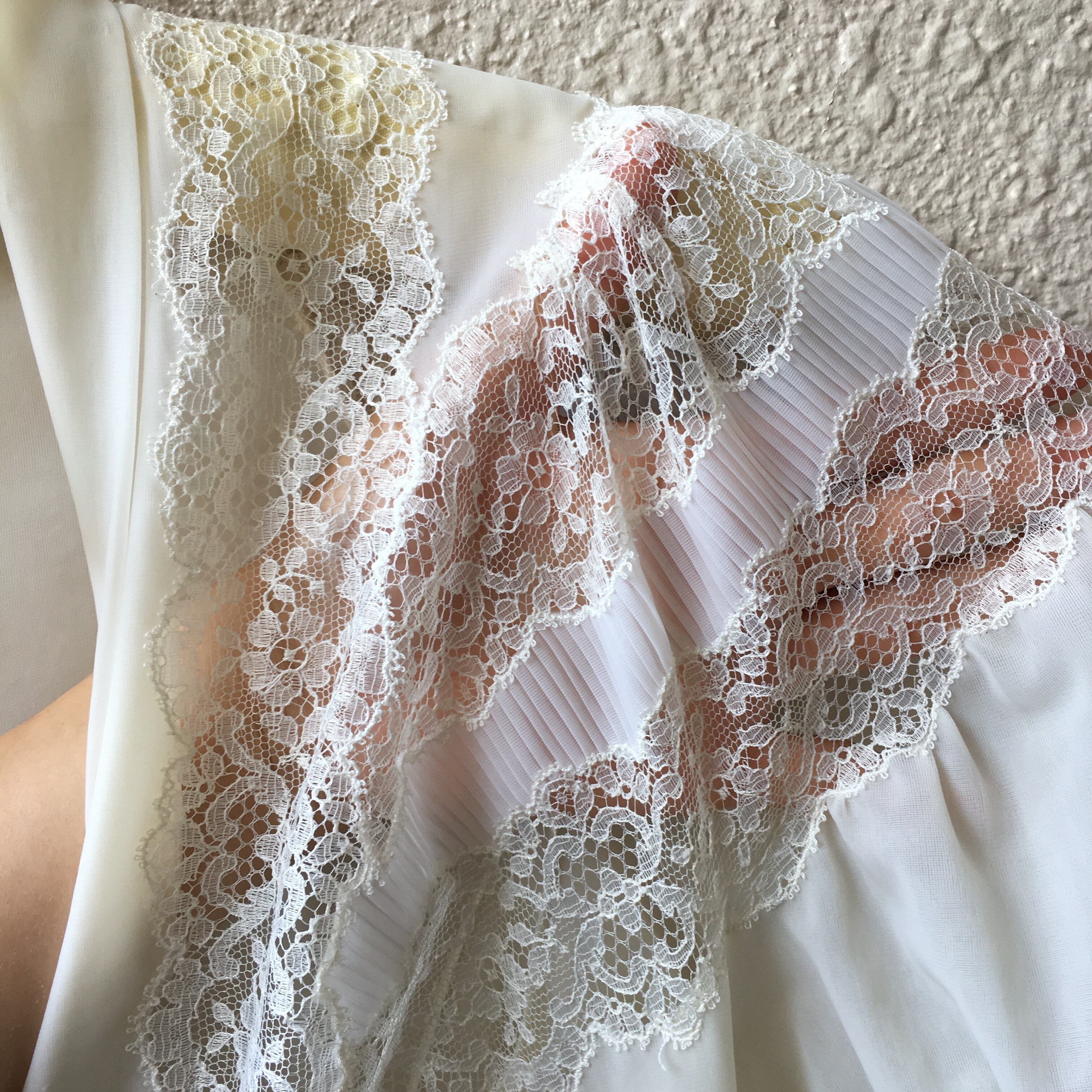 深めに開いたVネック、シースルーに繊細なレースとプリーツ