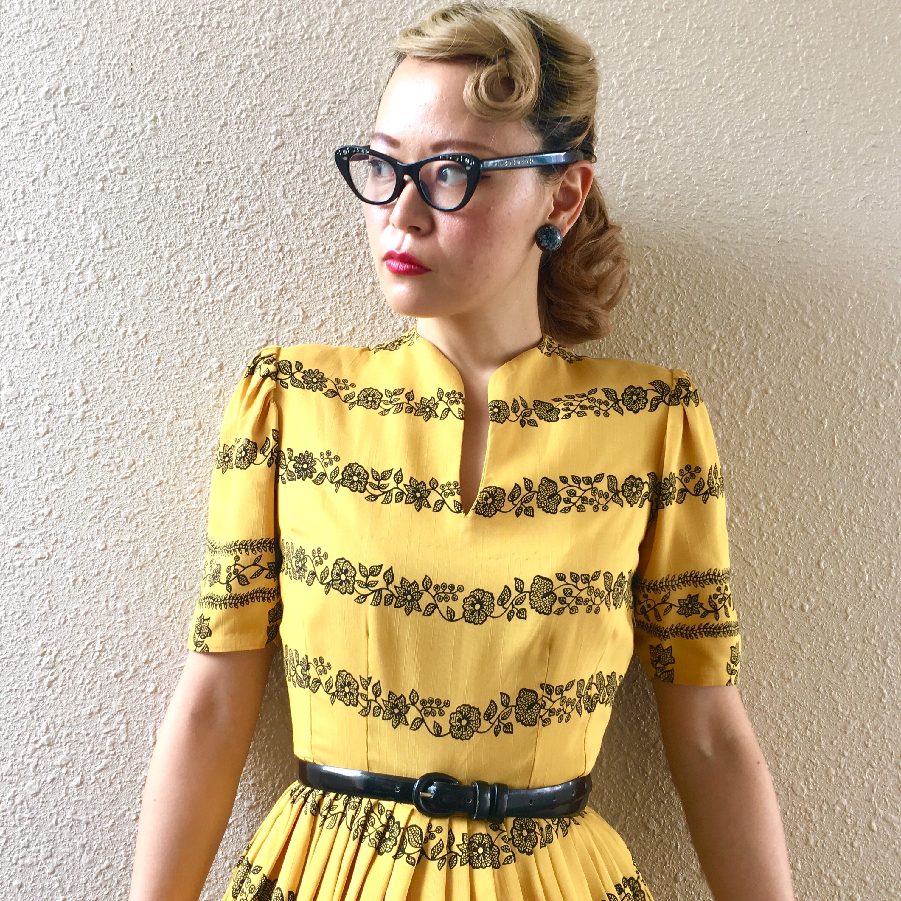 ひざ下でふわっと広がるフィット&フレアは50年代の始まりを感じさせます。