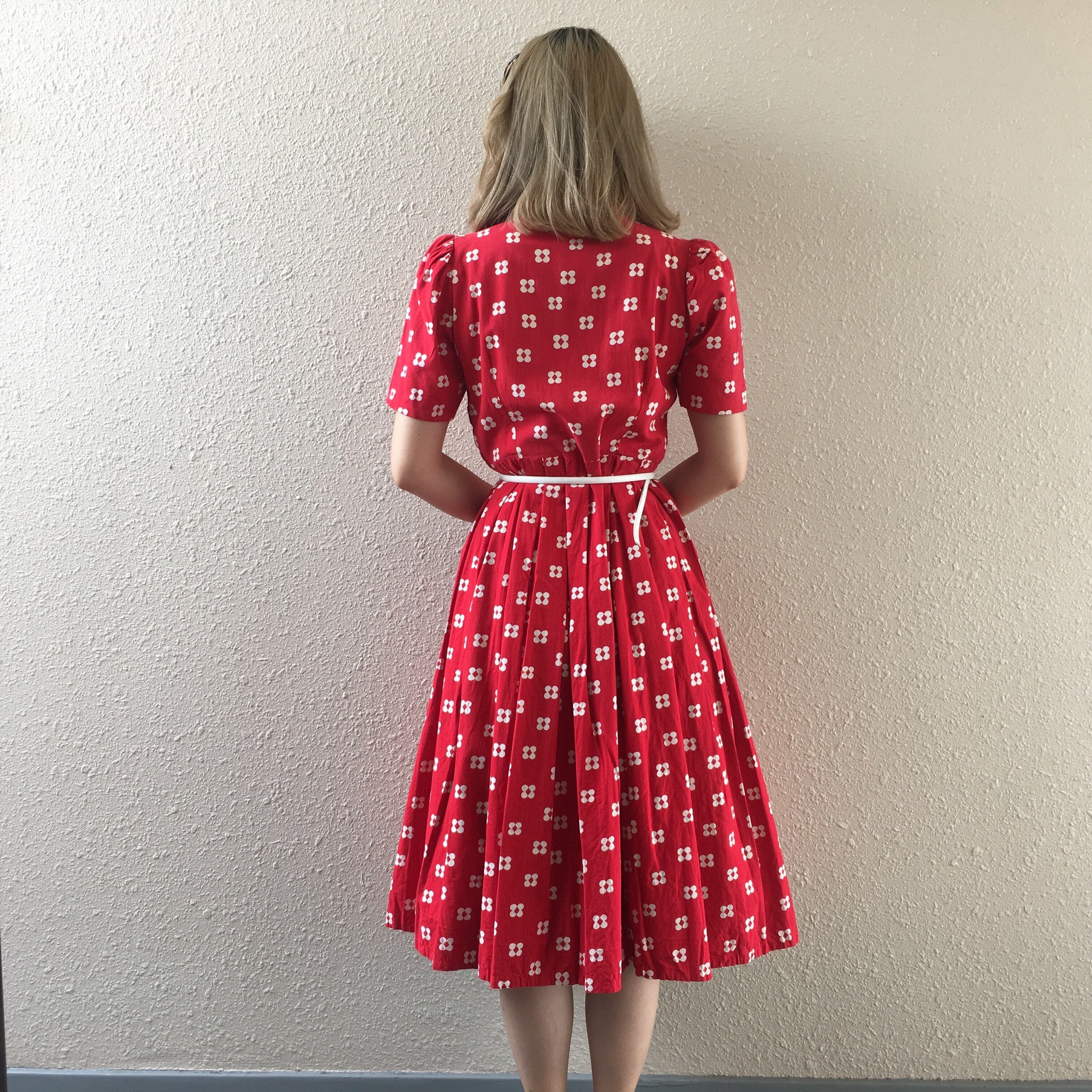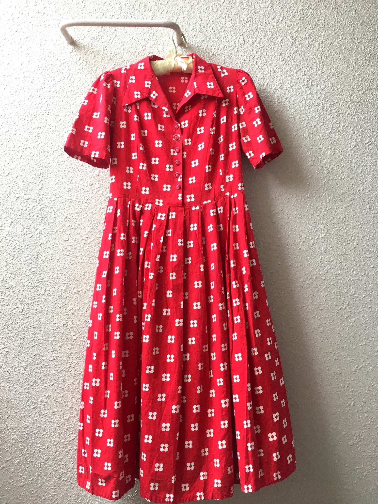 40年代と50年代の狭間、襟のとんがりや肩のギャザーは40年代、フレアのシルエットは50年代のような特徴の詰まったデザインです。