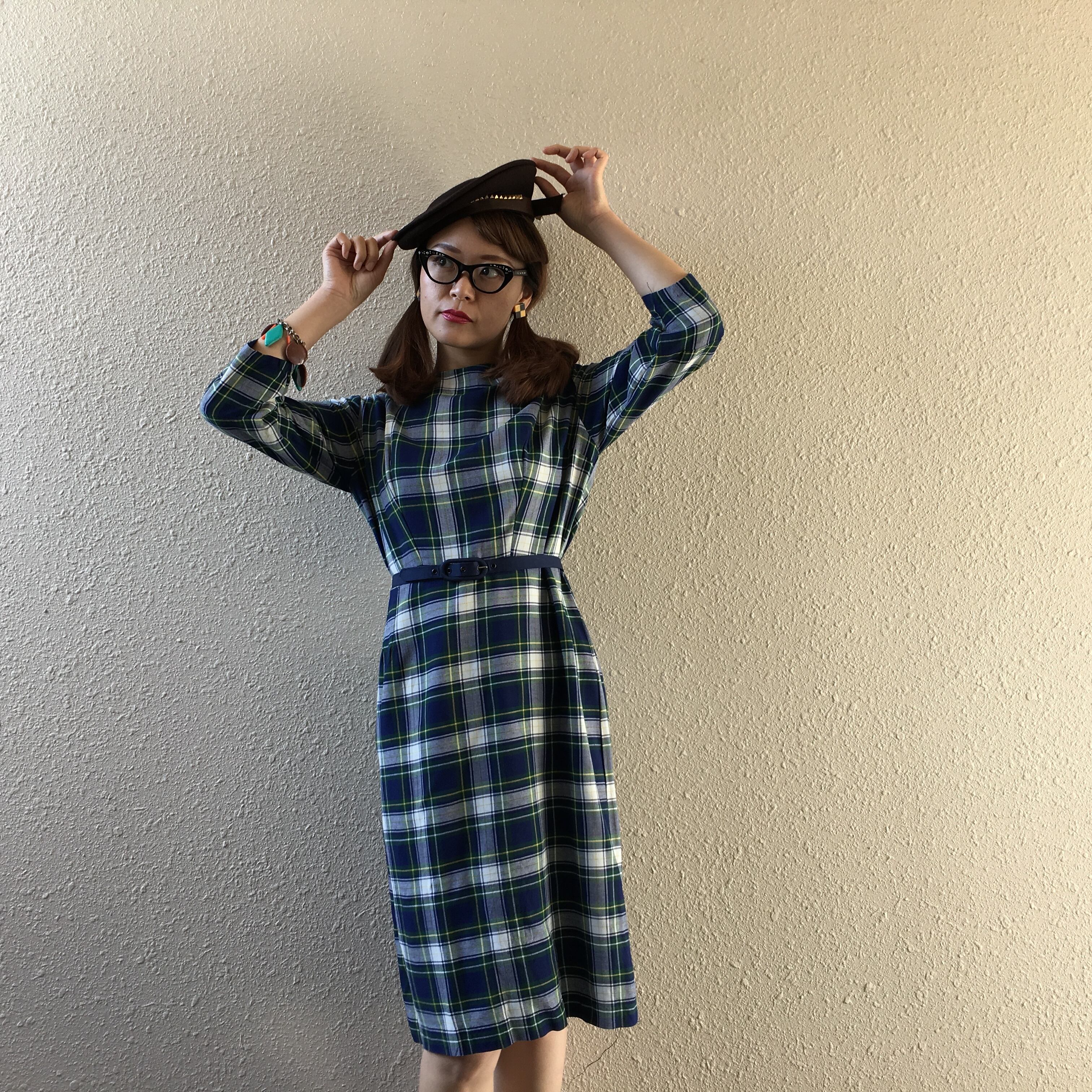 小洒落た帽子に合わせたワンピースは、フランスより買い付けたタータンチェックの50〜60年代物