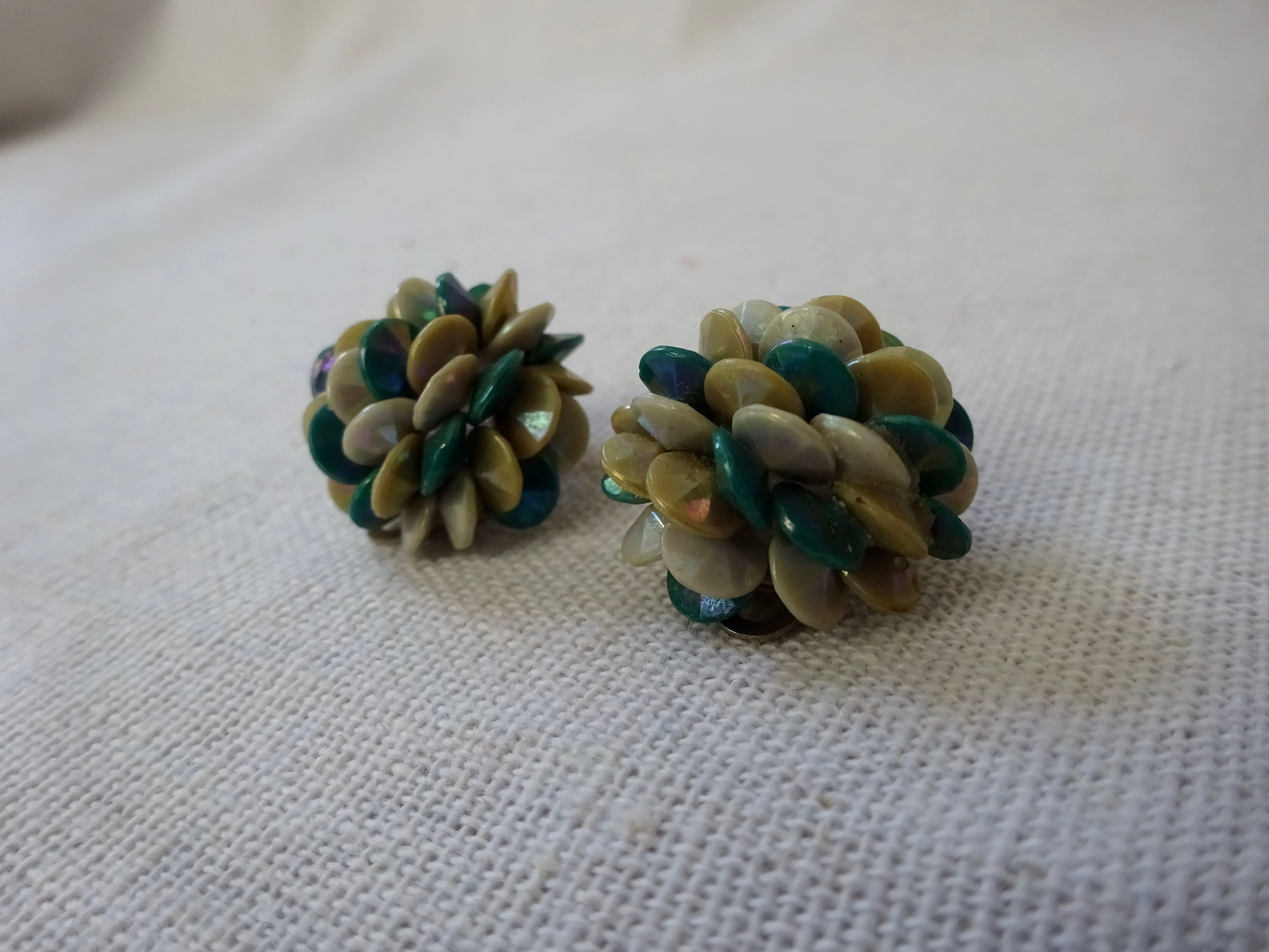 3色のオーロラカラーのビーズがびっしりつけられたイヤリング