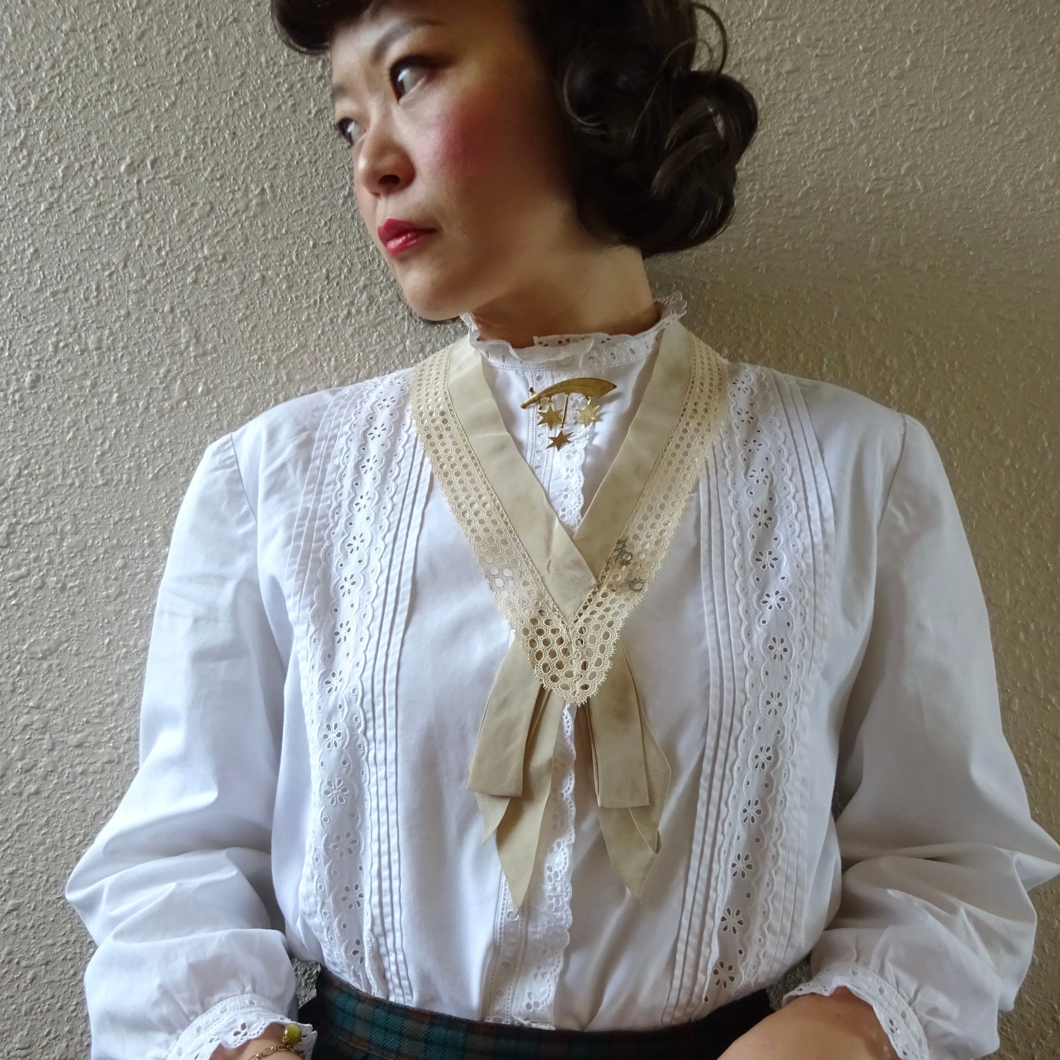 フリルとスタンドカラーと、小さな小さなボタンがとっても可愛らしいブラウス