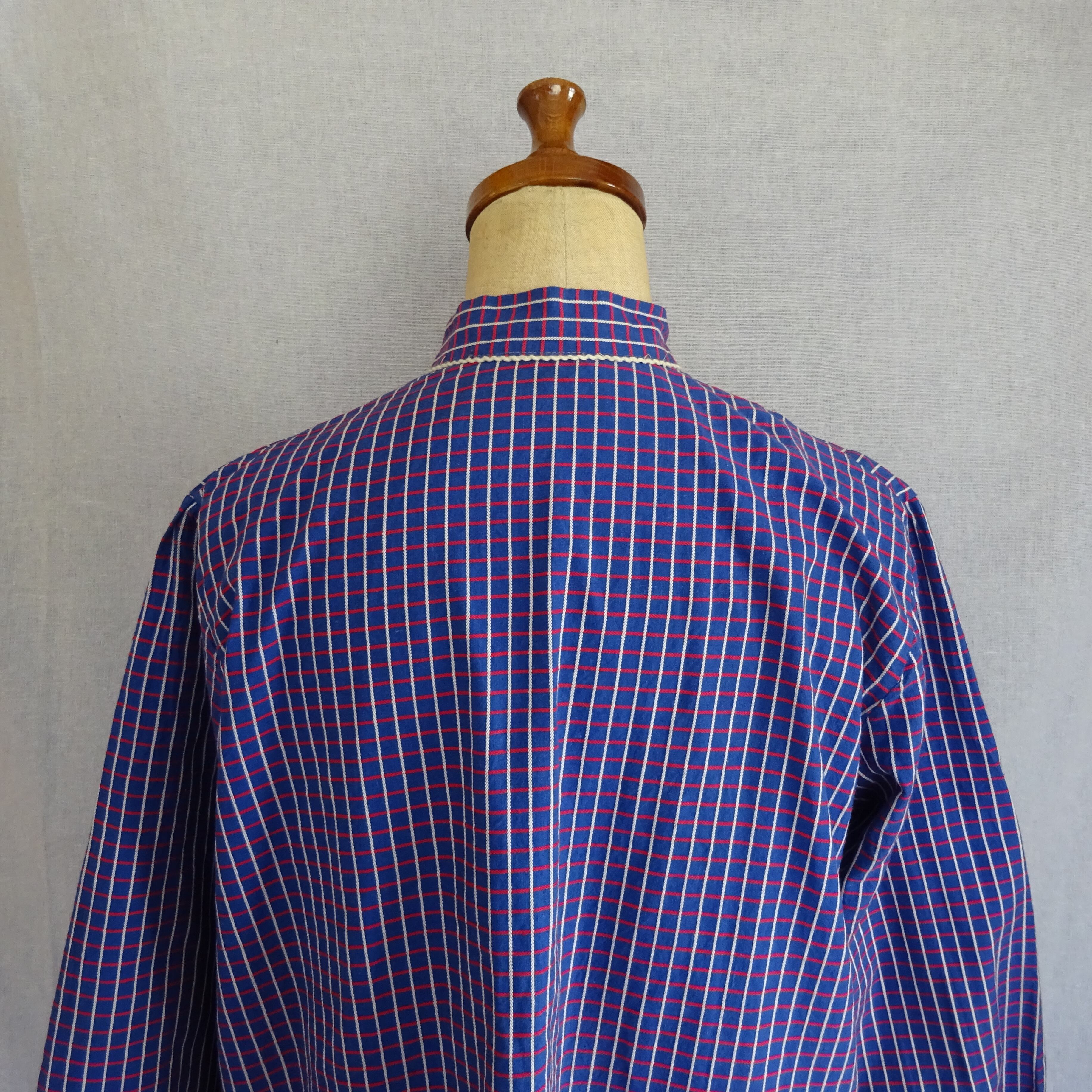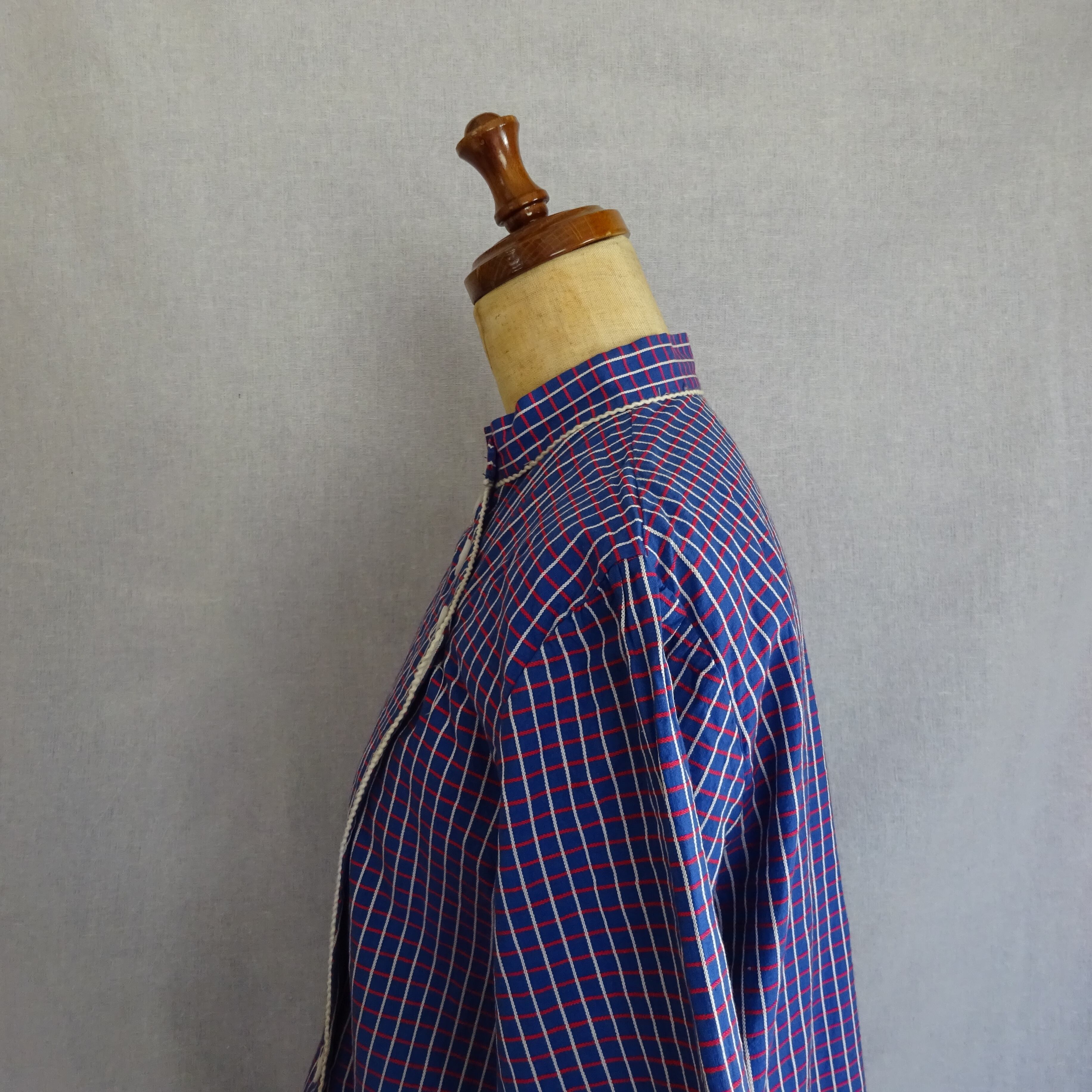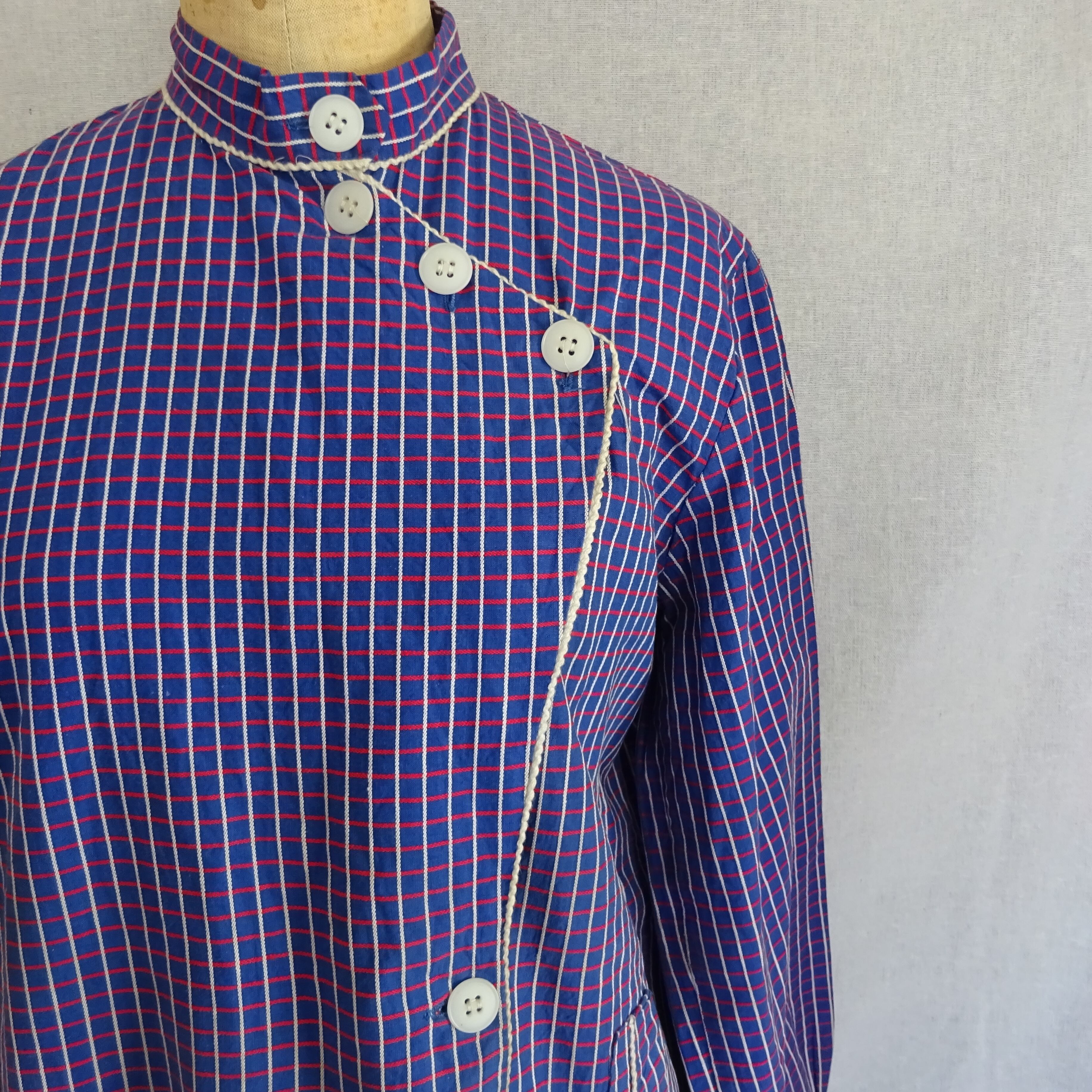 スタンドカラーと、ボタンの配列がとてもいいデザイン。生地のチェック柄は独特な織り方で立体的になっています。