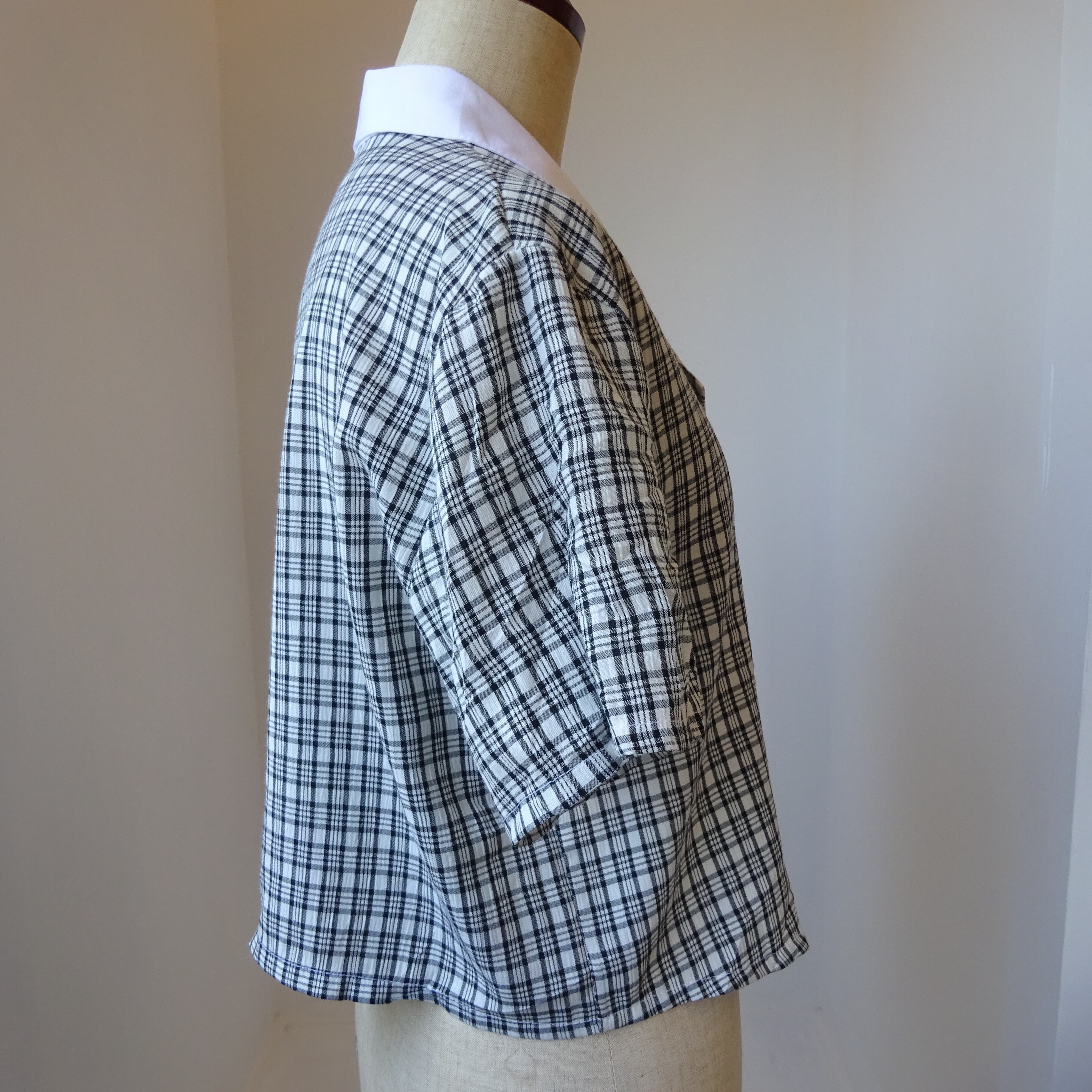 大きめの襟と裾のデザインが印象的なショート丈のブラウス