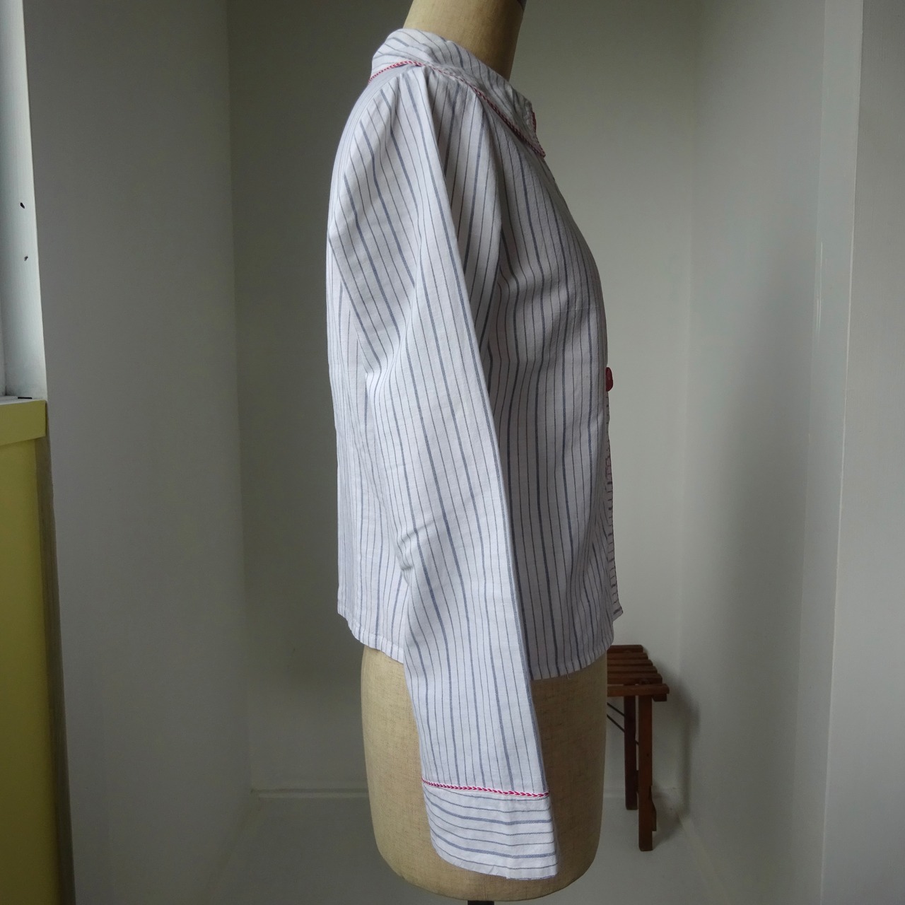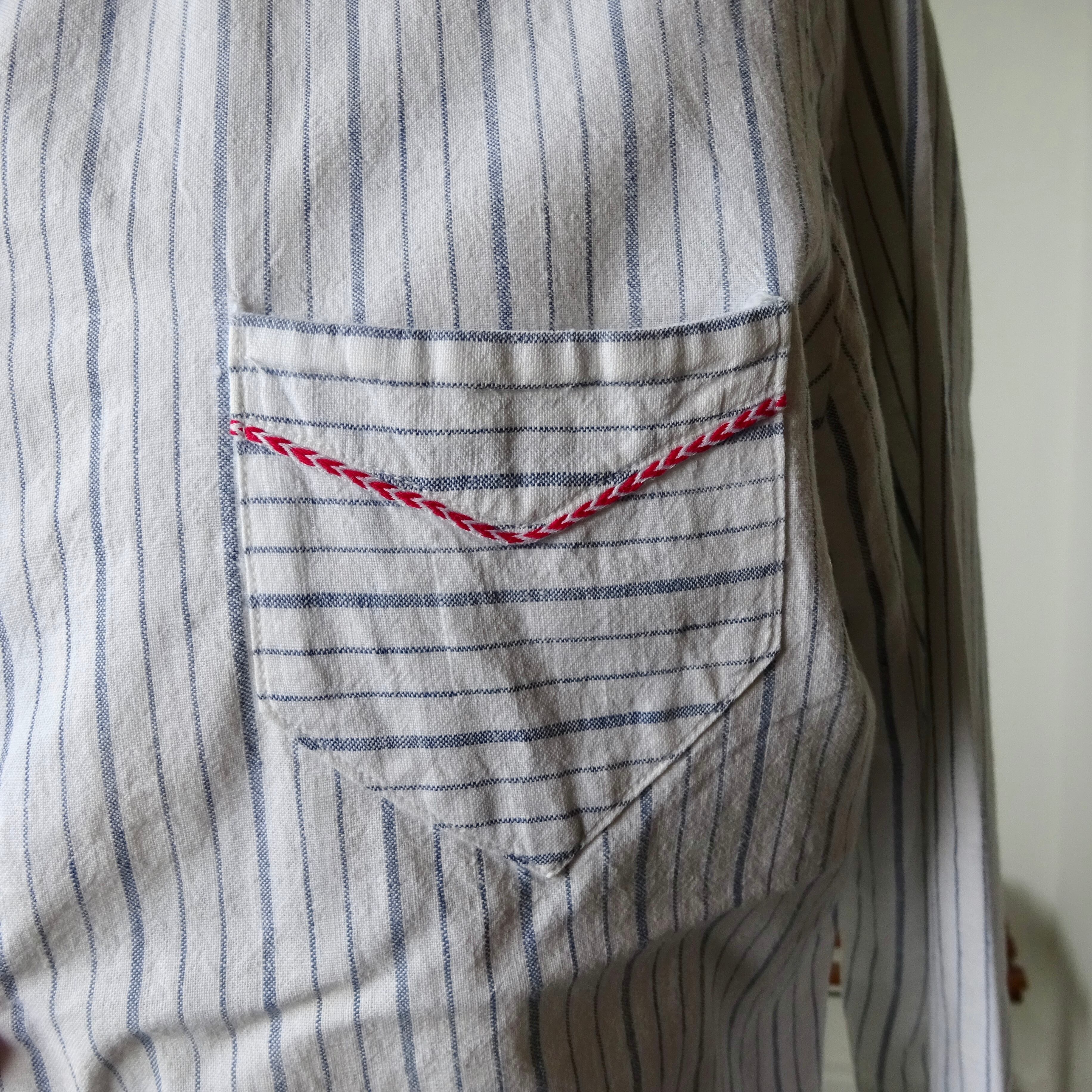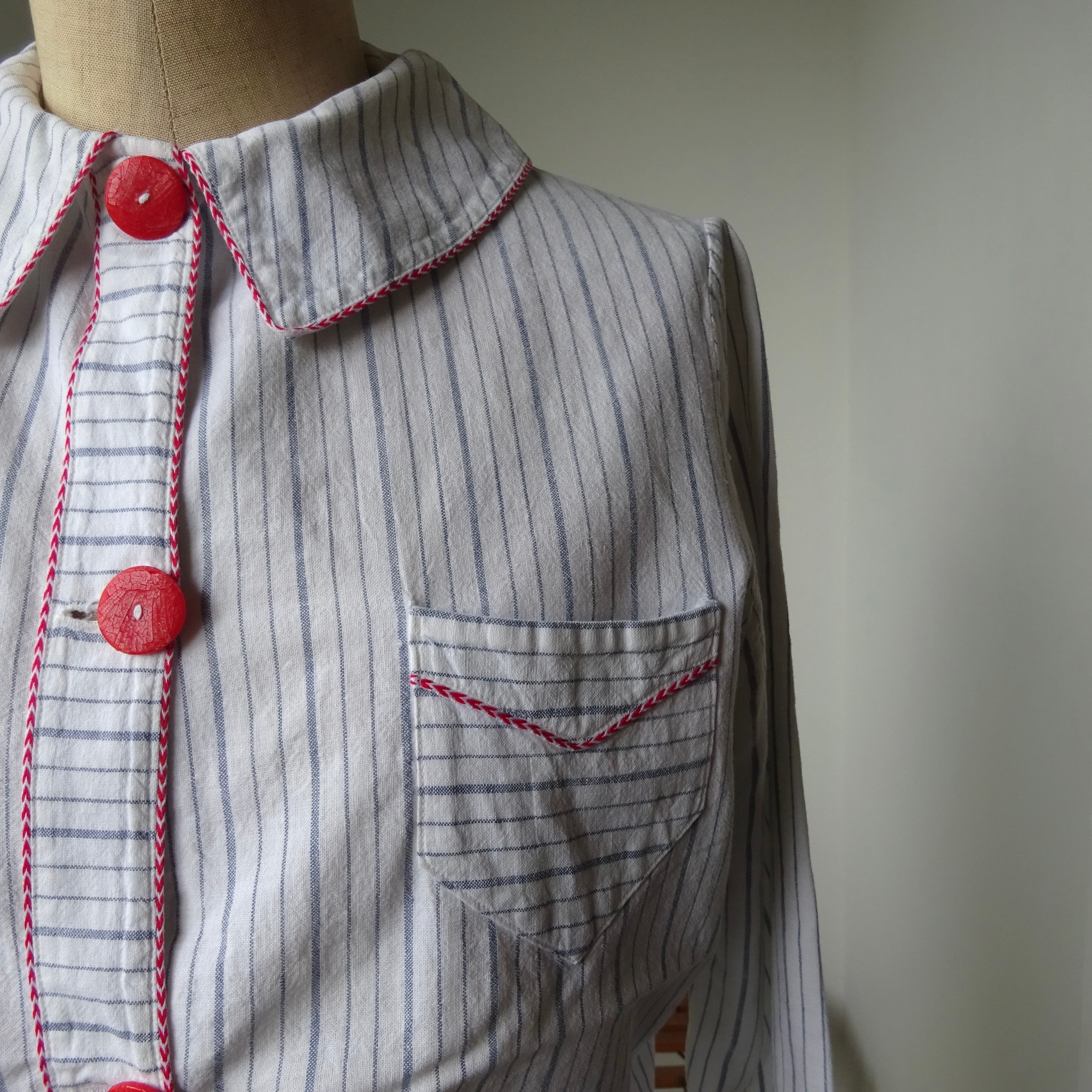 薄めのブルーのストライプに、赤と白のパイピンク、大きな赤い樹脂ボタンも、、