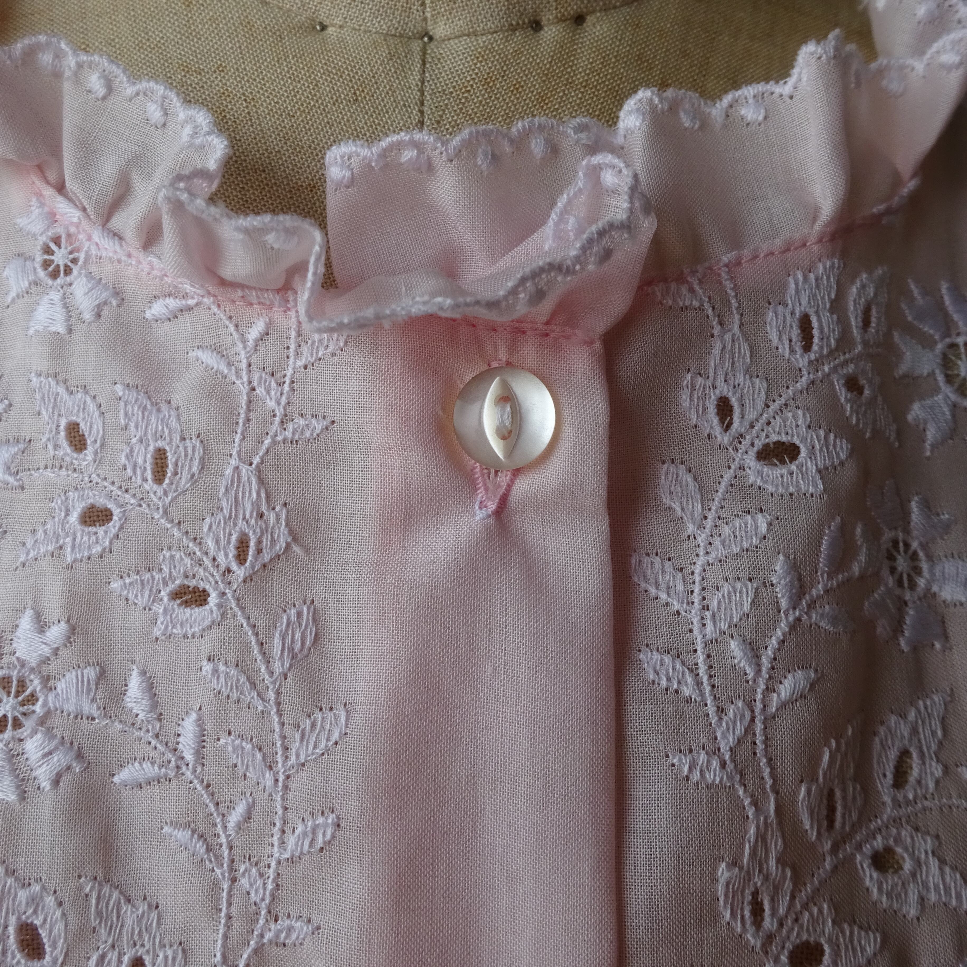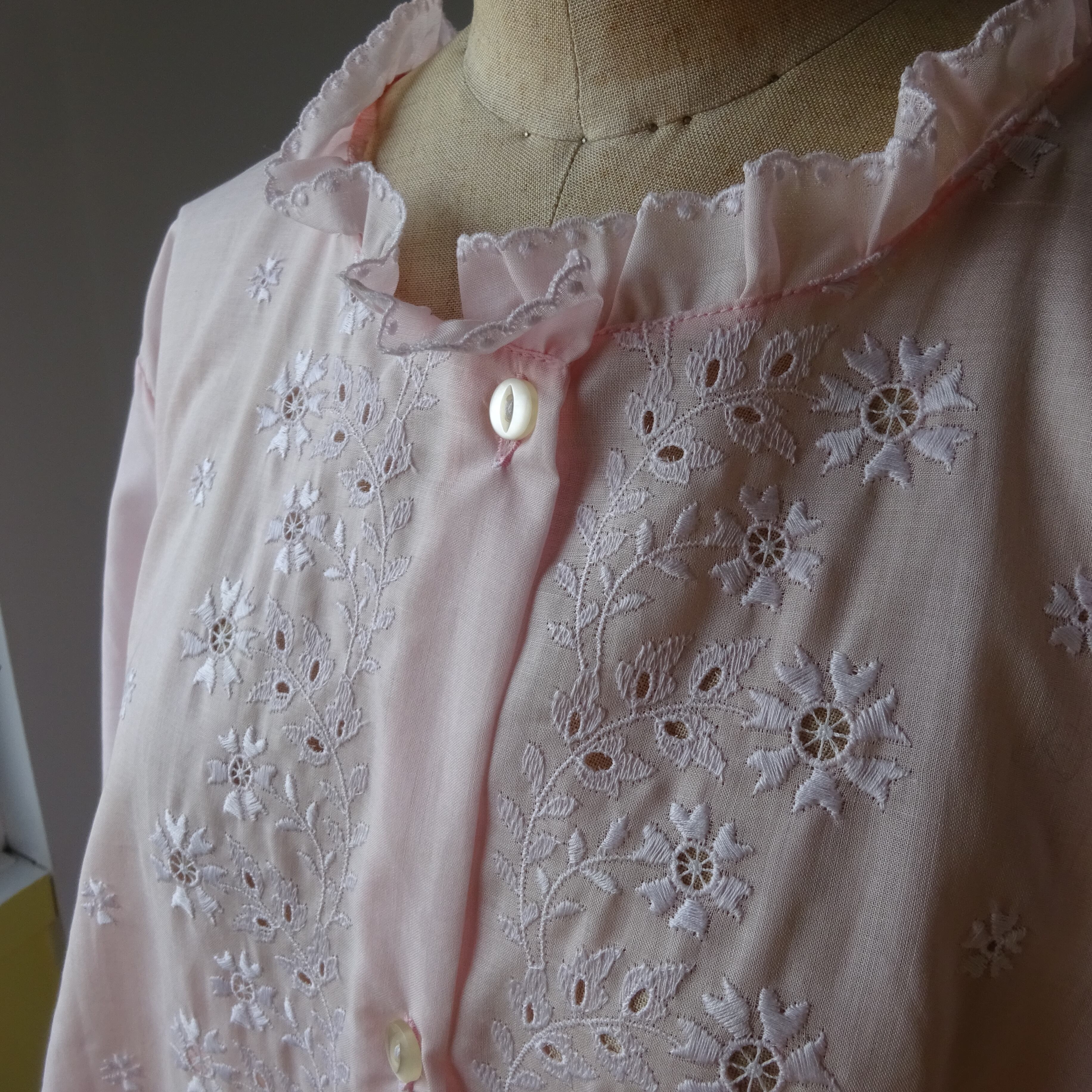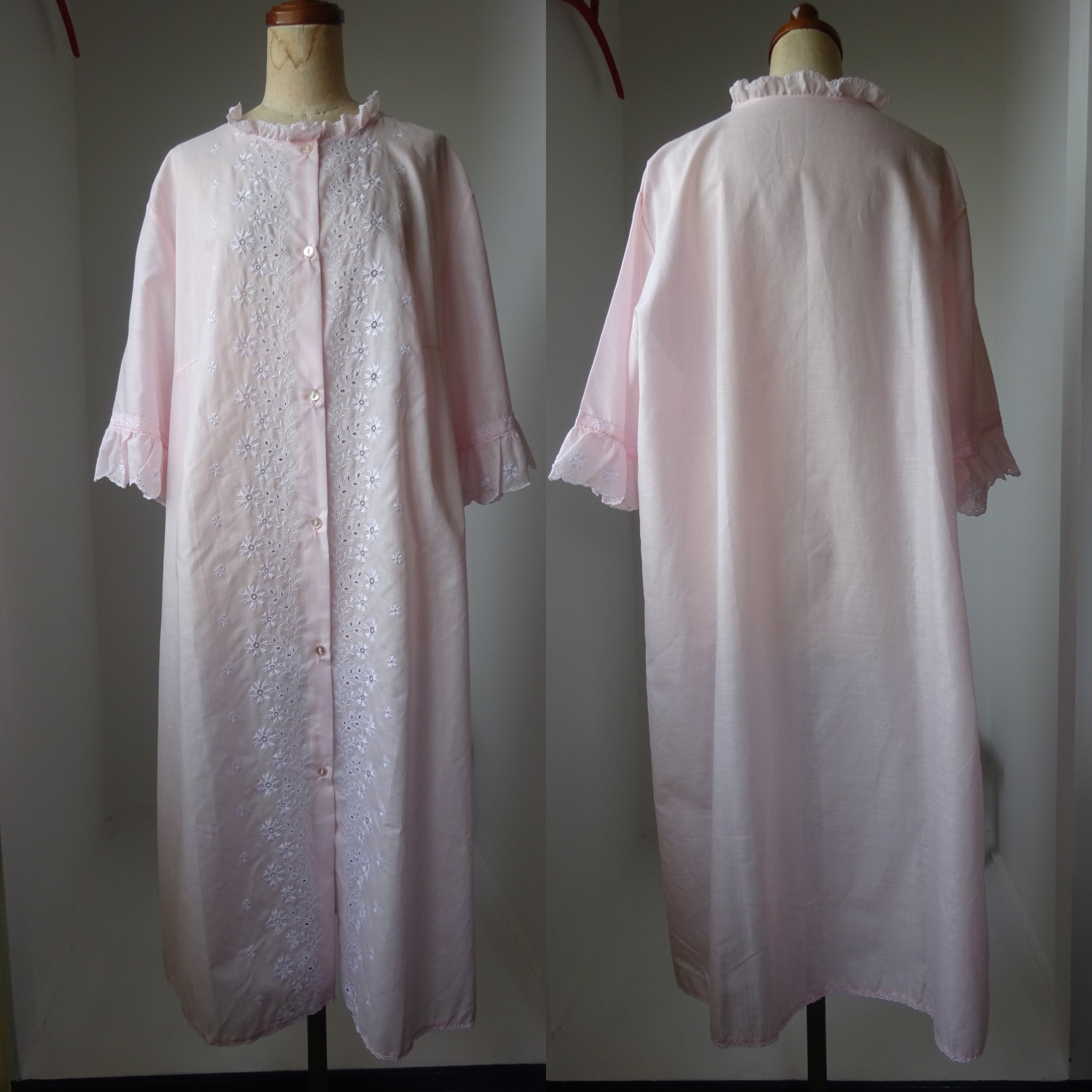 生地と同色の糸で施されている透かしのレース刺繍がとても可愛らしく、羽織タイプなのでガウンのようにしても◎