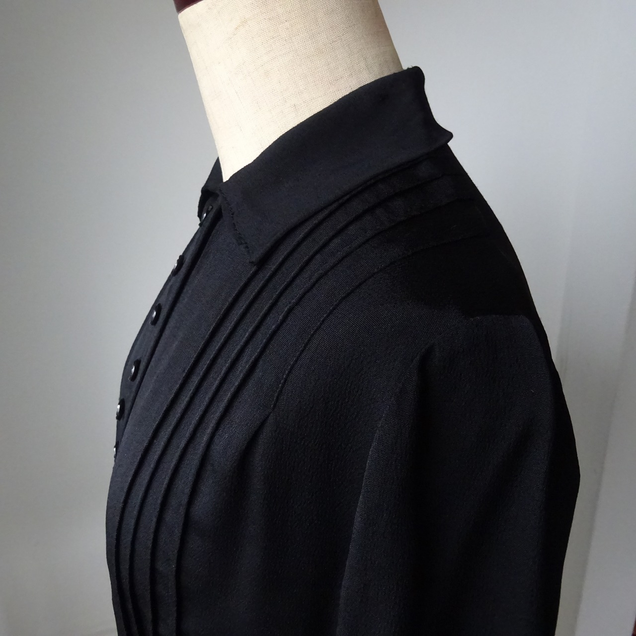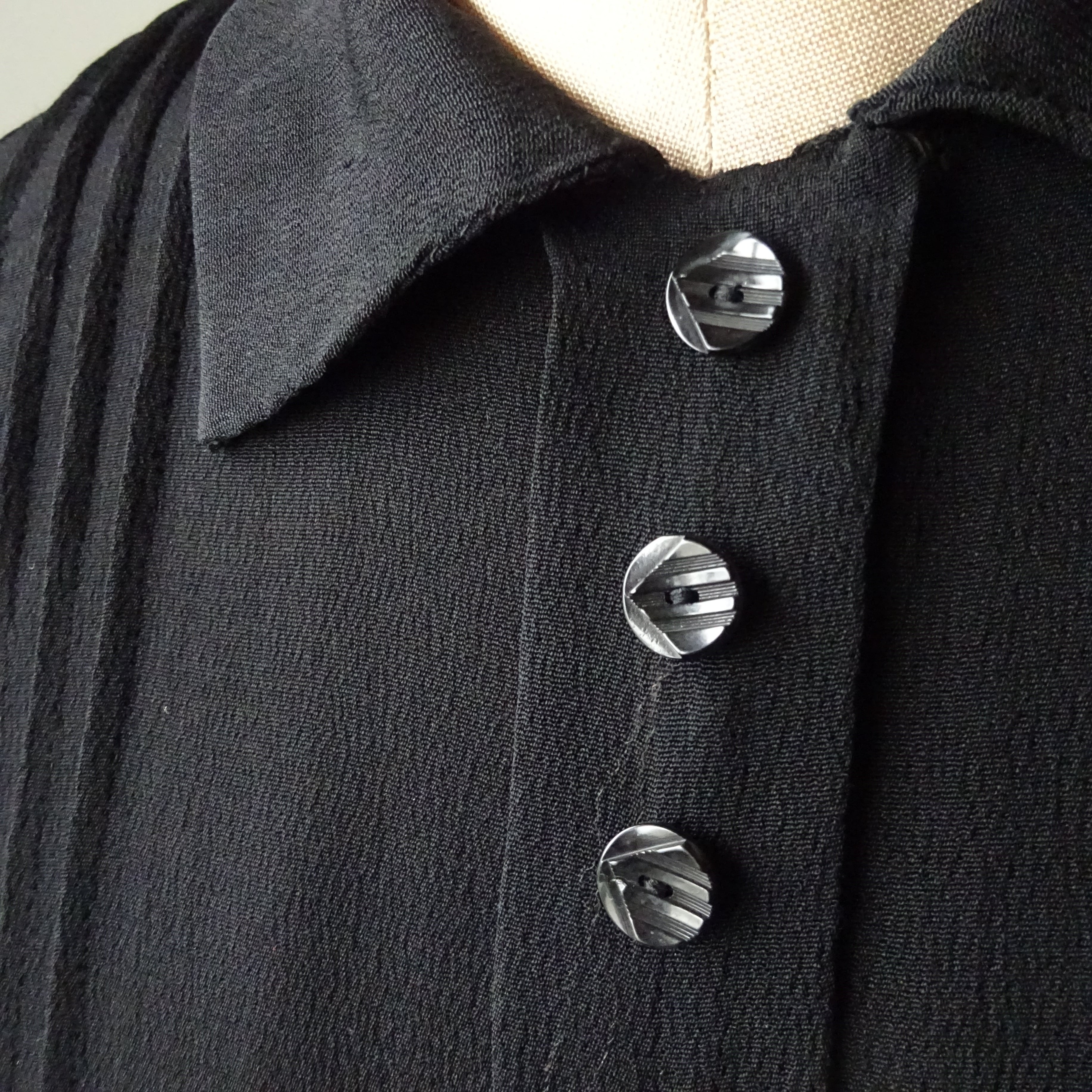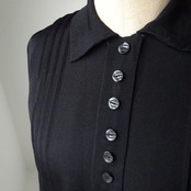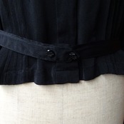 縮緬のようなクレープ素材がとても良い雰囲気を出していて、前館のプリーツやアール・デコなボタン、ウエストのベルトと