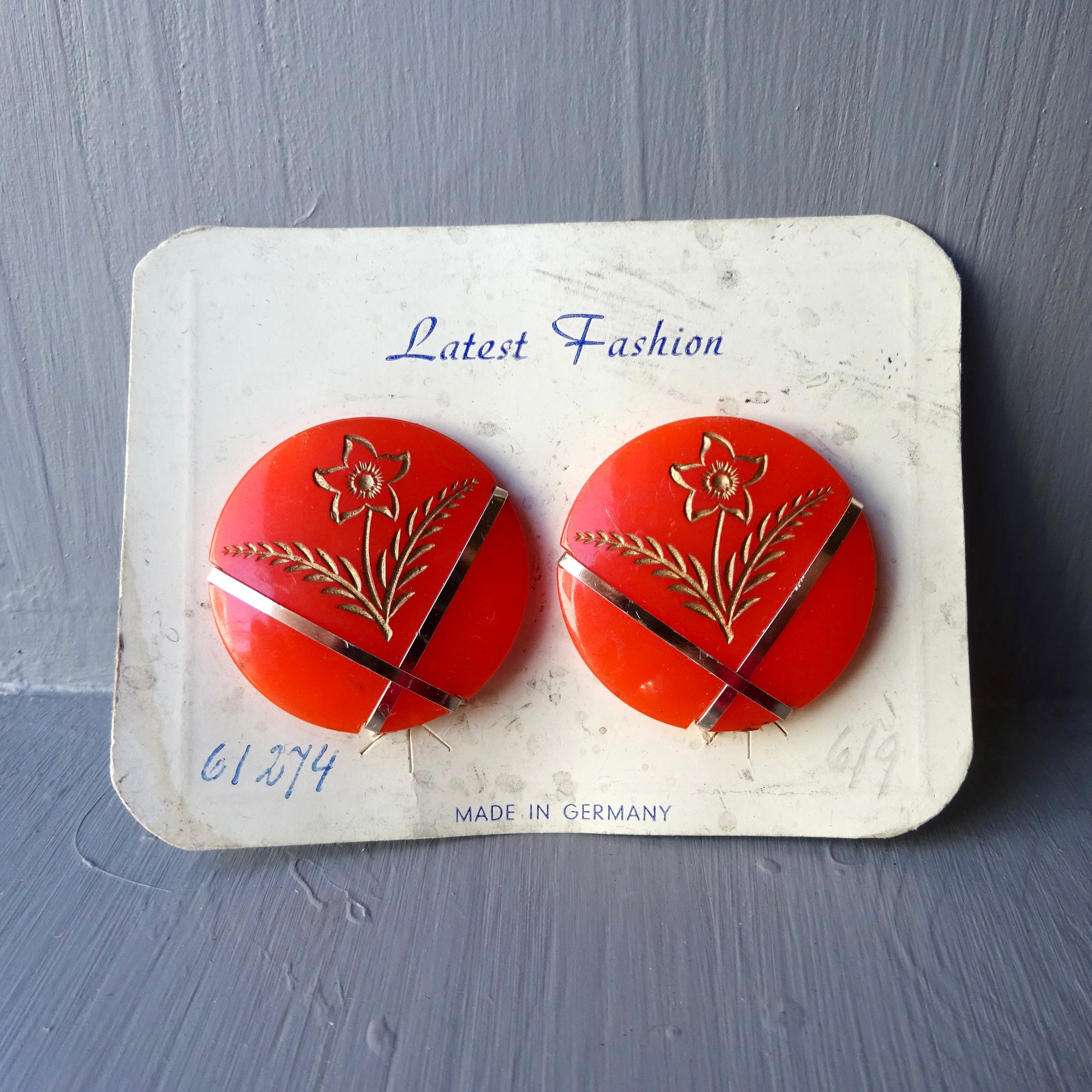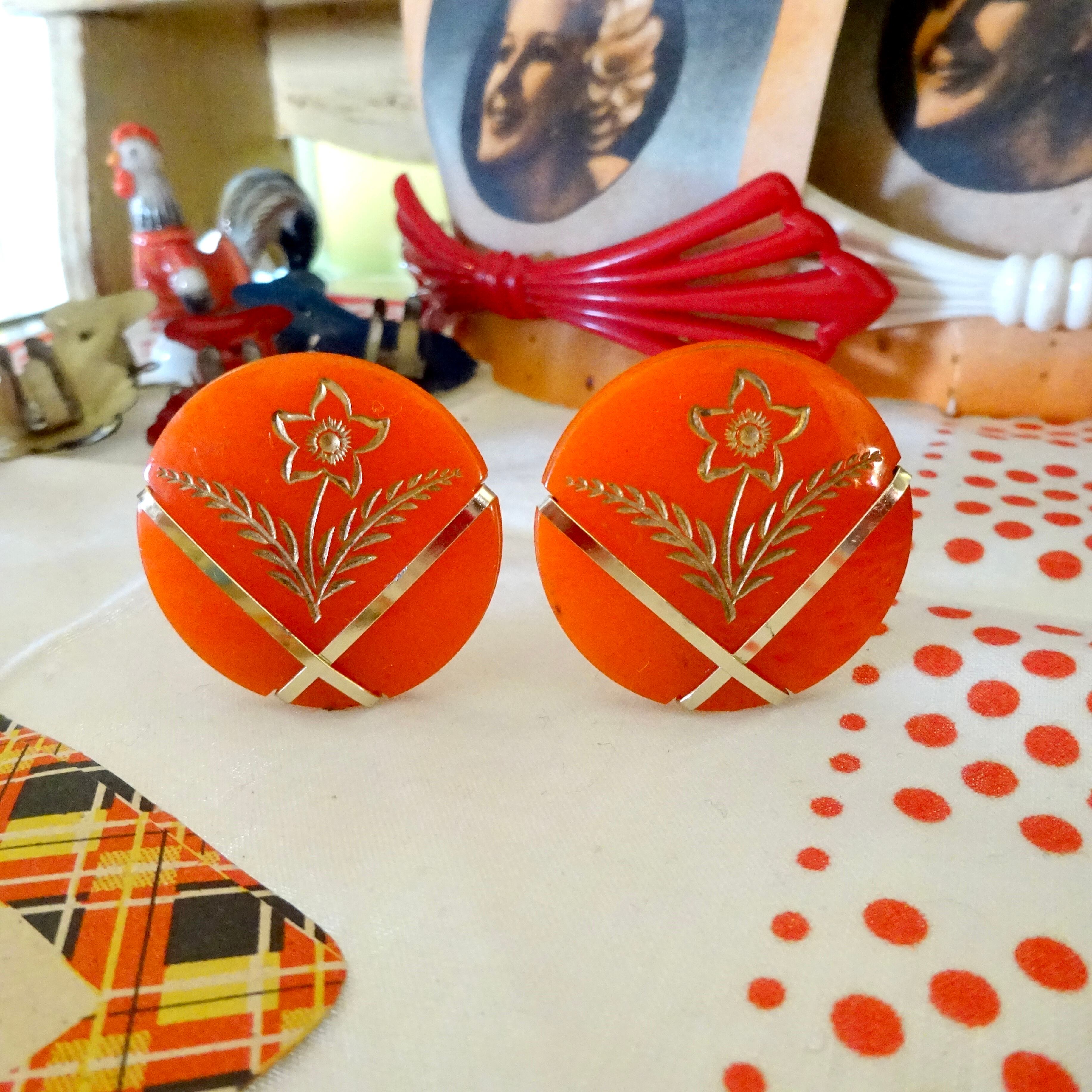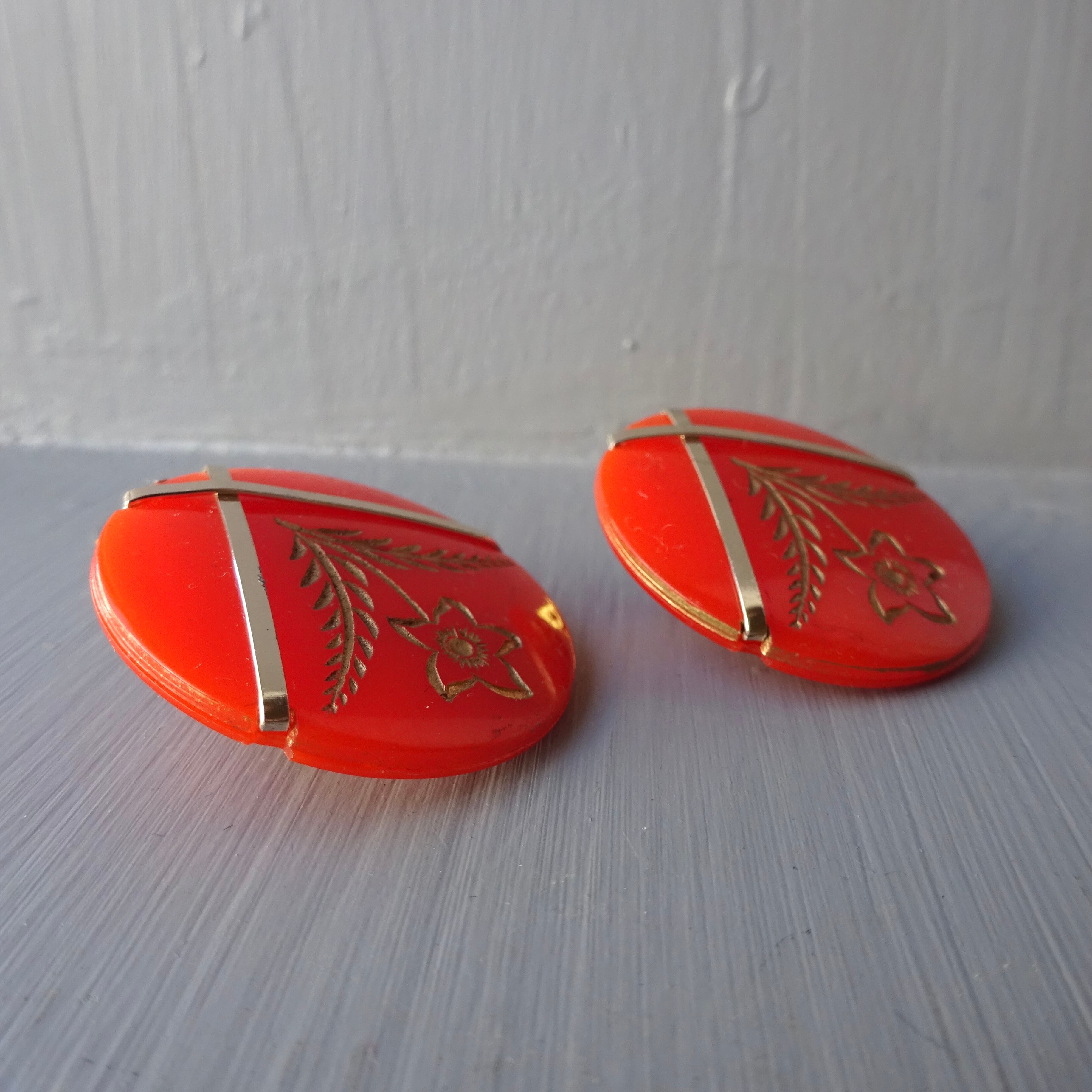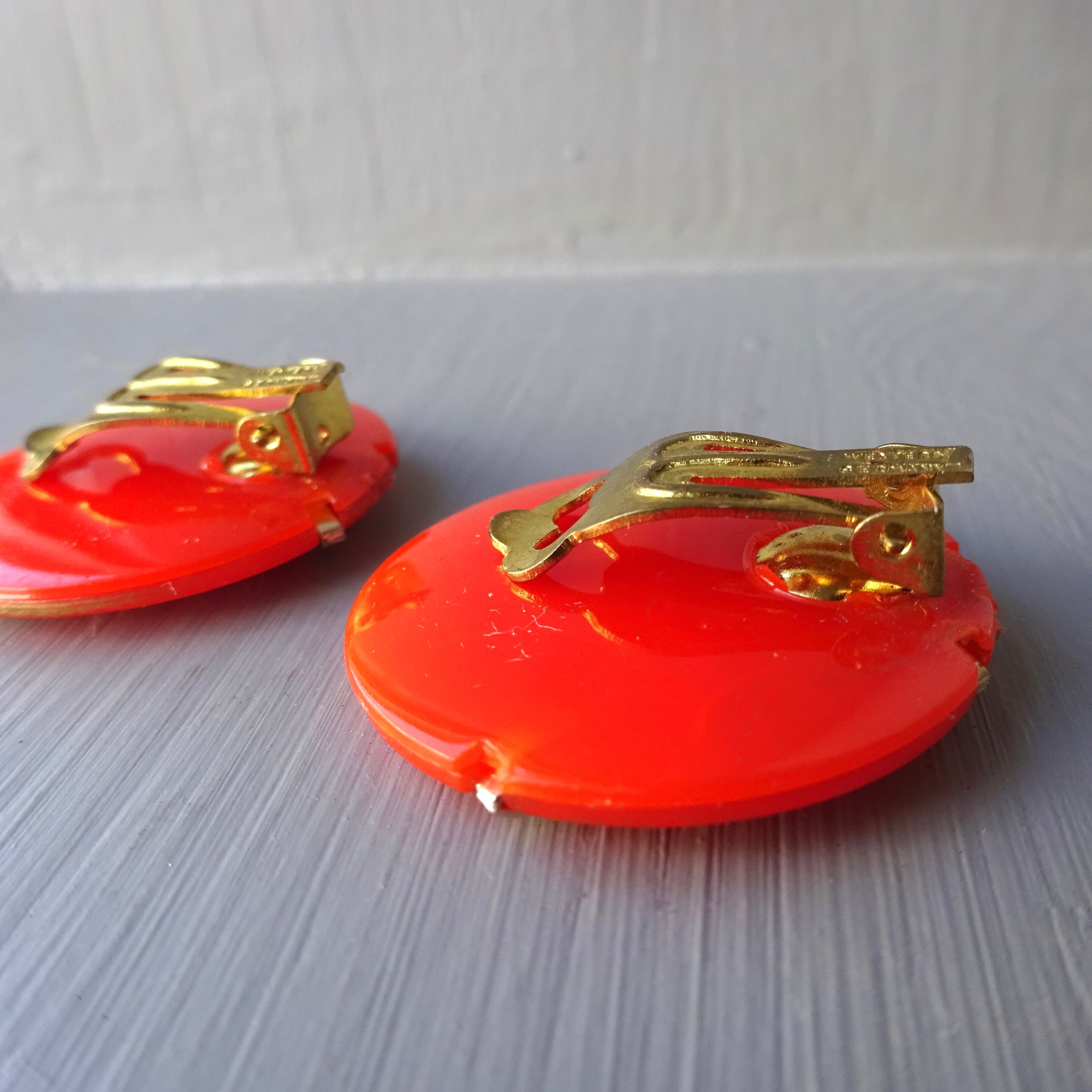 鮮やかなオレンジ色にメタルテープ、光の反射でキラリと光るのがとても印象的で、あまり見かけないデザインのイヤリングです
