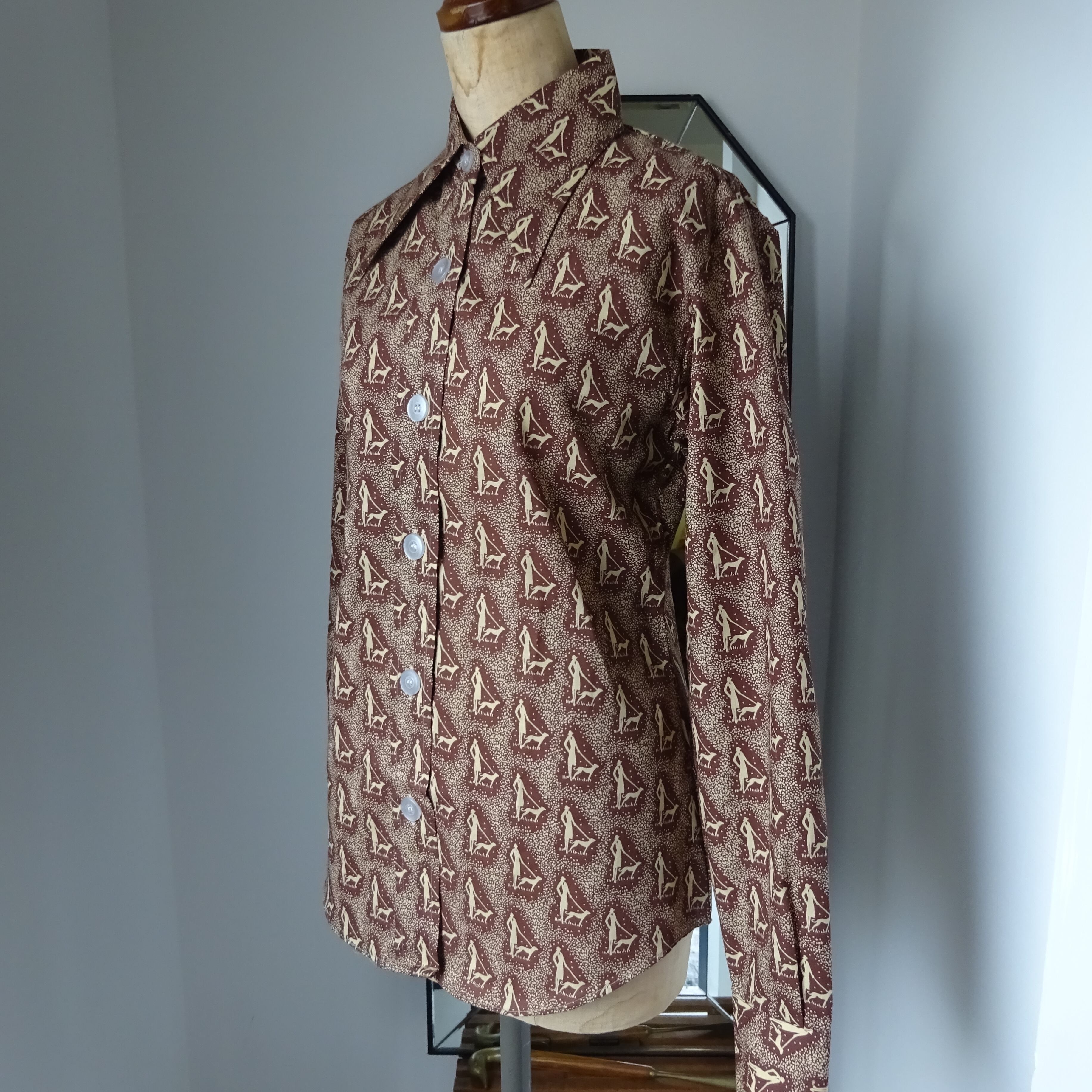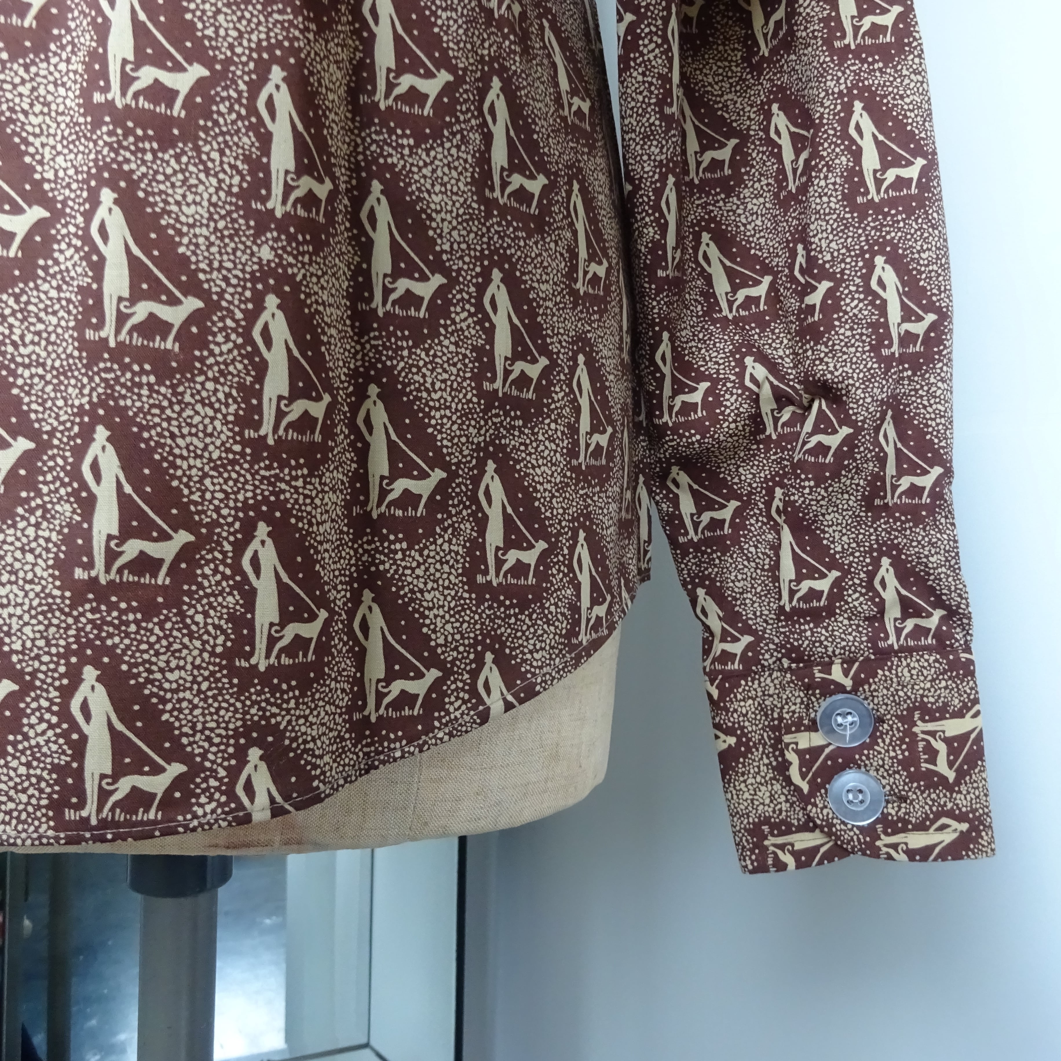 40's チックな貴婦人がいかにもなワンちゃんをお散歩させている柄のシャツ